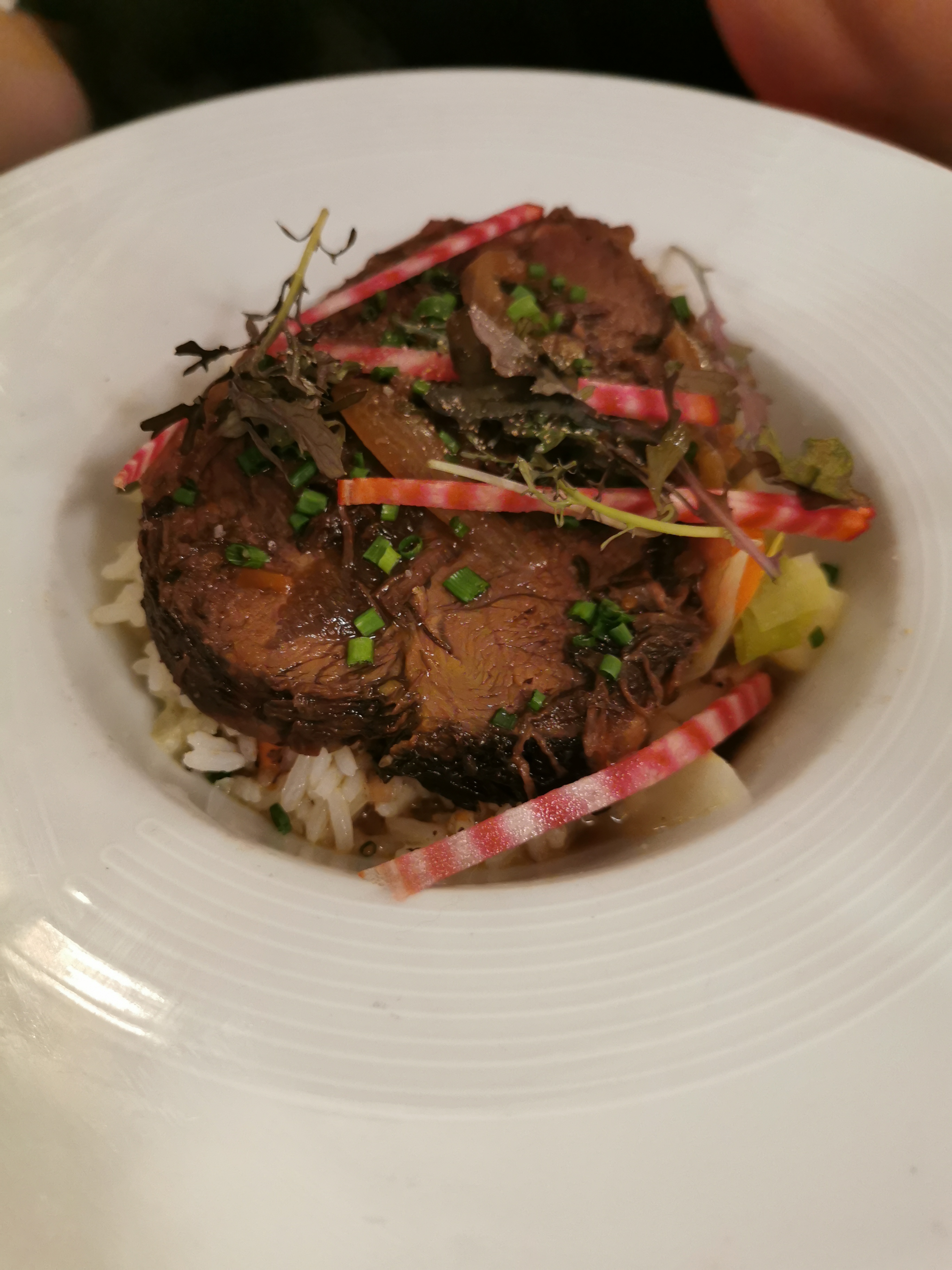 Le serveur bien sympathique. Le rouge proposé pas mal. Le plat était moyen une viande nervee et le sentiment de vouloir tellement bien remplir l'assiette qu il y en avait trop. Sans cohérence dans le plat