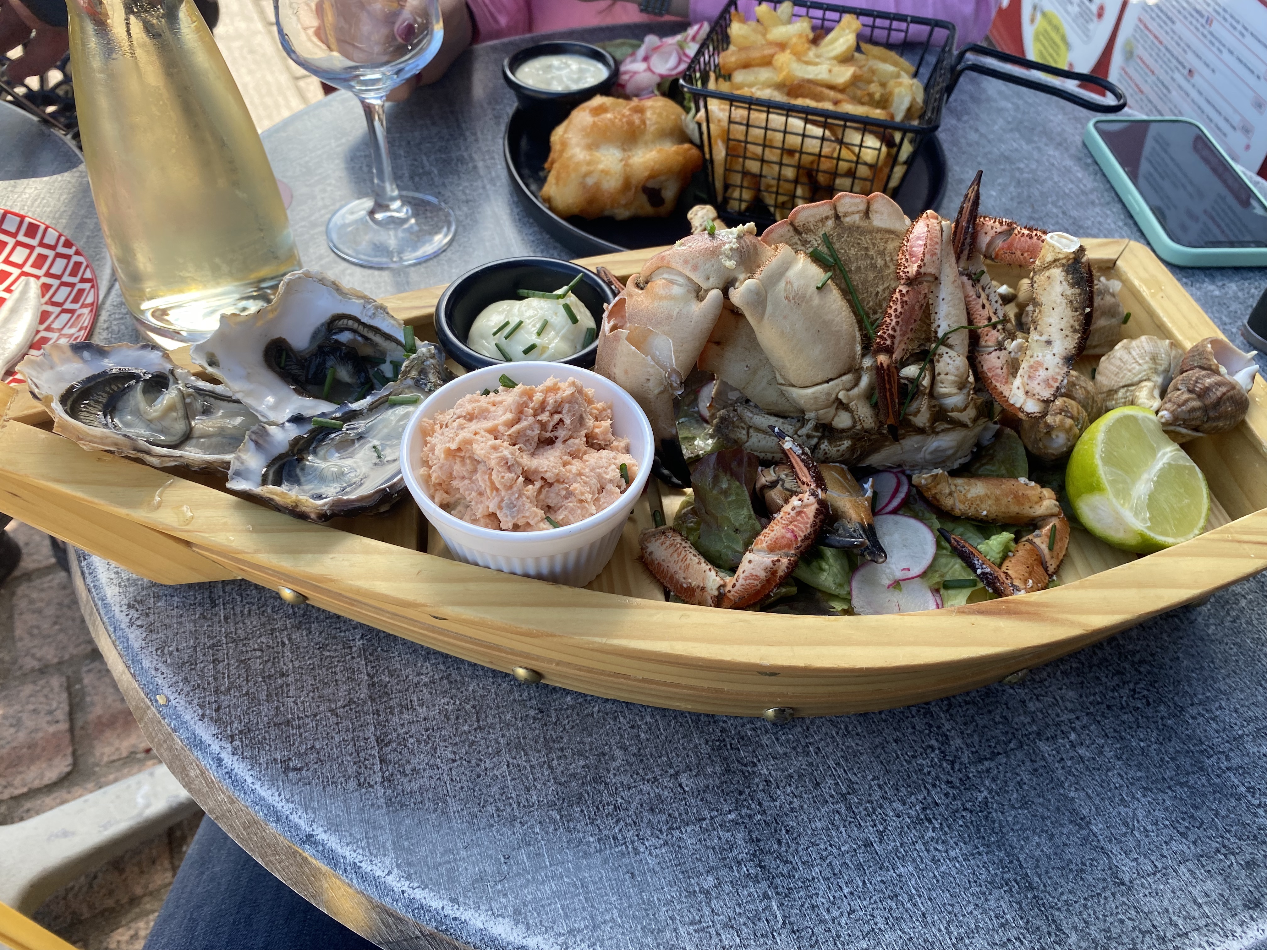Nous avons trouvé ce restaurant sur le port de Cherbourg non loin de la cité de la Mer. Service toute la journée avec de bon petits plats simples et efficaces: burger, moules frites, salades, desserts etc… Nous avons prit des moules frites sauce fromagère et ma collègue sauce crème puis en dessert un thé gourmand avec plusieurs saveurs de thé (petit bémol pour l’assortiment de gâteau un peu sec et pas très savoureux), crêpes au spéculos avec glaces spéculos et pomme mais j’aurais plus dis poire et un entremets au chocolat et praliné. Nous avons bien mangé, merci ☺️