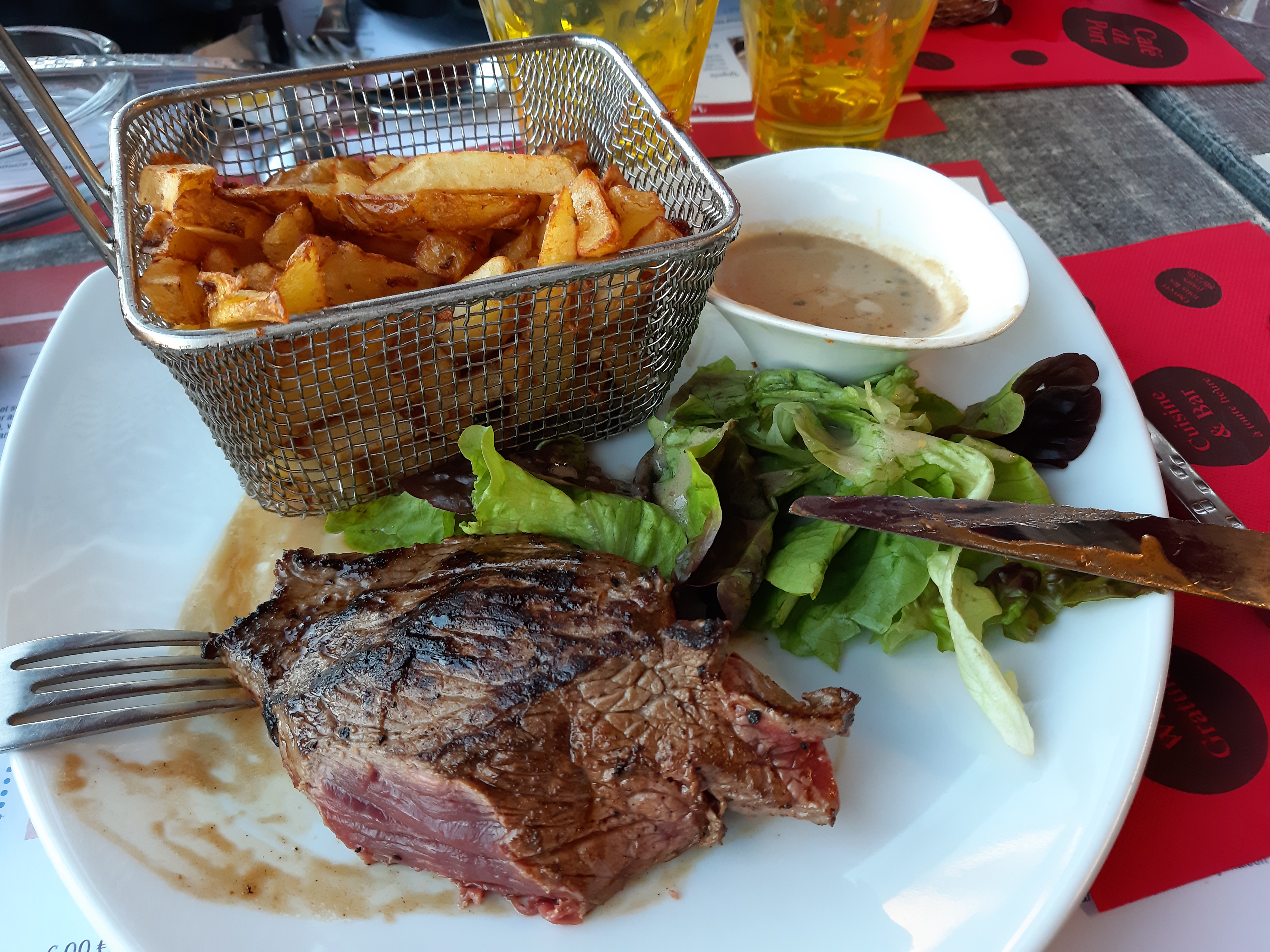 Super accueil, nous sommes venus avec notre chien d’ailleurs la première servi avec une gamelle deau très agréable. Le repas était très bon moules frite sauce camembert en point d’amélioration je dirais augmenter la quantité de camembert dans la sauce ça manque un peu de goût. Le serveurs et sa collègue très agréable. Vue sur le port très agréable je recommande ! Je reviendrai 😉