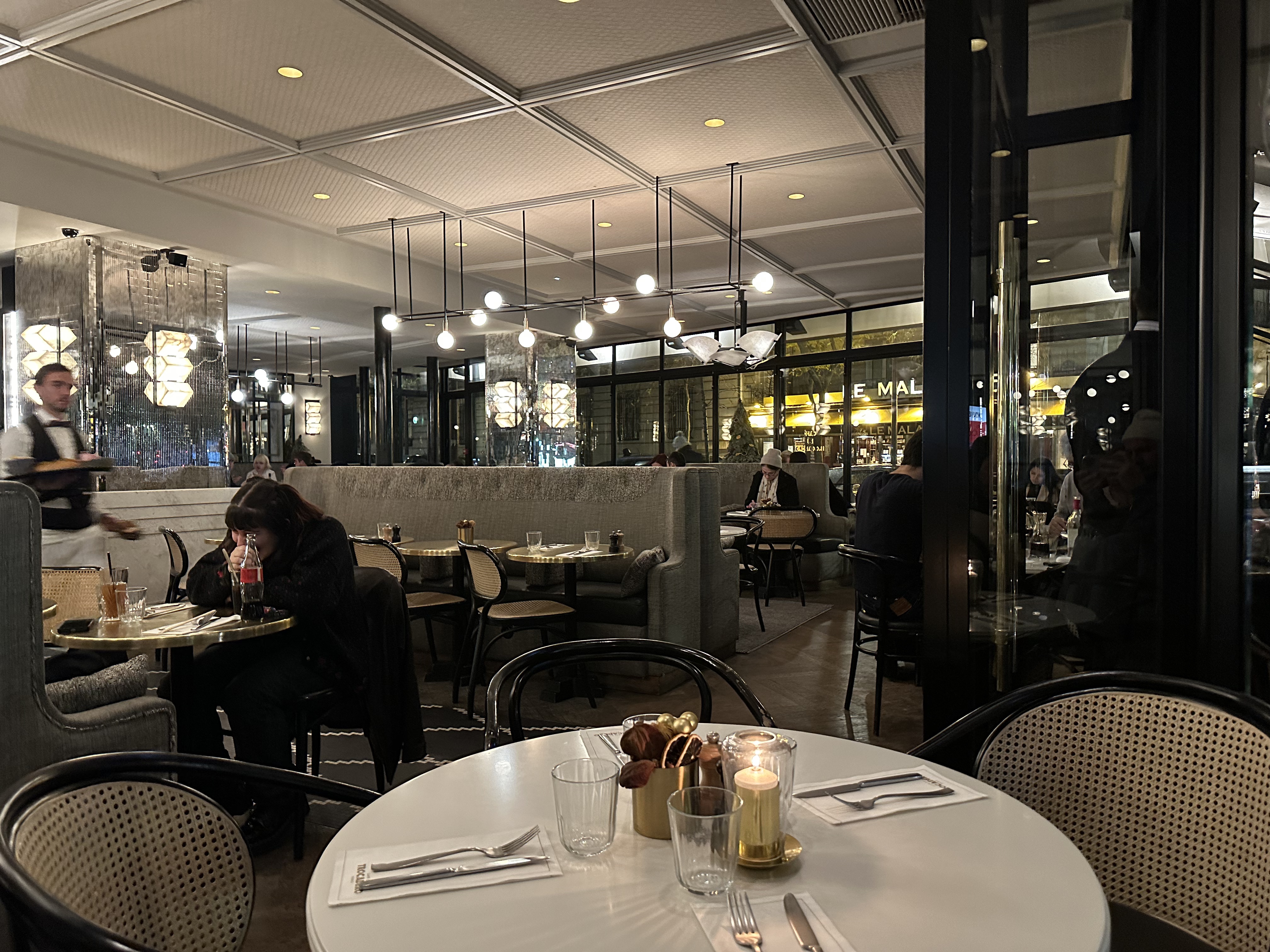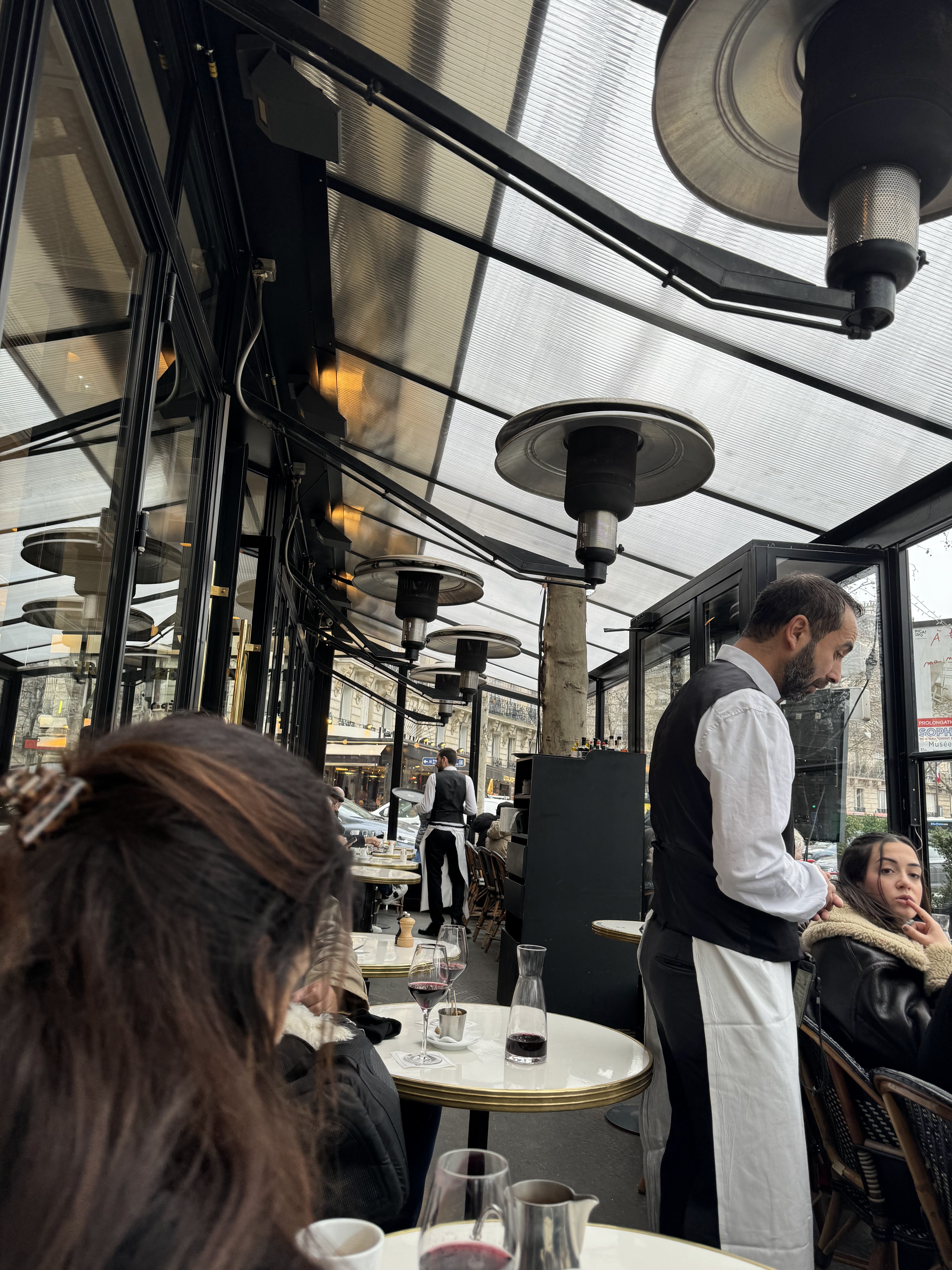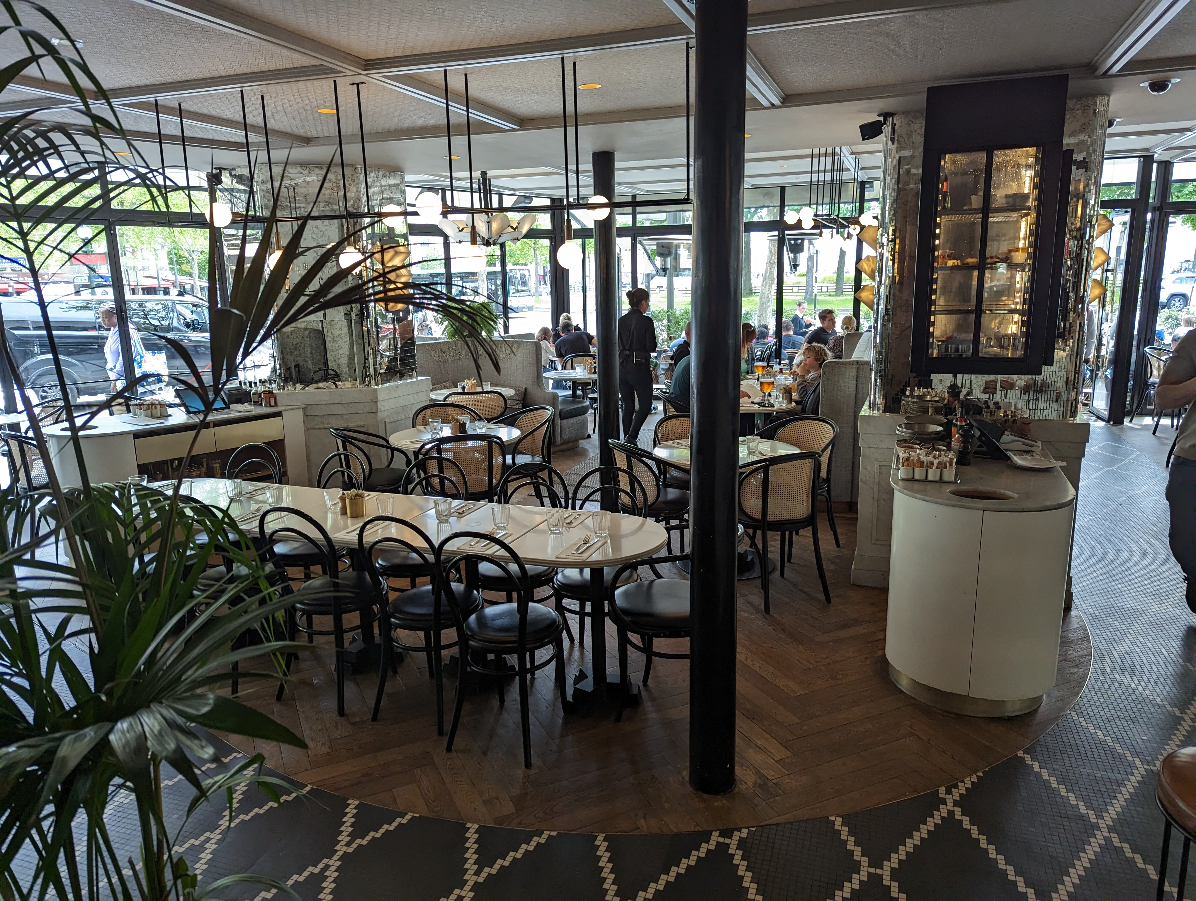 C’est vrai que c’est une brasserie typiquement parisienne... avec des serveurs sympas! Ça fait du bien. La qualité des plats servis est vraiment très bonne, les salades aussi. Les plats et entrées font entre 20 et 30 euros, et tout ce que j’ai goûté était très bon. Le plateau de desserts est appétissant... L’endroit est vraiment mignon et les toilettes propres.