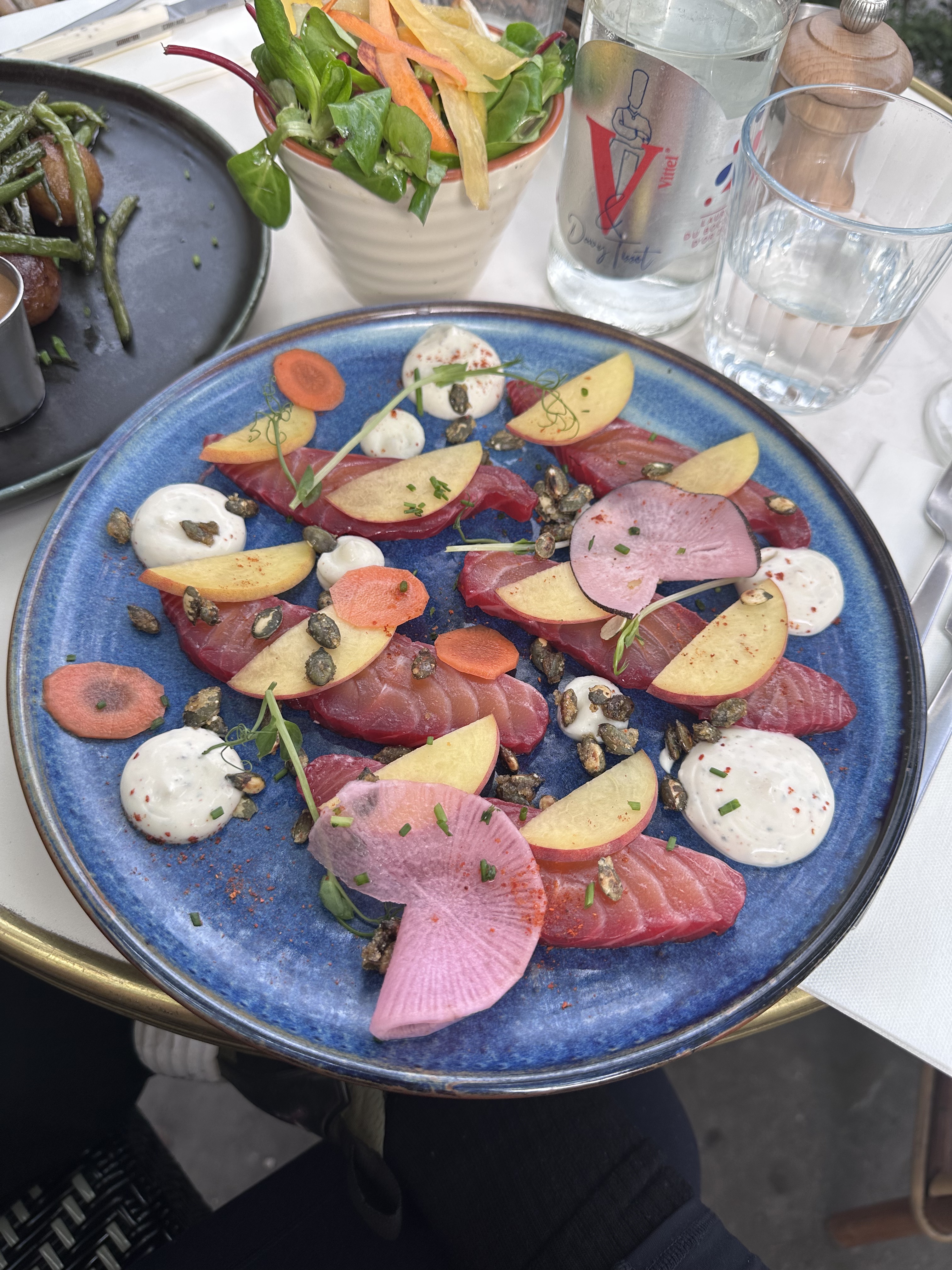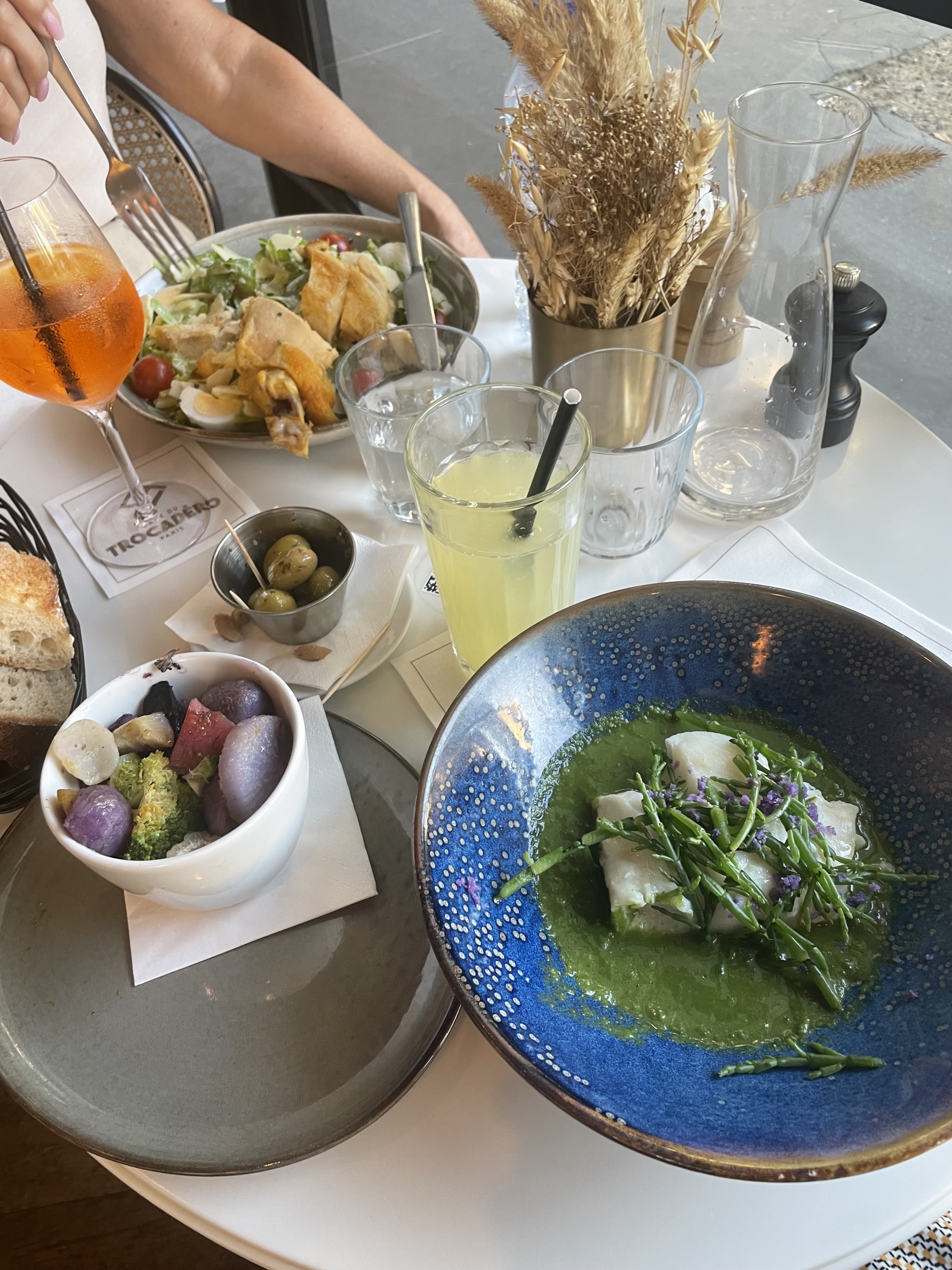 En fait, j’évite généralement les lieux touristiques typiques comme ceux-ci ou tout autre établissement très tendance. En partie parce que je les trouve confus dans l'aspect quantité plutôt que qualité… Inutile de dire que cet endroit était la vraie affaire, avec une vue imprenable sur la Tour Eiffel et dans un quartier animé et animé qui regarde les gens. Je reviendrais certainement pour l'énergie et l'expérience à nouveau ! Le prix est élevé pour le déjeuner, c'est sûr, mais vous êtes à Paris et pouvez regarder la Tour Eiffel pendant des heures. La nourriture était étonnamment bien préparée et fraîche, du moins pour ce que nous avions et nous mourions vraiment d'envie de quelque chose de vert et entier après avoir passé une semaine à manger de la cuisine française et apparemment pas assez de légumes. Le menu en propose pour tous les goûts, notamment de superbes salades et des boissons vertes. Tout semblait vraiment frais.