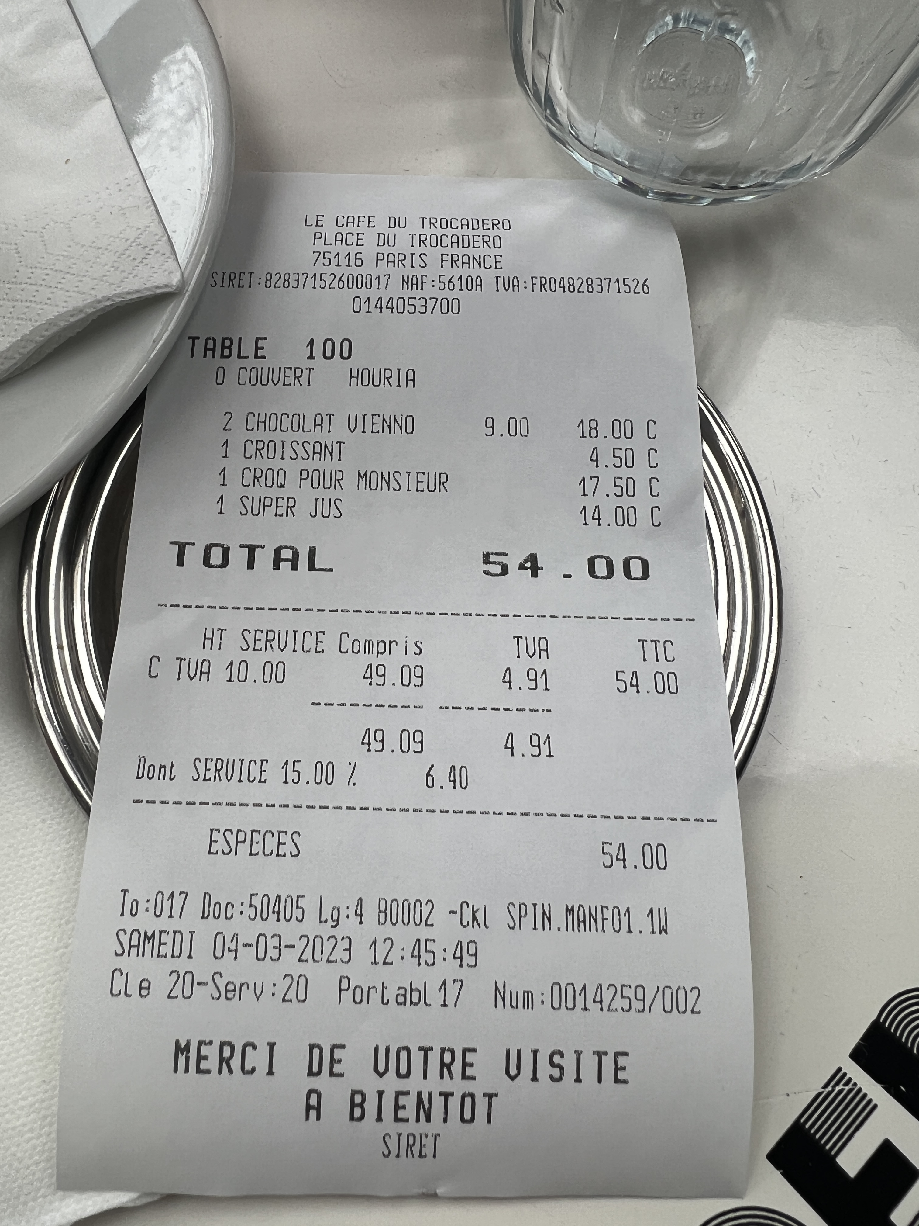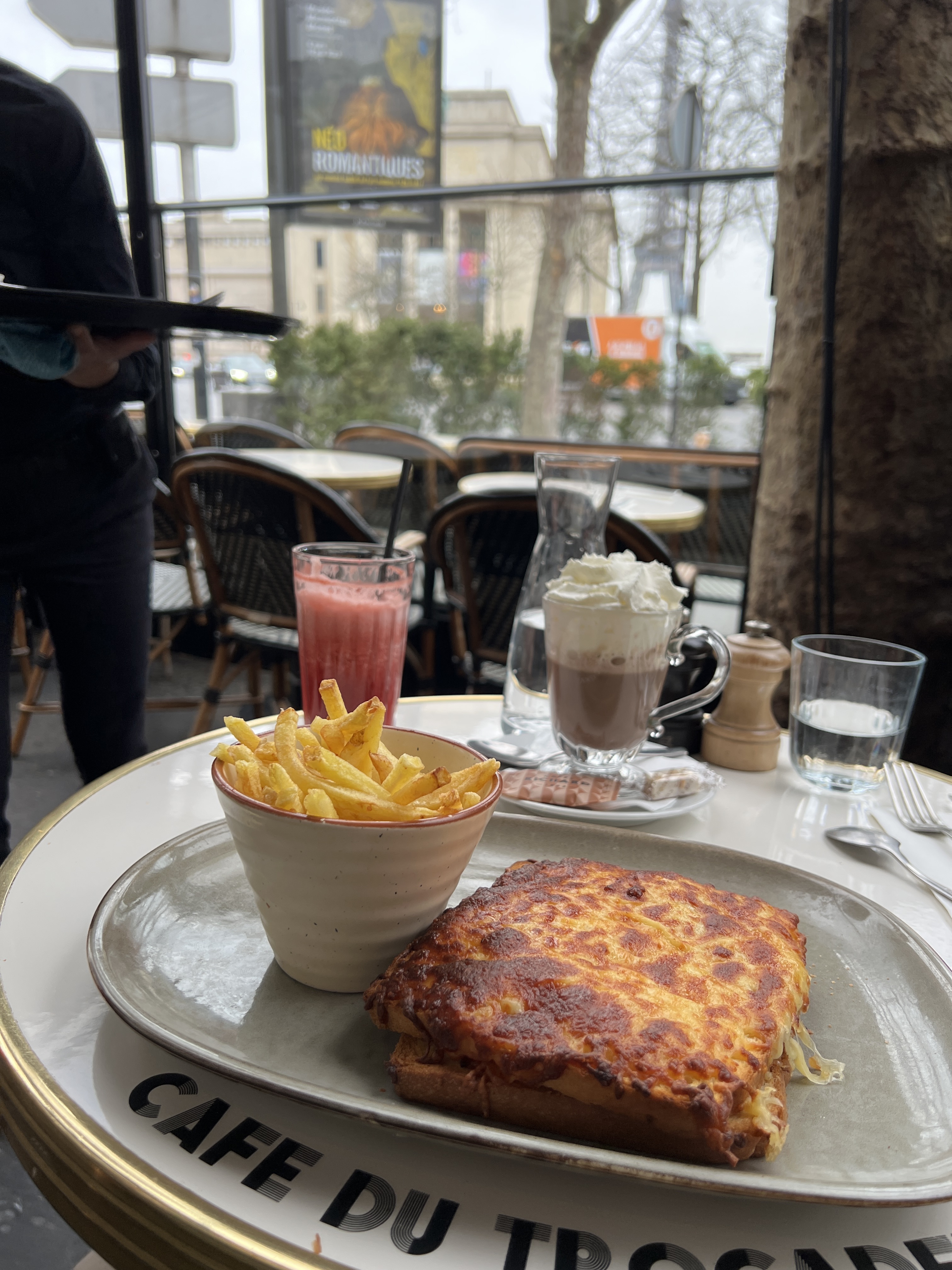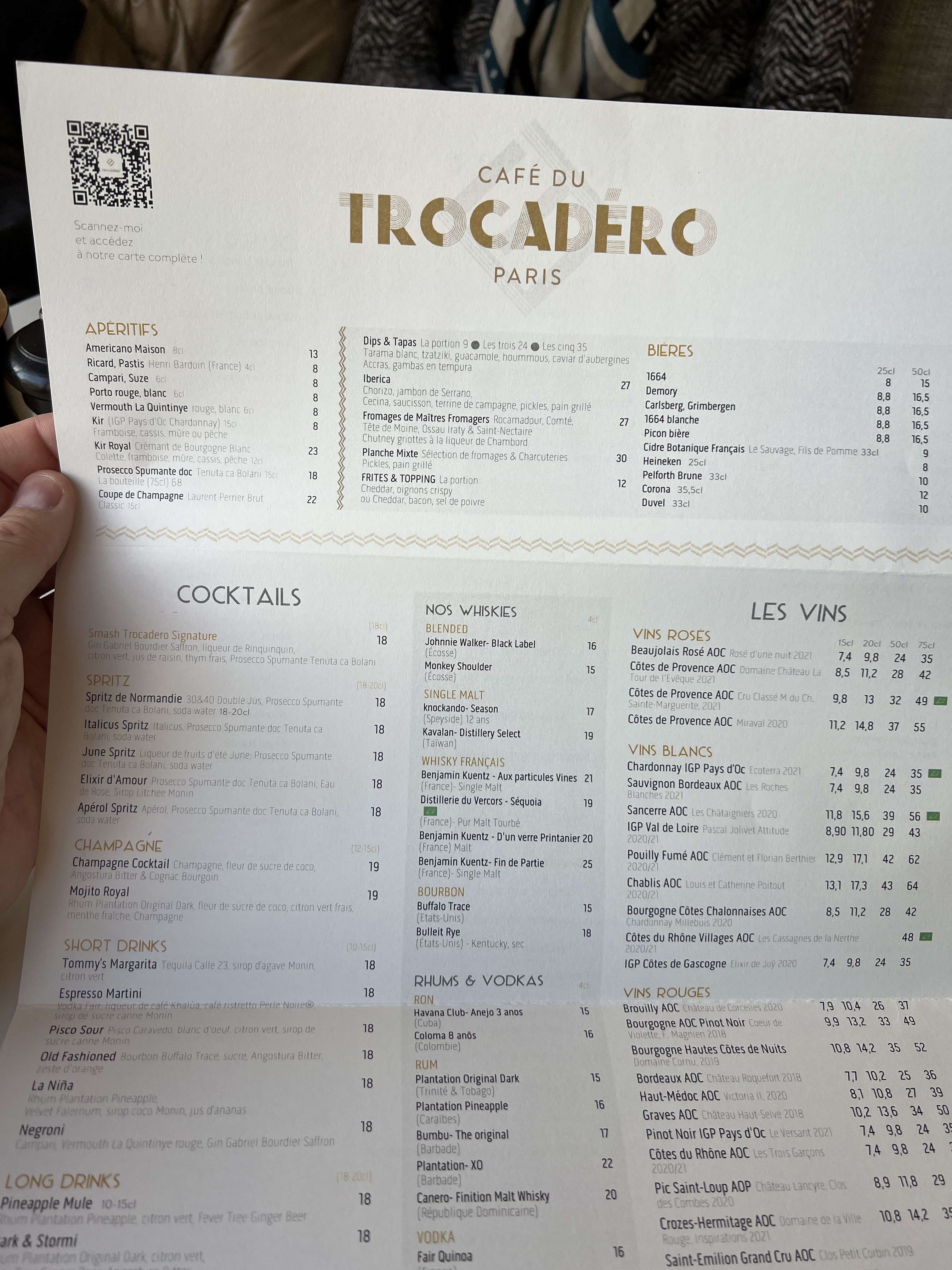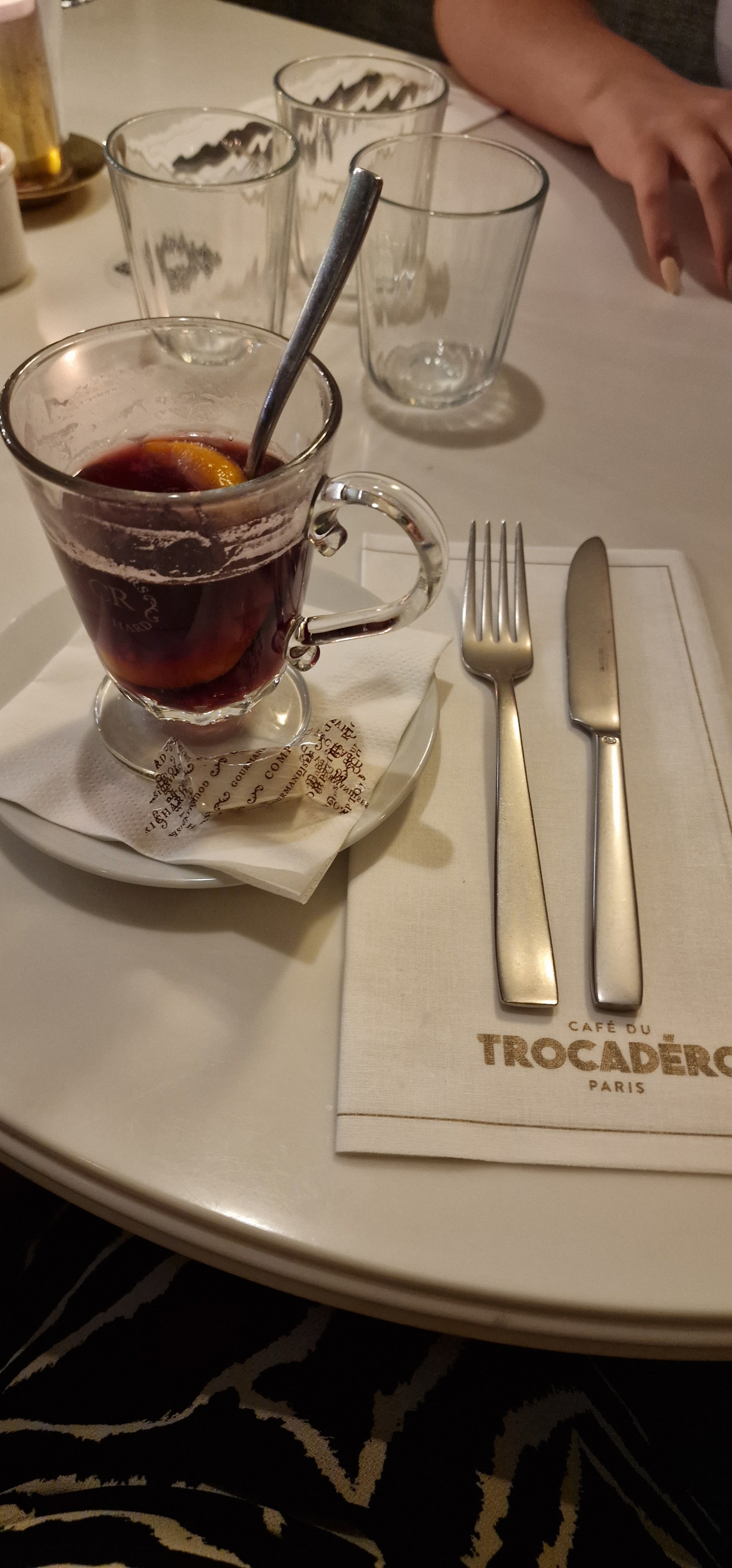 Nous étions au Café du Trocadéro le 8 octobre 2022 un samedi soir, donc c'était plein ! Et nous avons attendu environ 20 minutes pour nous asseoir, le service était bon serveur très poli, les prix sont ridiculement élevés j'ai payé plus de 50 euros pour un chocolat chaud, du thé et deux expressos avec des petites pâtisseries, 8 euros pour un chocolat chaud ! Le chocolat était délicieux mais totalement trop cher, oh ! nous avons eu un côté de crêpes. Leurs toilettes étaient sales cependant, ils ont besoin de garder une personne sur leur liste de paie pour que quelqu'un puisse garder leurs toilettes propres, allez Paris !