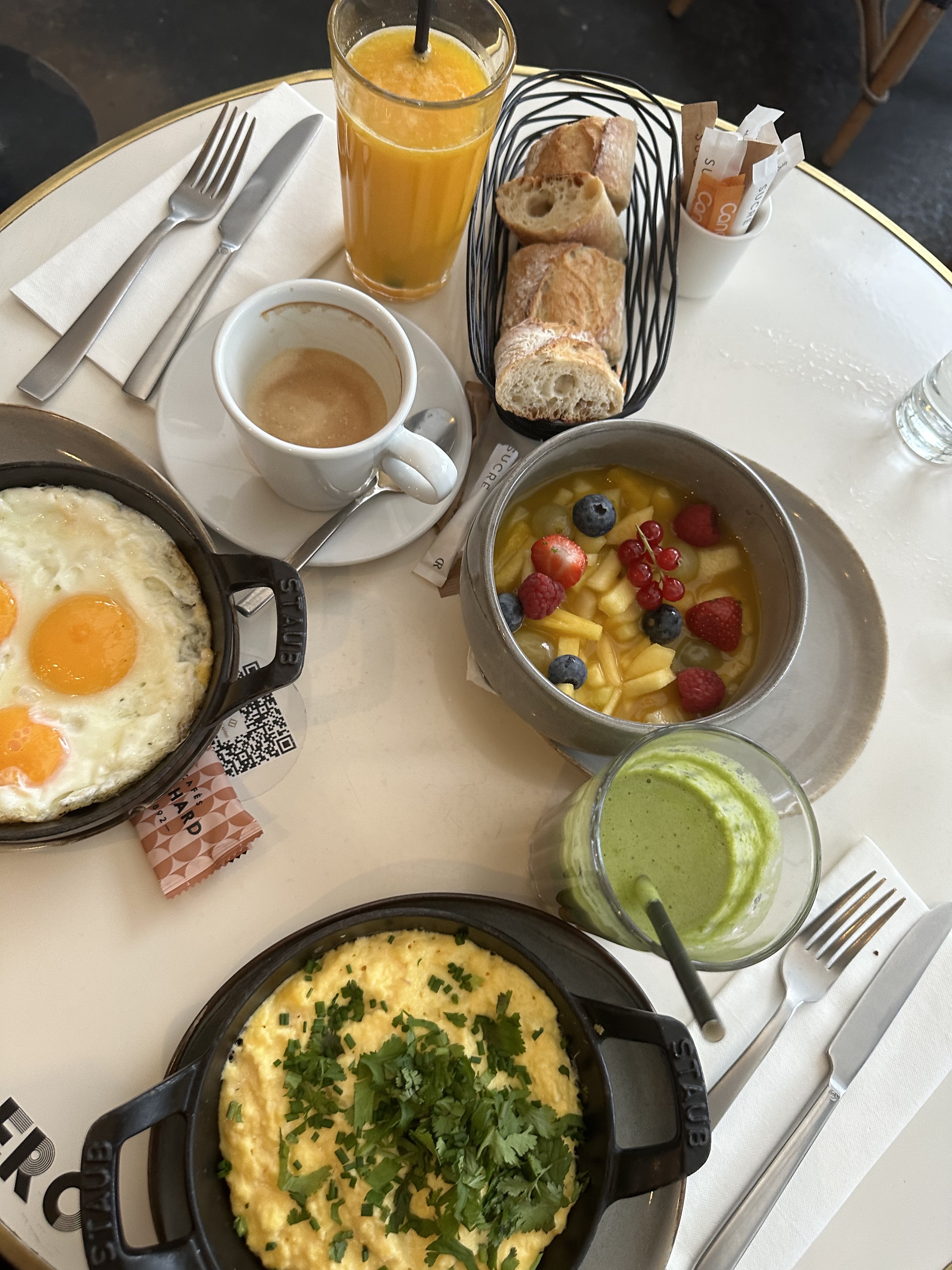 Mon premier atterrissage de croissant à Paris avec vue sur la Tour Eiffel l'a rendu très spécial, incroyablement léger et moelleux, j'ai aussi eu le toast à l'avocat et la salade avec un œuf à la coque parfait, mon mari a pris l'omelette. Une belle étape avant de visiter la Tour Eiffel.