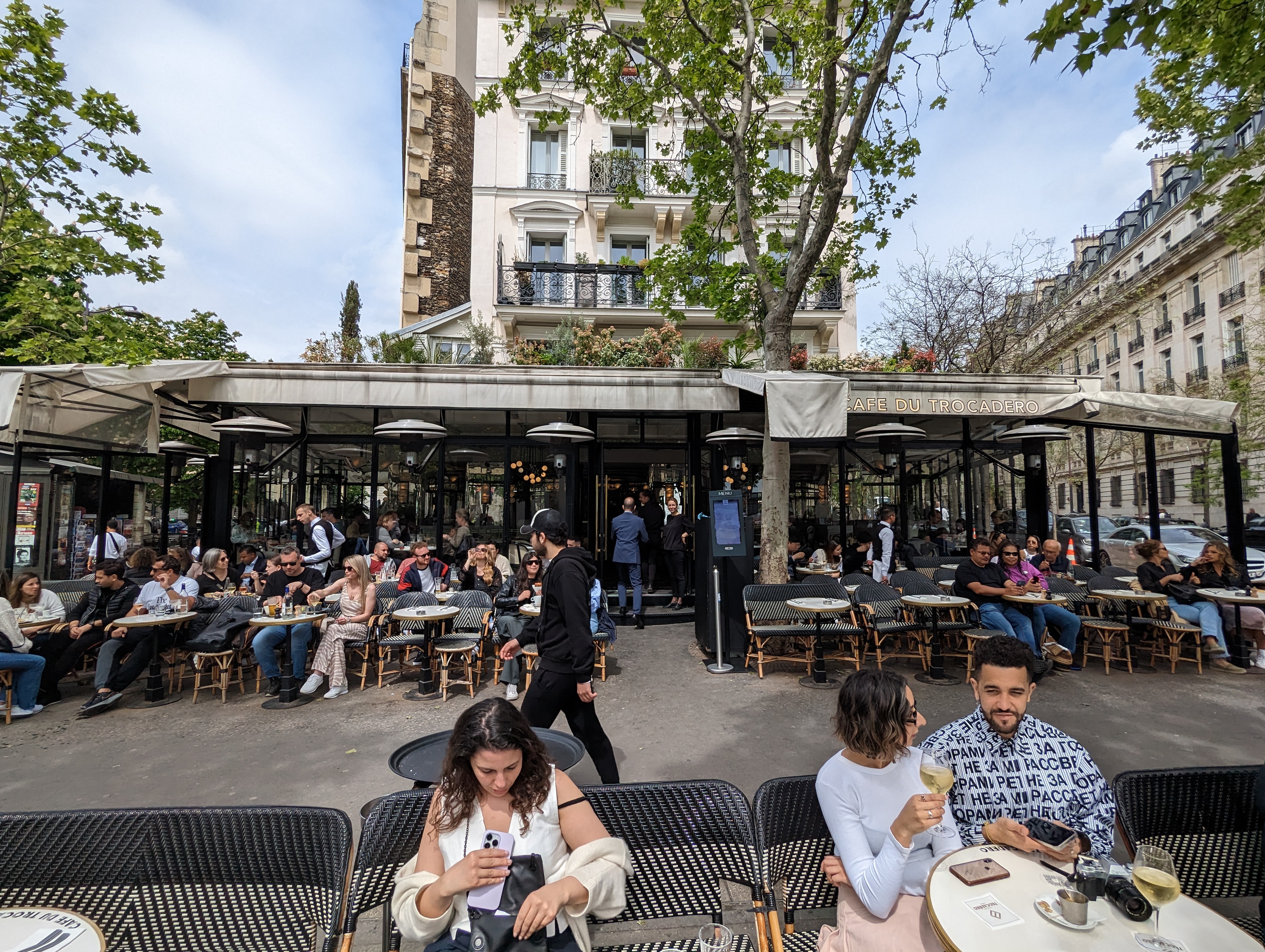 Une belle vue, une superbe terrasse, des serveurs attentionnés, bref l'archétype du café Parisien. On reste quand même au Trocadéro et dans un des quartiers les plus chics de Paris, évidement les prix s'en ressentent ( 7 euros le café croissant en terrasse) mais ne sont pas trop abusifs pour l'endroit. On y passe quand même un bon moment et les produits sont excellents.
