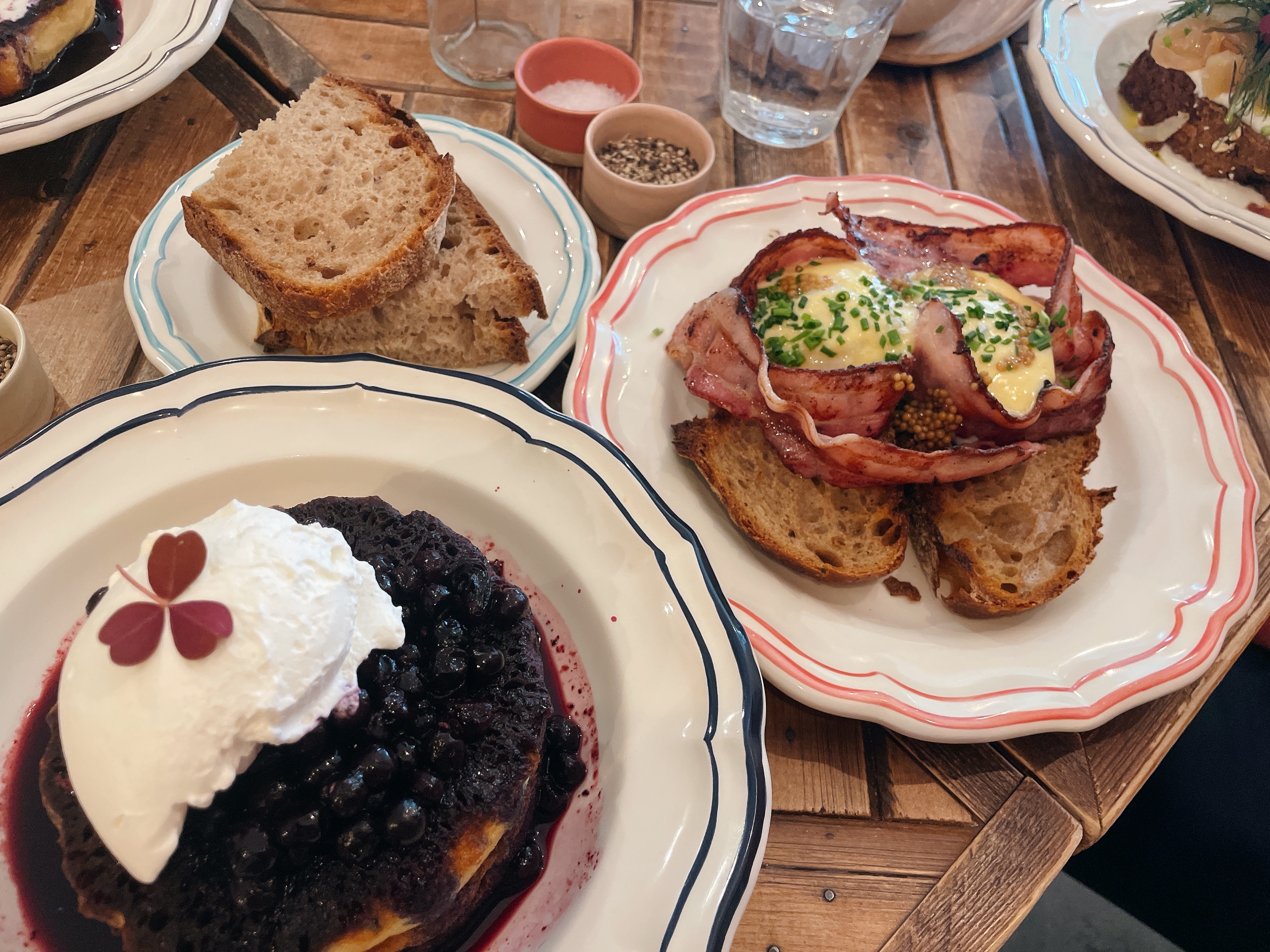 Un brunch vraiment savoureux. Nous avons tellement aimé le rouleau de saucisses que nous reviendrons peut-être juste pour ça la prochaine fois. La sauce est à tomber par terre. Réservation recommandée. Un peu chaleureux près de la cuisine mais déco très mignonne. Les pancakes sont moelleux mais définitivement différents des pancakes américains, mais dans le bon sens. C'est plus texturé et pâteux, ce que j'ai beaucoup aimé. Les prix sont excellents, les portions sont normales (mais pas de taille américaine bien sûr), j'adorerais revenir. J'ai eu le fameux gâteau aux carottes pour aller miam.