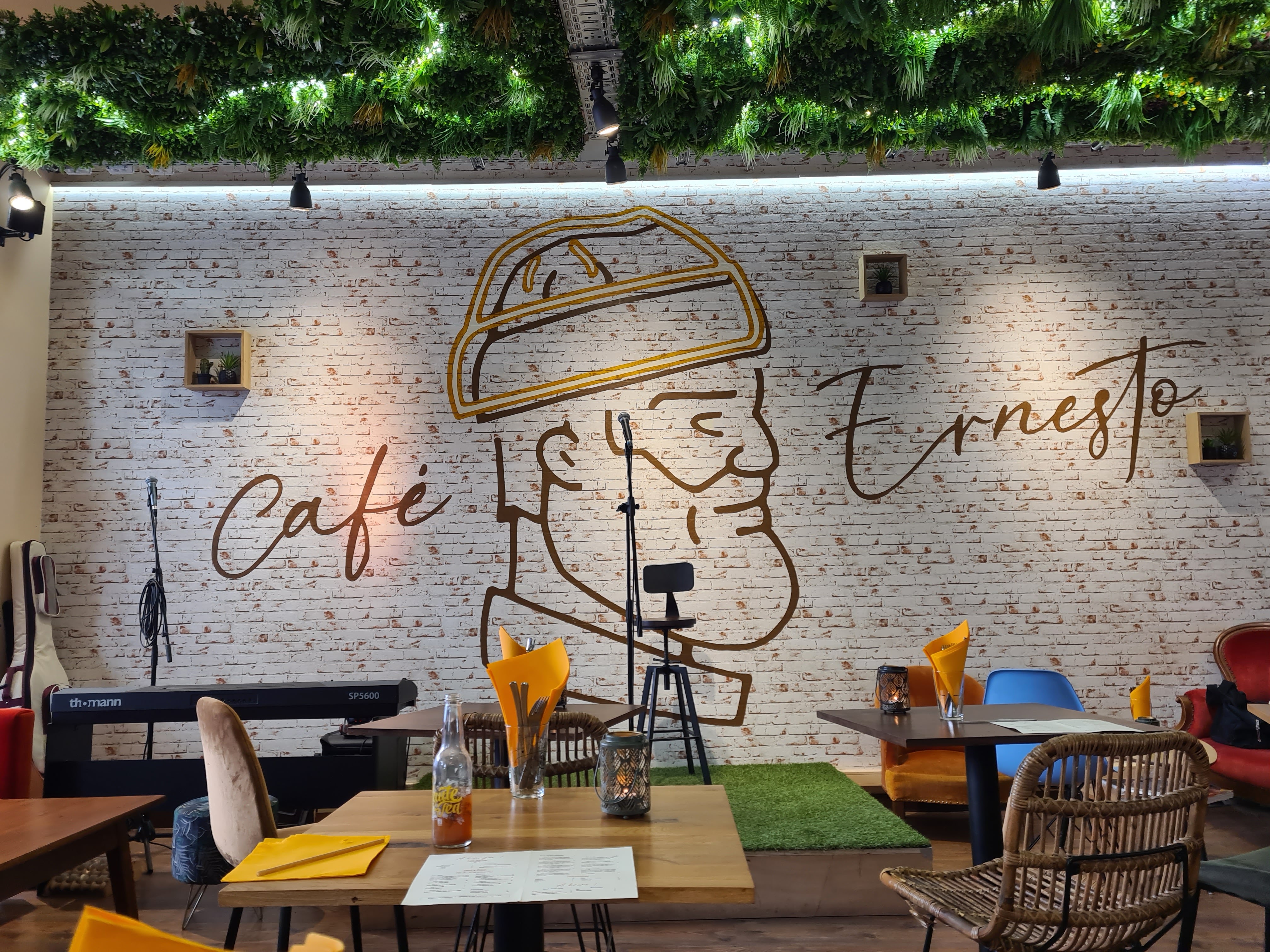 J'ai découvert le Café Ernesto, par hasard, pour une pause cappuccino, (trop bon et si joliment servi), je m'y suis tout de suite sentie bien grâce au décor, et à la gentillesse des serveurs et l'atmosphère qui y règne. Du coup, j'ai souhaité y fêter mon anniv., tout dernièrement, lors de la soirée stand up du vendredi: c'était une première pour moi ! Nous etions 10 et n'avons pas été déçus, c'était top, de l'apéritif, aux plats, tout était délicieux. Nous avons pu goûter les differents plats (sauf1) et tous ravis de la bonne ambiance, avec un serveur, très attentionné pour tous. J'ai même pu avoir un bon gâteau (cheese cake caramel beurre salé) avec la surprise de bougies 🎂 à souffler. Le stand up participe à la bonne ambiance également. Alors grazie mille 🙏, pour cette belle soirée. ☀️