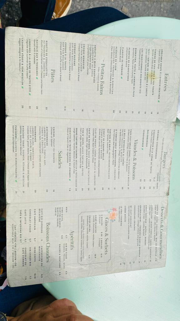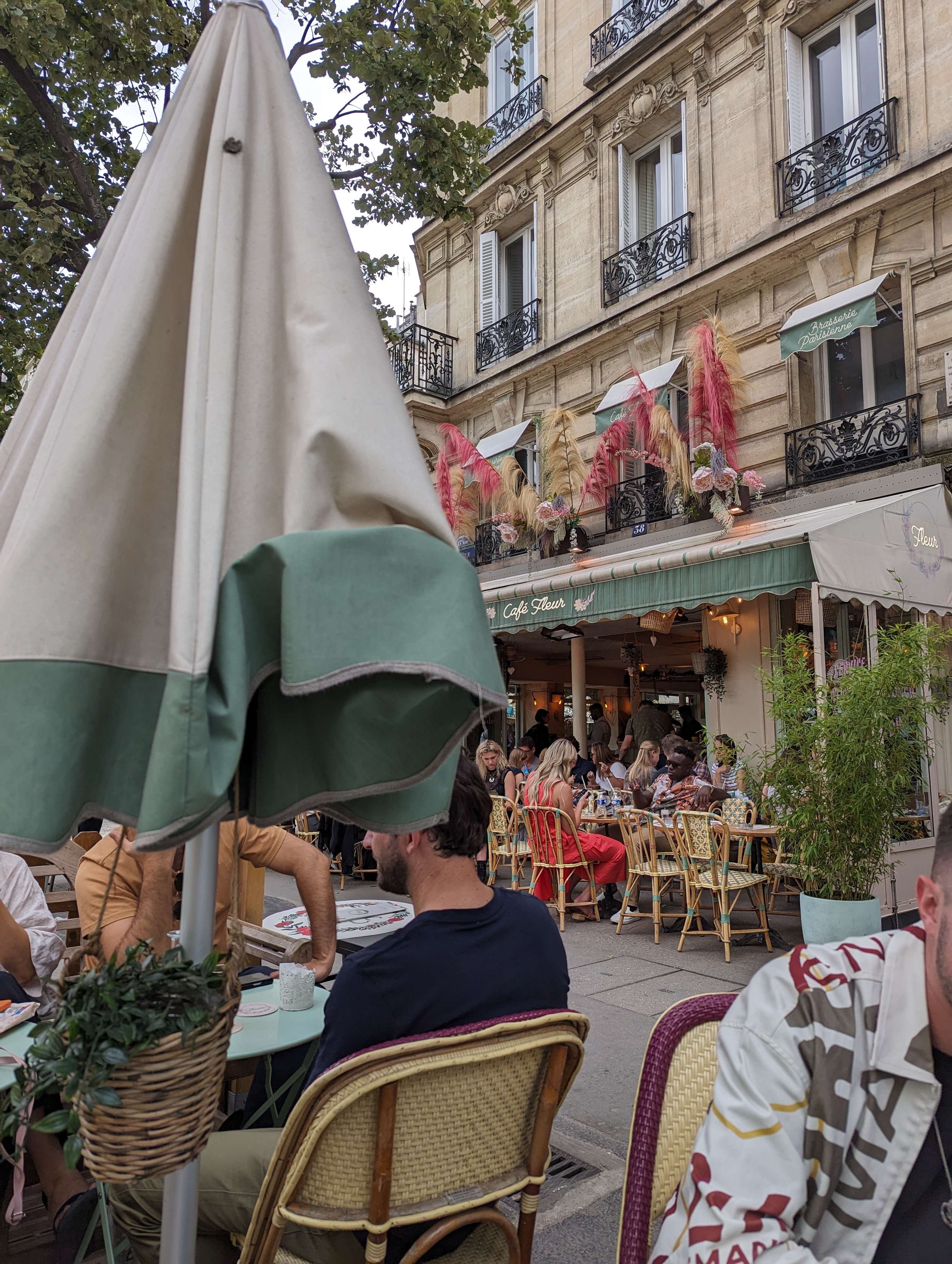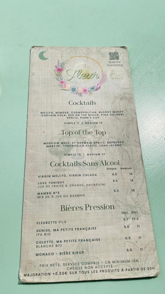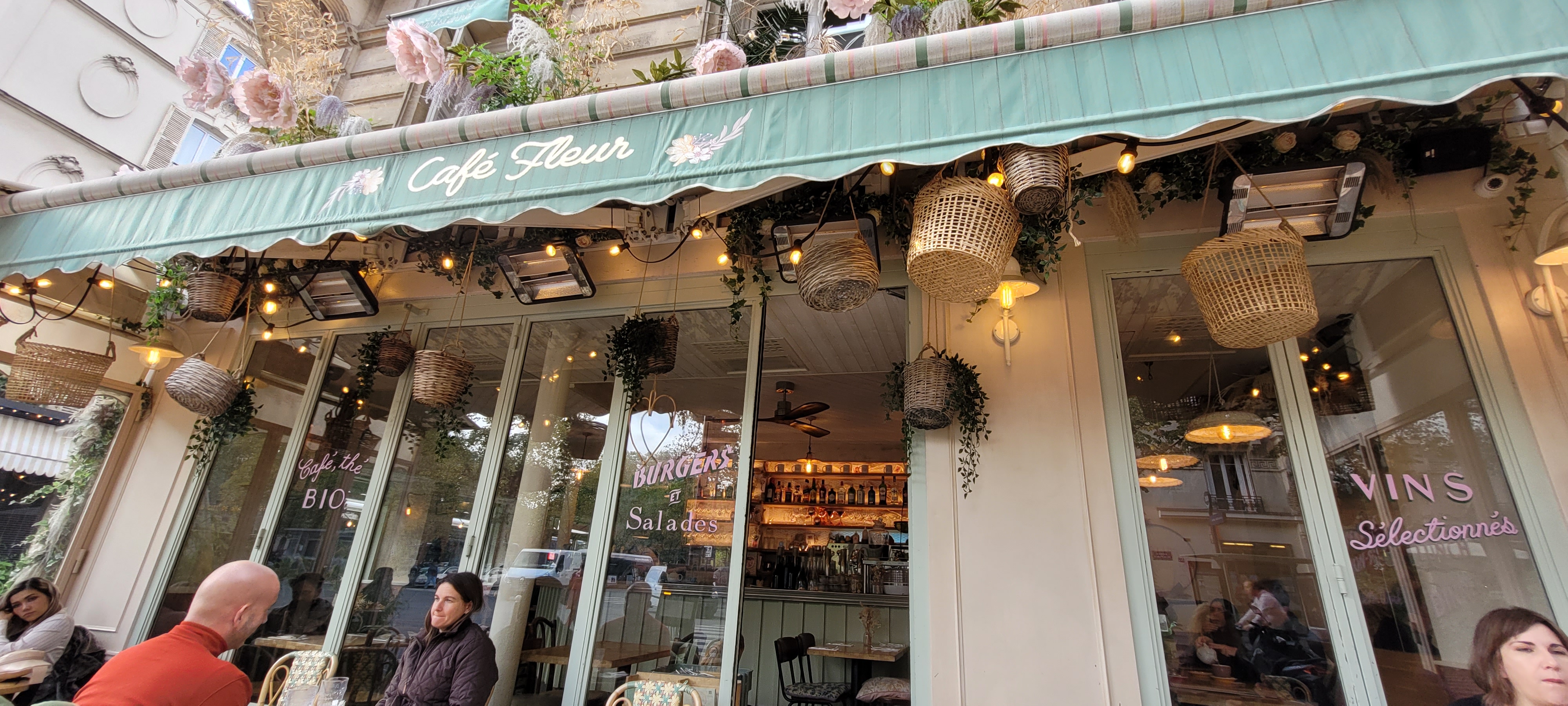 J'ai déjeuné en famille, le Café Fleur a toujours l'air français même s'il s'agit d'une zone touristique. Vous pouvez facilement le constater grâce aux serveurs qui commencent à vous parler en anglais? Le menu propose des choix français classiques, nous avons eu un tartare de saumon et un burger au poulet. Le prix est comme prévu dans ce quartier, 26€ pour le saumon. La nourriture est correcte, rien de plus à mon avis mais bien préparée. Le service était au rendez-vous, la nourriture était servie aussi rapidement. Le café a une bonne ambiance. 3 personnes, 3 assiettes avec 3 boissons, 100€. (Petite bière 6€, cocktail 13€)