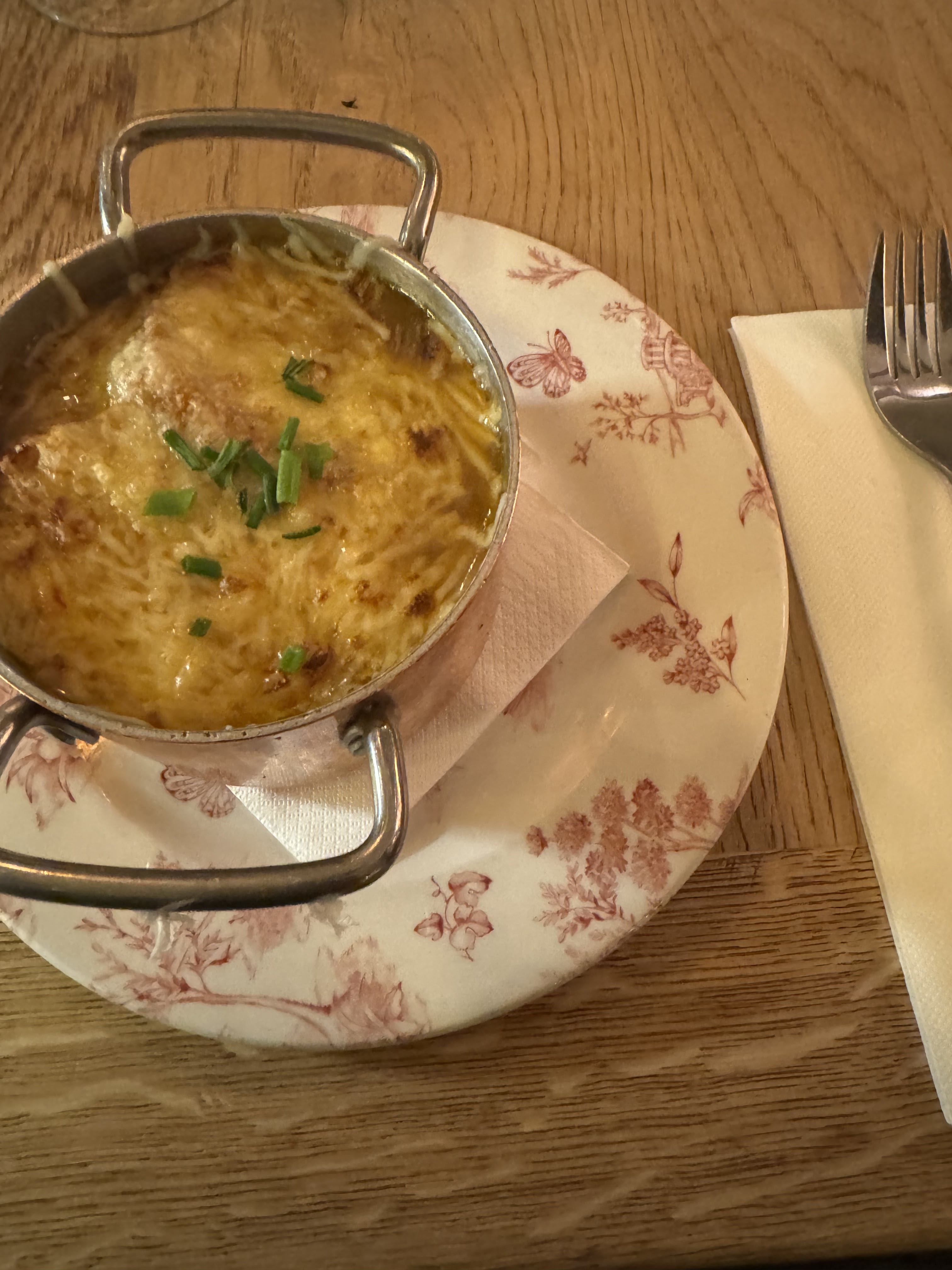 L'endroit que nous avons initialement trouvé n'était plus ouvert, alors nous sommes venus ici et nous en sommes très heureux ! Nous n'avons passé que quelques heures à Paris et cela en valait la peine. Nous quatre avons eu une variété de repas qui ont été servis rapidement et ils étaient tous délicieux ! Nous avons mangé du poisson, des pâtes, de la salade, une omelette et un burger et rien de déçu ! Un peu à l'étroit, mais cela ne nous dérangeait pas vraiment. Mon seul scrupule : ne devrait-on pas simplement l'appeler Soupe à l'oignon si nous sommes en France ?