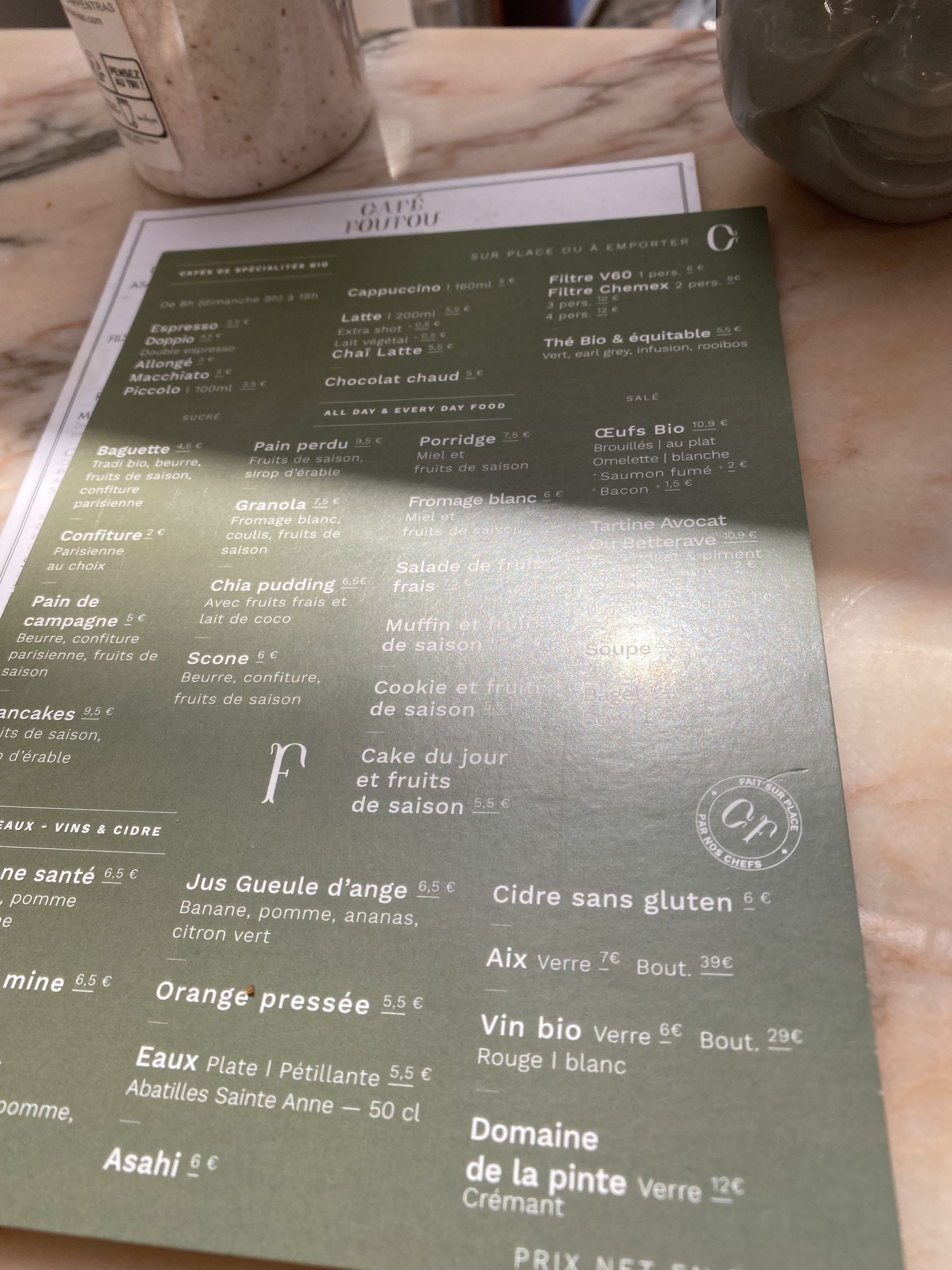 Sans aucun doute, l’un des meilleurs brunch que l’on puisse trouver! Des produits de qualité et bio! Des saveurs incroyablement bons! J’ai un faible pour le Pain Perdu même si on peut dire que tout est bon chez Cafe Foufou! Une présentation alléchante! Et un bon rapport qualité/prix vu la qualité exceptionnelle des plats! Je recommande les yeux fermés! On y va presque tous les weekends avec ma femme et leur accueil chaleureuse nous a fidélisé!