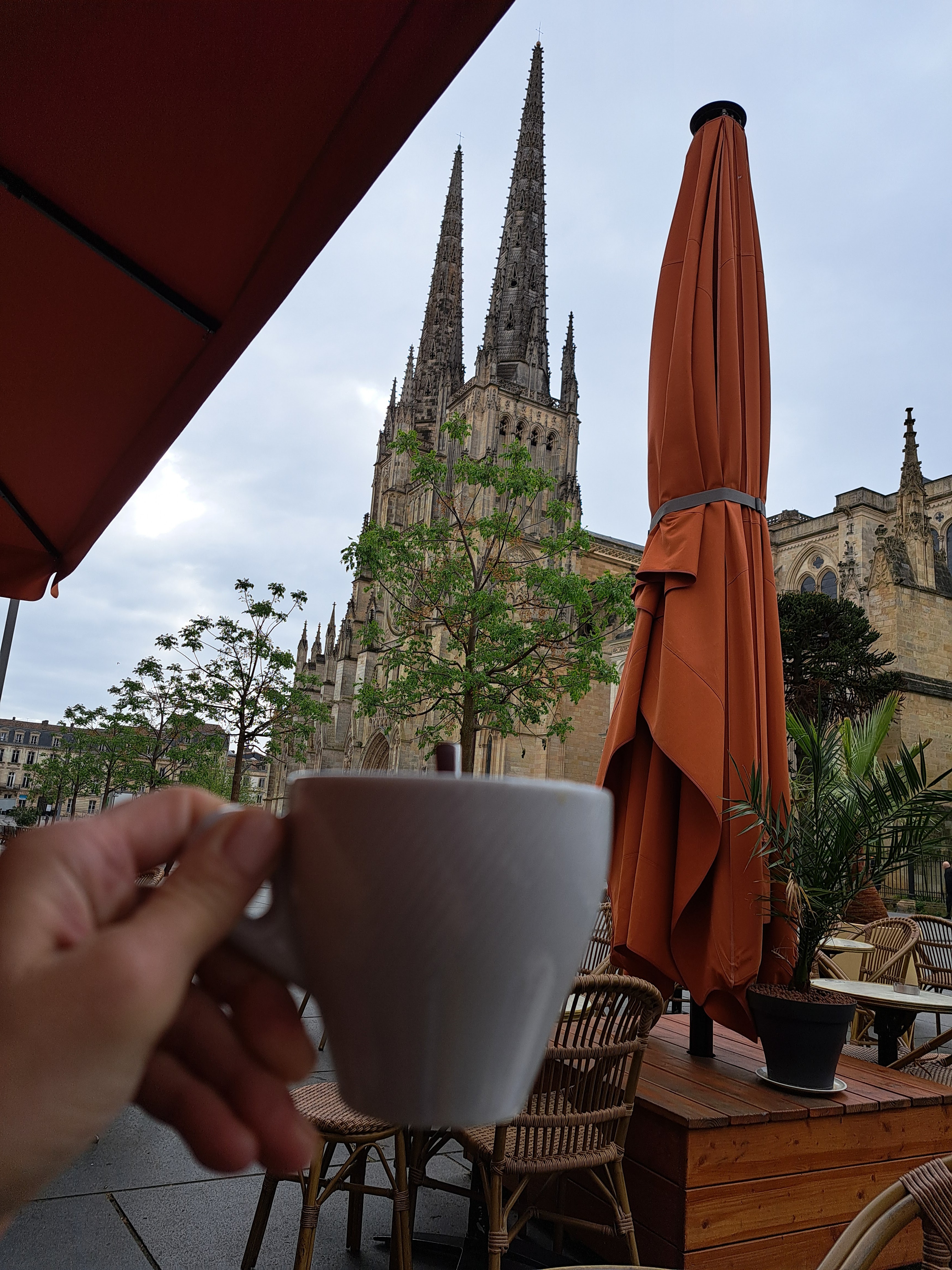 Très bien situé car juste en face de la cathédrale de Bordeaux, mais je trouve ça un peu cher. Le café coûte environ 4,5 euros et couci-couça.