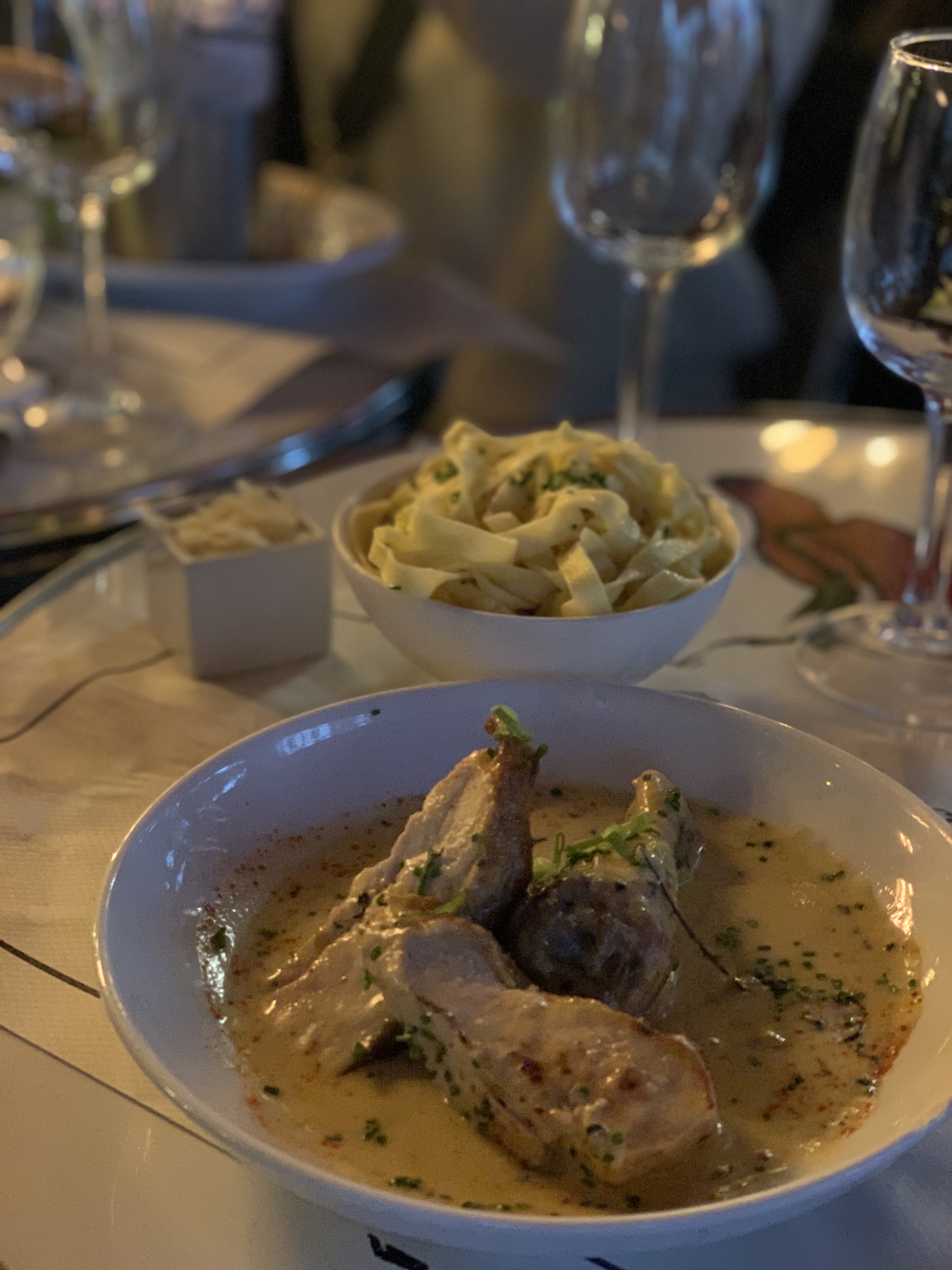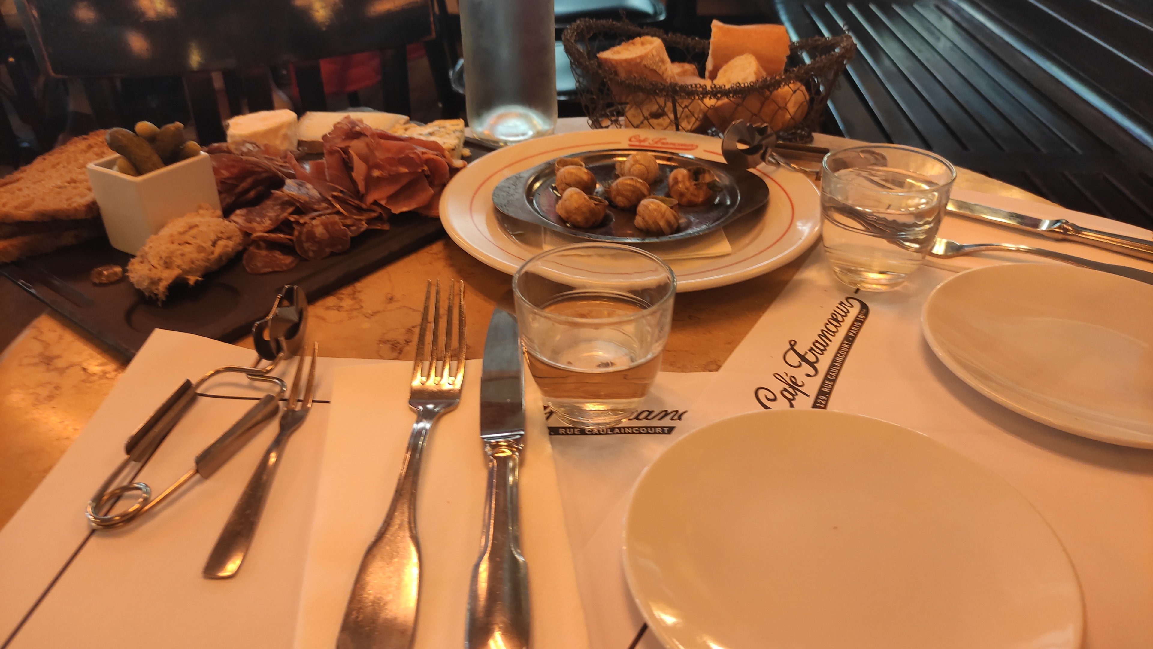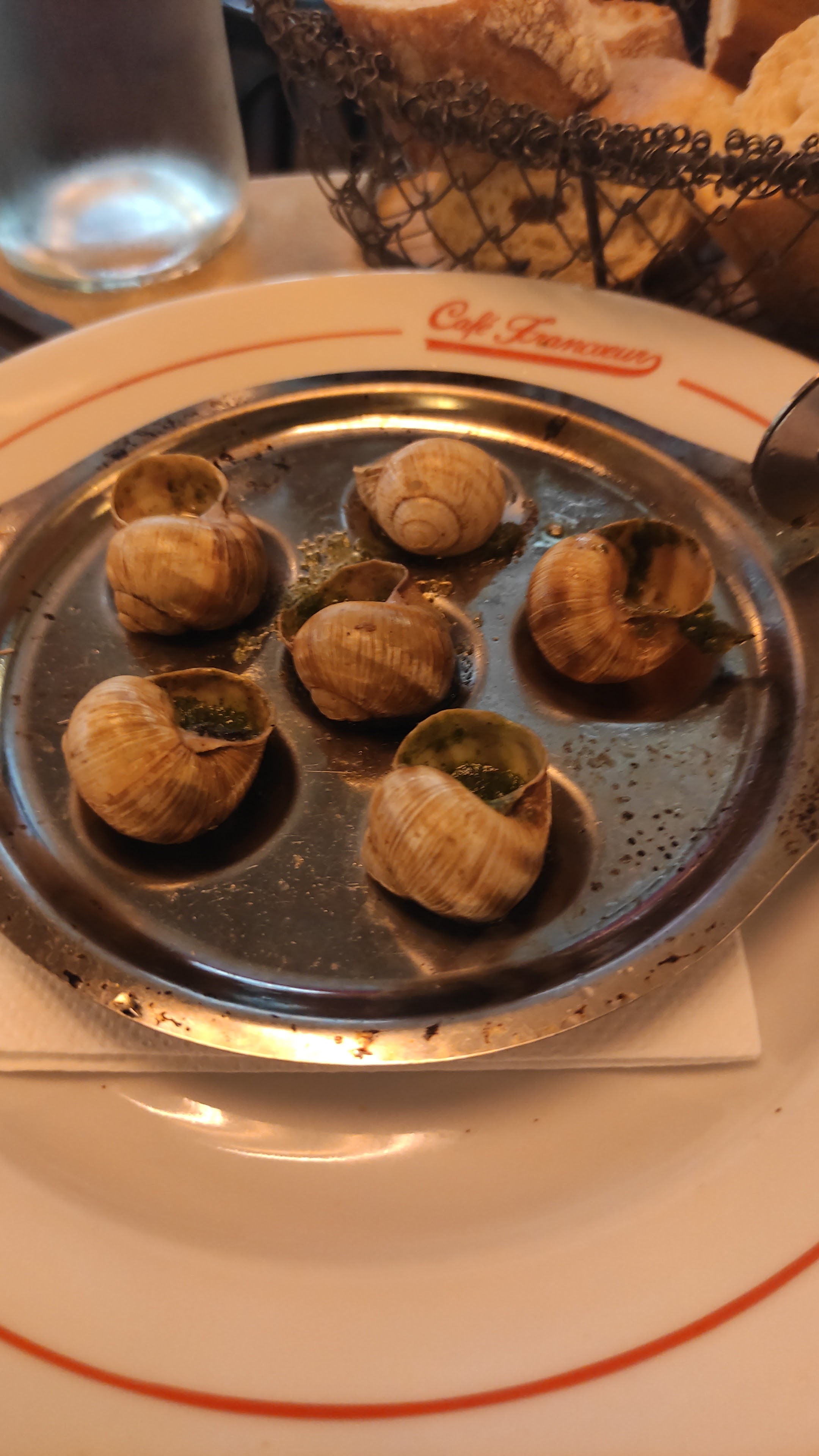 Nous nous sommes arrêtés ici pour notre dernier repas à Paris. Il y avait des boissons, des escargots, des salades et du tiramisu. Tout était très bon.