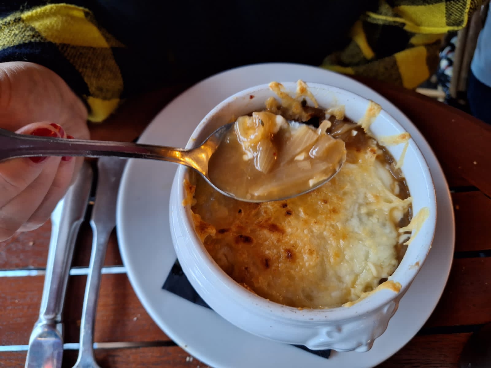Nourriture 3/5, service 5/5 ! Peut-être les serveurs les plus gentils (donc les moins parisiens) que j'ai jamais rencontrés à Paris ! Ils sont très sympathiques avec les touristes/anglais, patients et prêts à vous aider. Le menu contient également de l'anglais. La soupe à l'oignon française n'était pas mauvaise mais les oignons auraient pu mettre plus de temps à caraméliser et le fromage aurait pu être grillé plus longtemps. J'ai aussi mangé un steak d'agneau qui était en réalité la tentative de rôti du Dr Frankenstein car, même s'il ressemblait à un médaillon bien rangé, il s'agissait en fait de lanières de viande enroulées dans un autre morceau de viande. Il y avait des parties tendres mais dans l’ensemble c’était assez cartilagineux et moelleux. La saveur était plutôt bonne mais gâchée par la viande difficile à manger.