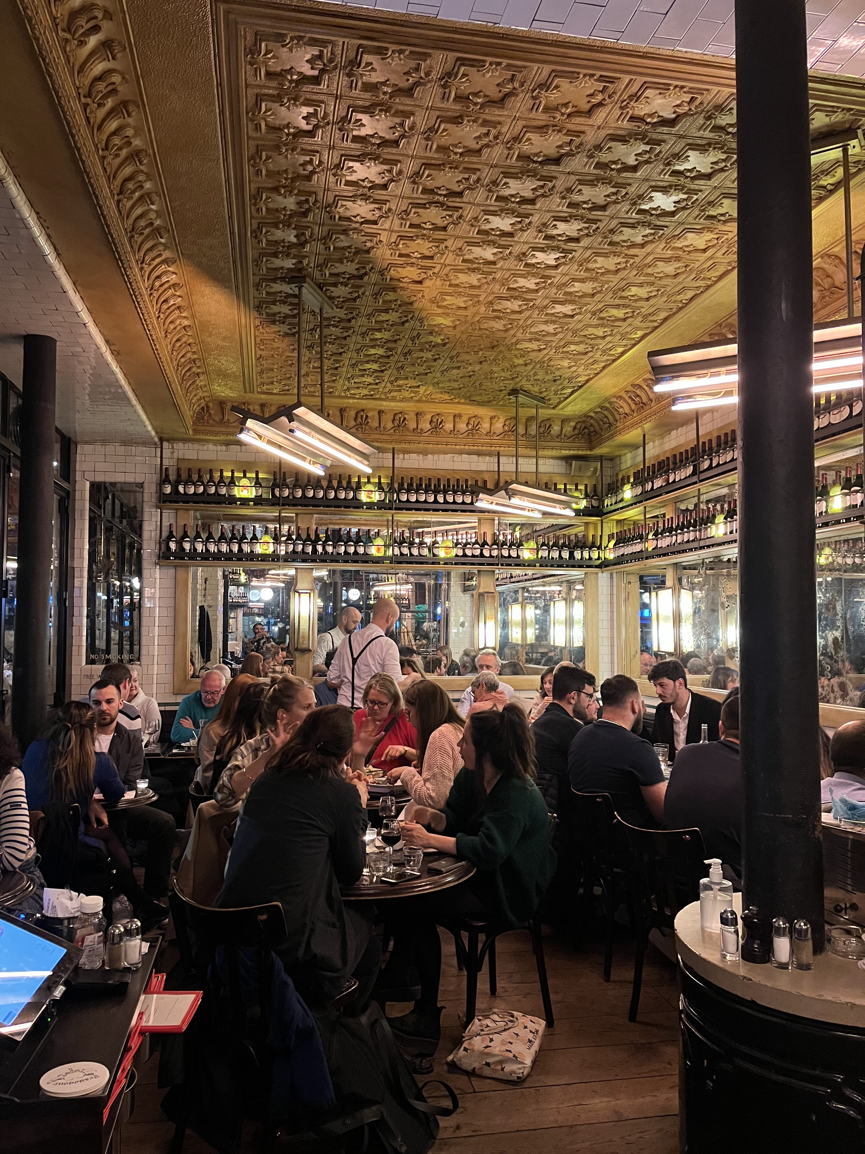 Jolie brasserie à la déco retro parisienne. Planche de charcuterie excellente avec un large choix de vin.