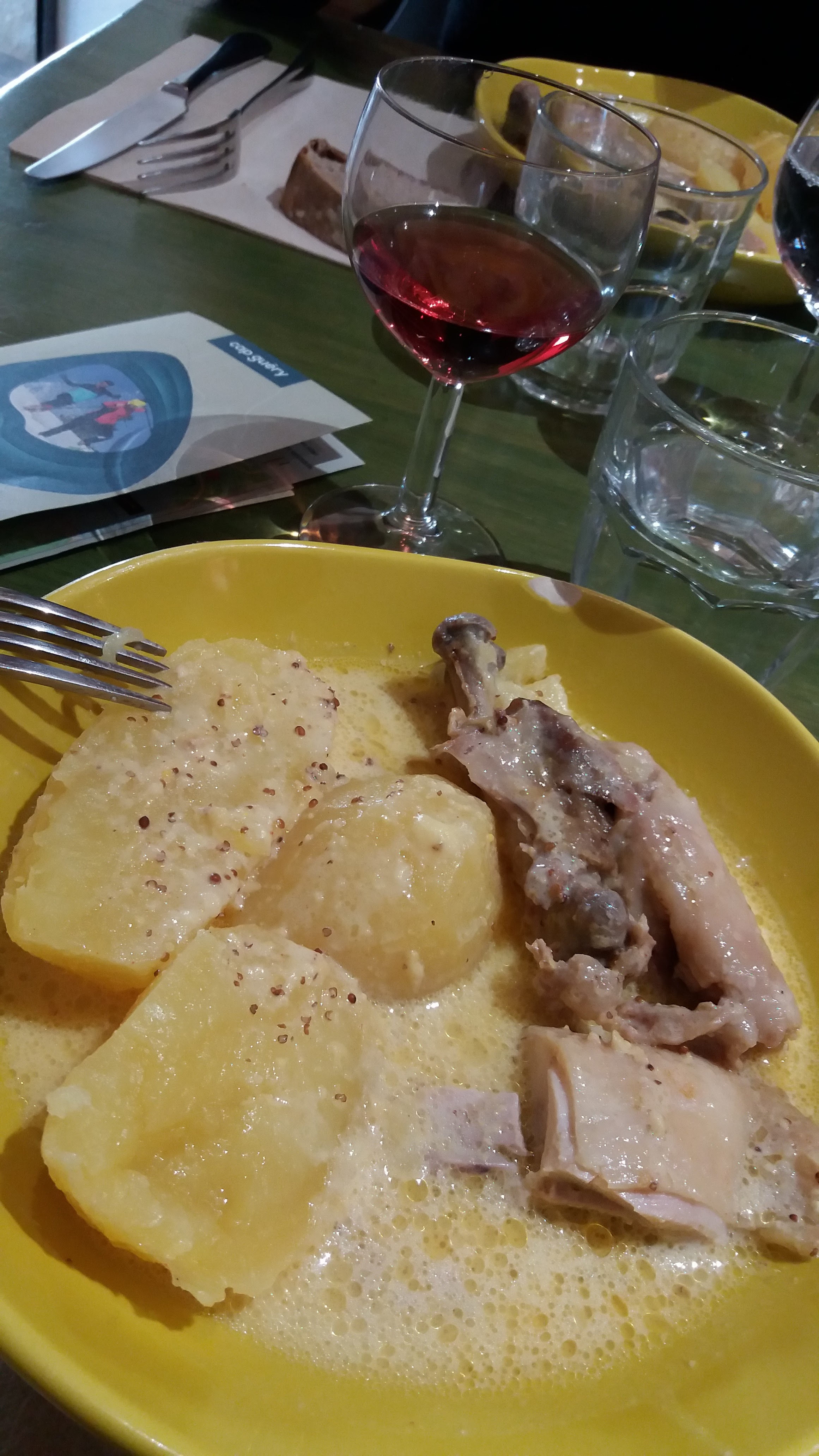 Un repas simple et excellent ce midi : truffade, salade et jambon de pays, puis moelleux au chocolat avec coulis de framboise. Alors que ce n'était pas à la carte, j'ai pu avoir une bouteille de limonade pour faire un rouge limé, souvenir de mon enfance. Allez y comme vous êtes... :) et n'y voyez aucune autre référence.