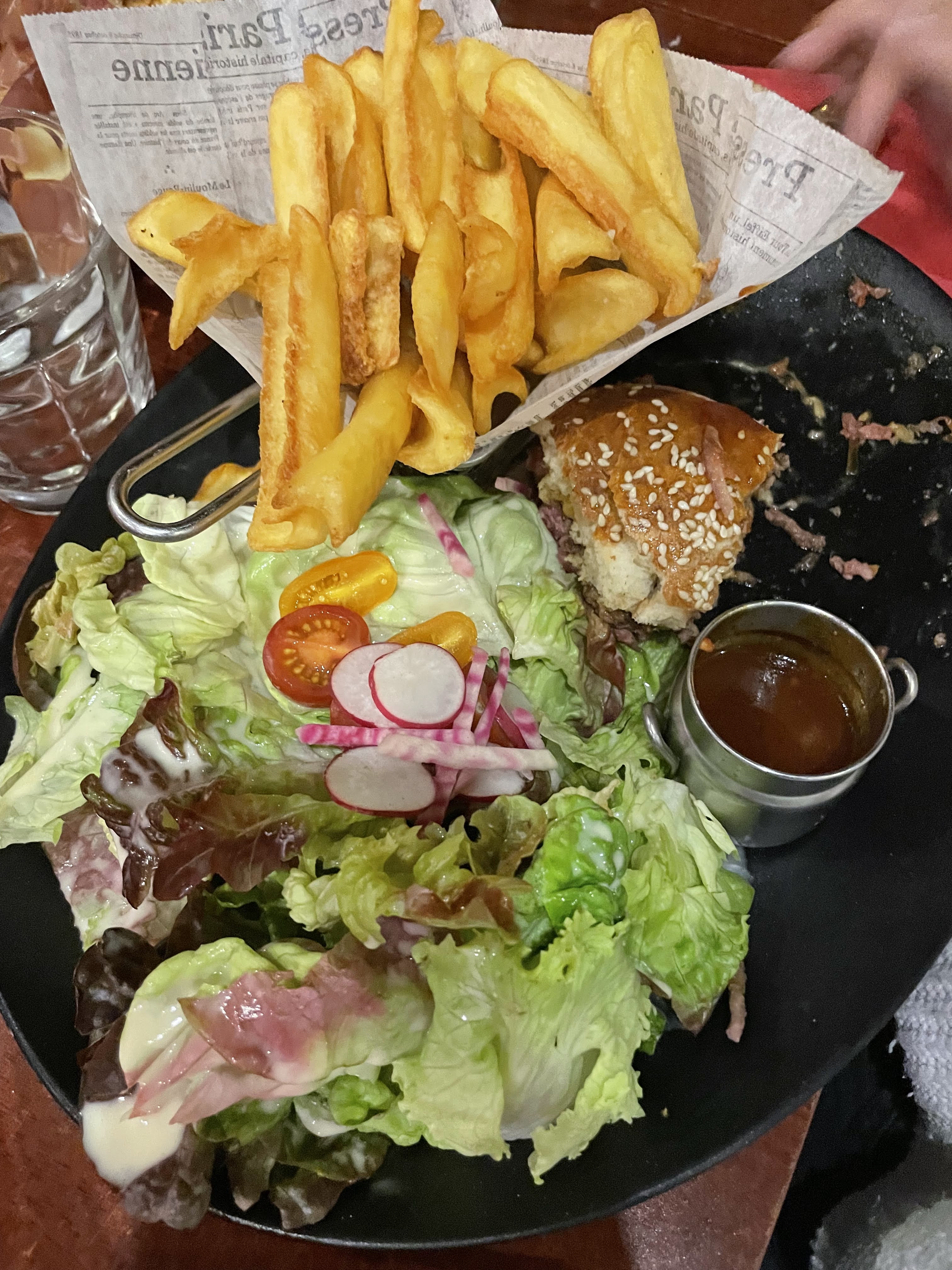 Galette et burgers très bon petit bémol les frites surgelées qui sont très aérées à l’intérieur. Les crêpes en dessert sont excellentes