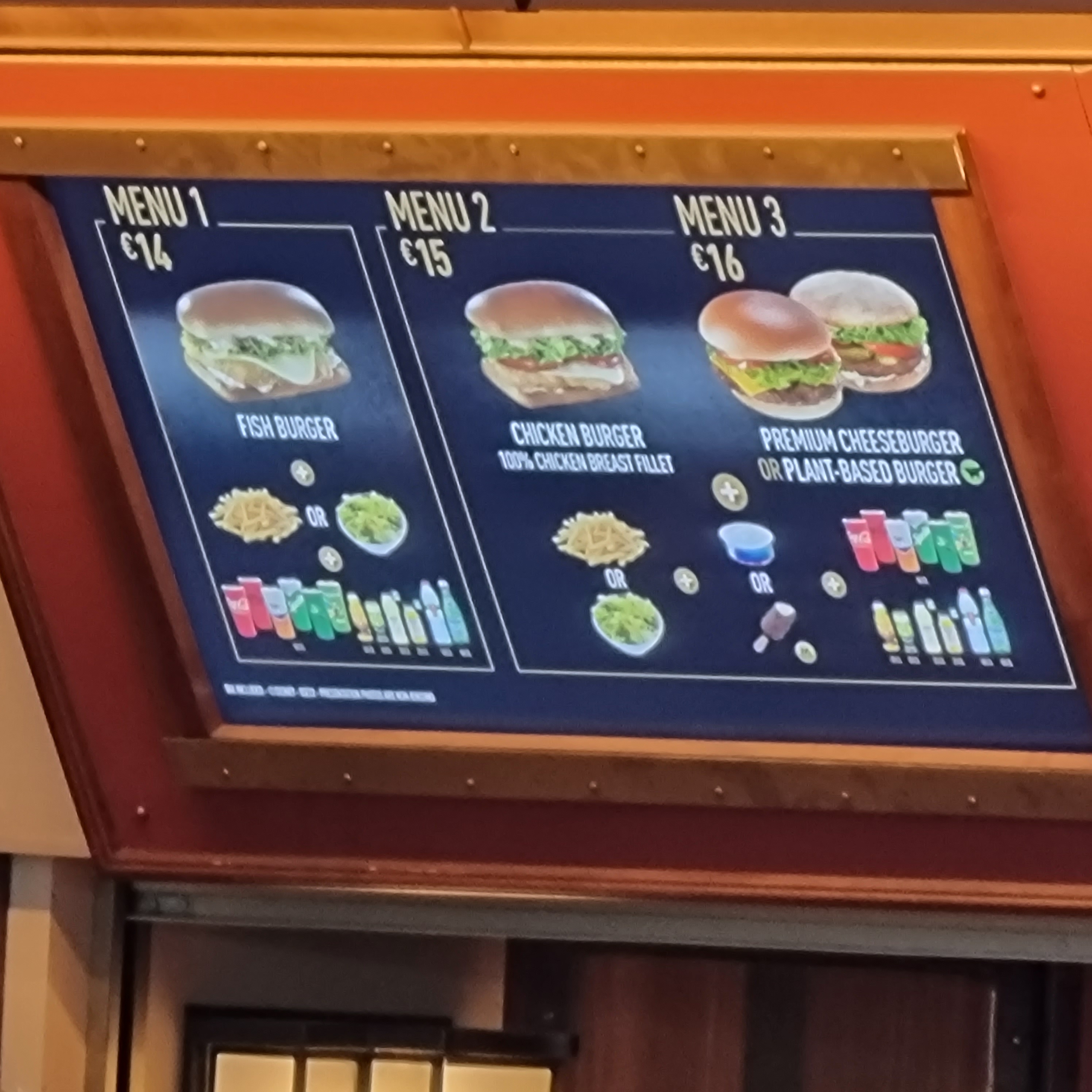 Menue sympa personnellement je prends tout le temps le menue enfants ça convient très bien à mon appétit et il est complet et pour pas chère les autres menue mon chéri ce fait une joie de les goûter pour moi et on revient très souvent c’est un bon fast-foods avec soit ambiance sur scène ou dessins animés Disney qui passe toute la journée. Je recommande vivement ce fast food et pas besoin de réservation.