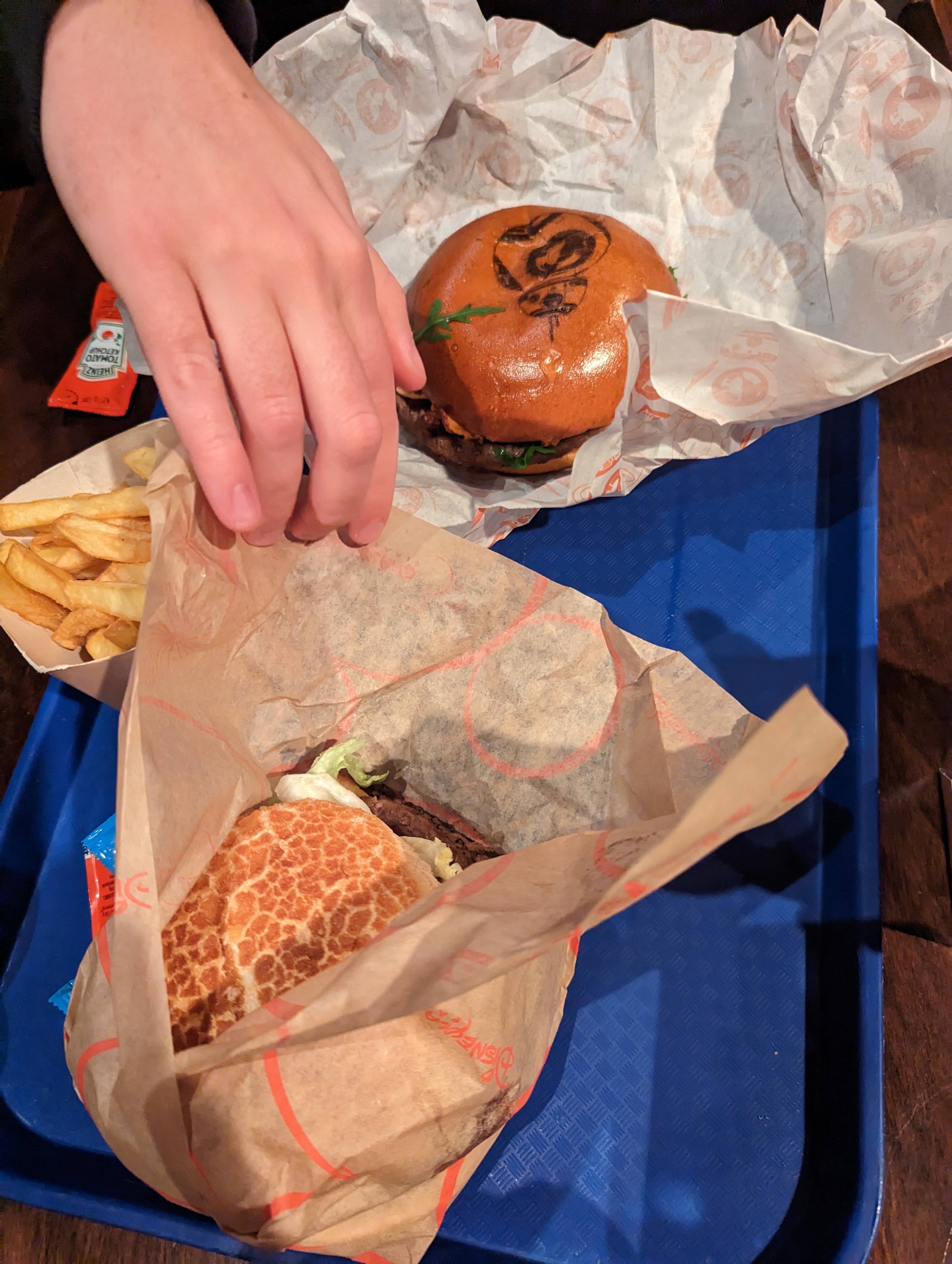 Pas génial. Les enfants n'ont pas aimé la nourriture, mon partenaire a apprécié le hamburger et mon hamburger au poulet était probablement le pire que j'ai jamais mangé. Cela avait le goût d’une « poitrine boisée », du genre caoutchouteuse avec une mauvaise texture. Il n'y avait pas trop de monde mais il était toujours difficile de trouver une place pour s'asseoir.