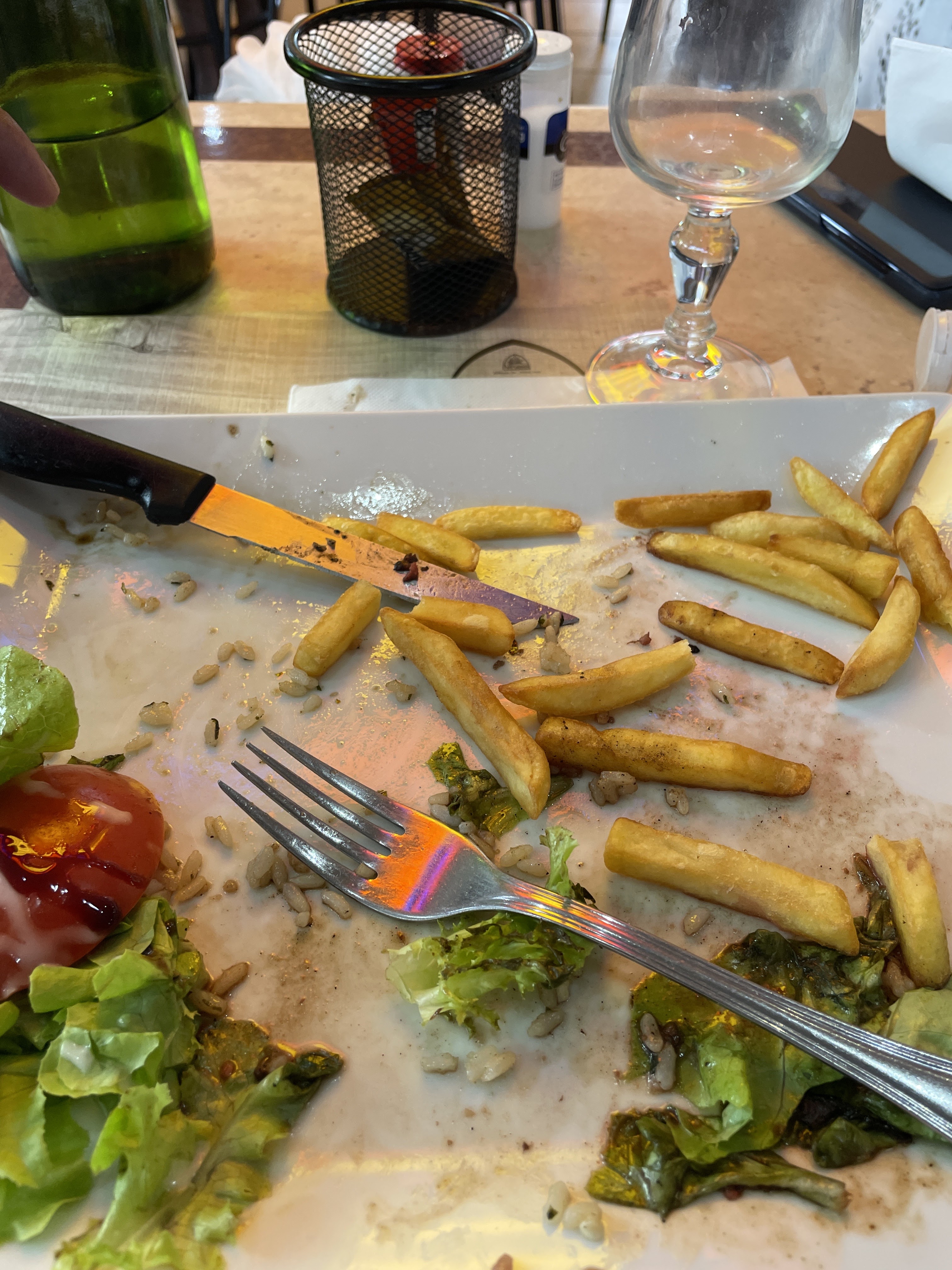 J'ai passé une commande, quand le repas est sorti, il manquait de la salade. J'ai demandé où était la salade, ils ont répondu qu'ils n'en avaient plus. Cela aurait changé le repas. Ennuyé, on ne m'a pas dit et puis il m'a demandé si je voulais des haricots, j'ai dit oui mais j'ai attendu et je ne suis pas venu. J'ai demandé au serveur quand ils arrivaient, on m'a dit qu'ils avaient oublié. Je n'étais pas impressionné, je ne voulais pas de haricots car mon repas était sur le point de se terminer. Je ne voulais pas payer pour un repas entier, une réduction de 1 ou 2 euros aurait été bien. Non, ce n'était pas suffisant, ils ont fait venir le directeur, il voulait appeler la police si je ne payais pas le repas, même si je n'avais pas reçu ce que j'avais commandé. Des Français grossiers et arrogants.