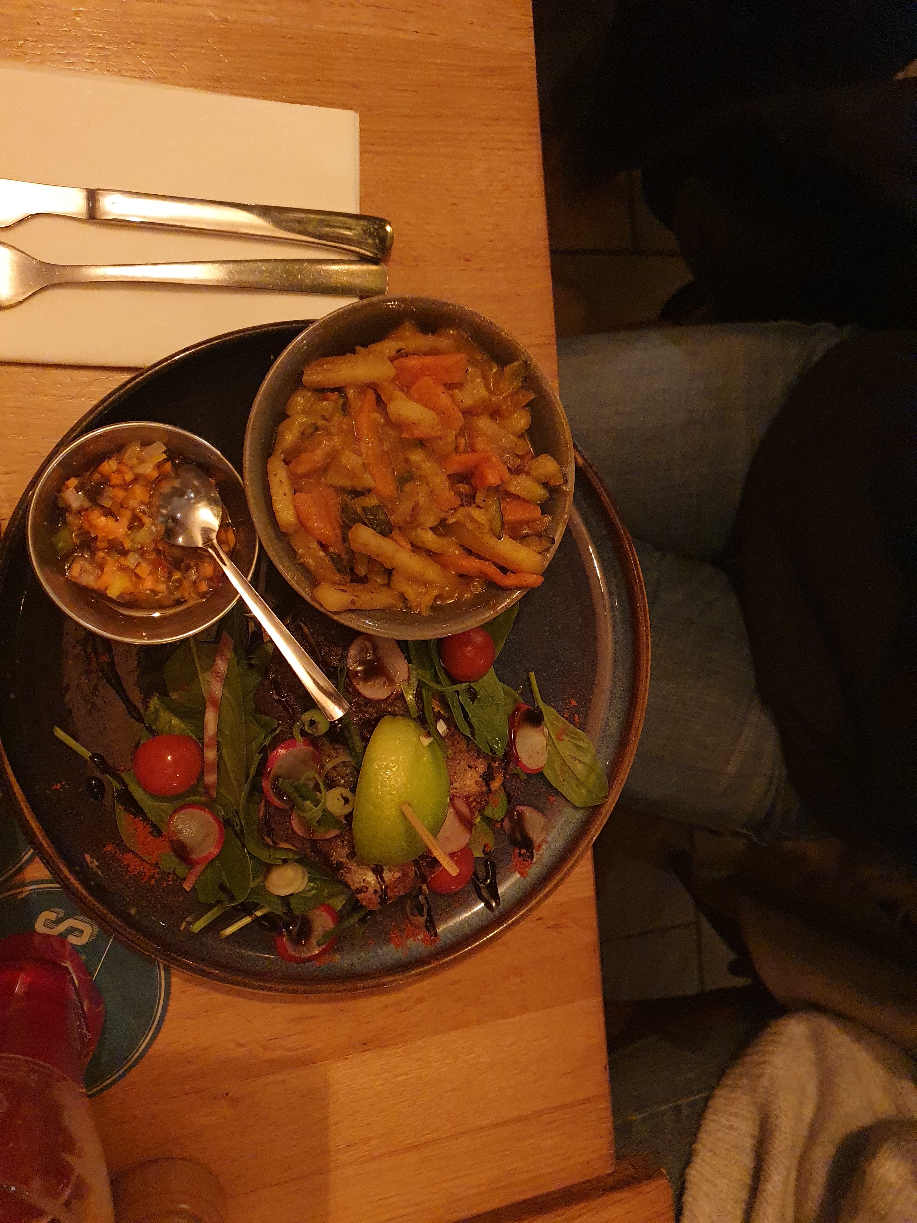 Bien ,plat original filet fumé au thym pour moi,pour mon époux un plat bien relevé Et aussi bien reçu Sympa niveau service