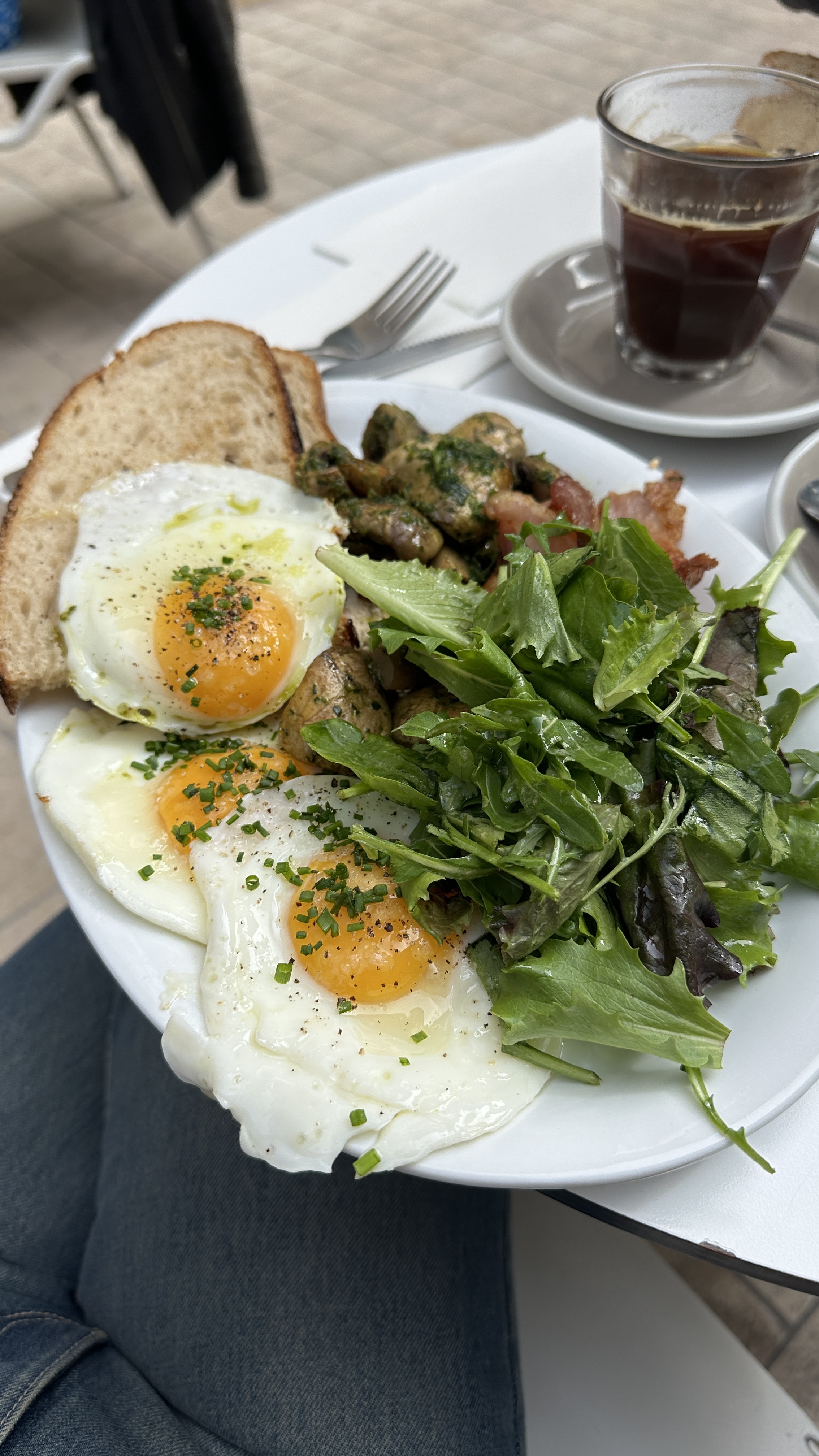Toast aux oeufs au plat, avec supplément bacon et champignons persillés, jus d’orange pressé .. Excellent ! Tout était très gouteux et bien préparé. Et les serveurs étaient au petit soin. En plus d’être chaleureux, ils nous ont fourni des petits plaids comme notre table était proche de la porte d’entrée