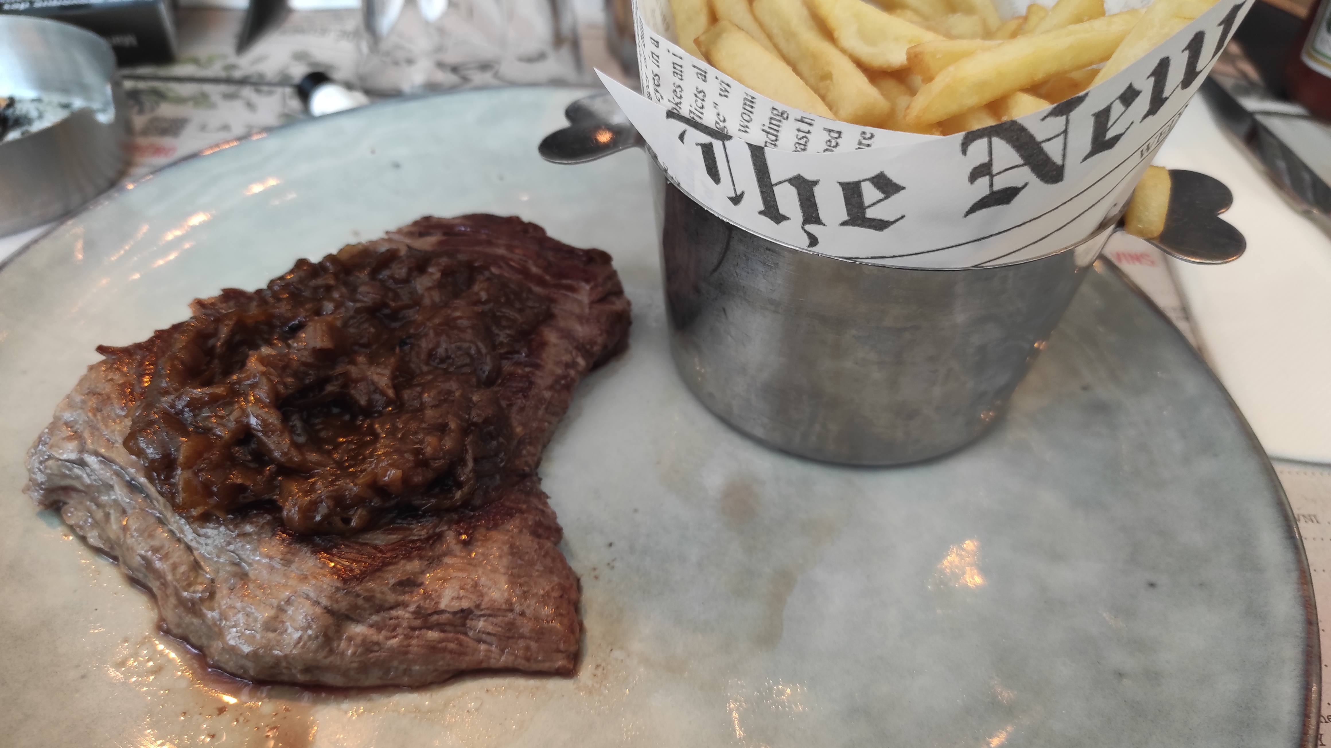 Beaucoup de monde, j'ai pris une bavette saignante que j'ai reçu bleu, les frites n'était pas assez cuite. Pour louper des frites c'est le pompon. Er évidemment les prix reste dans la moyenne élevée. Emplacement pratique après un shopping. Une adresse pour un repas rapide mais sans plus.