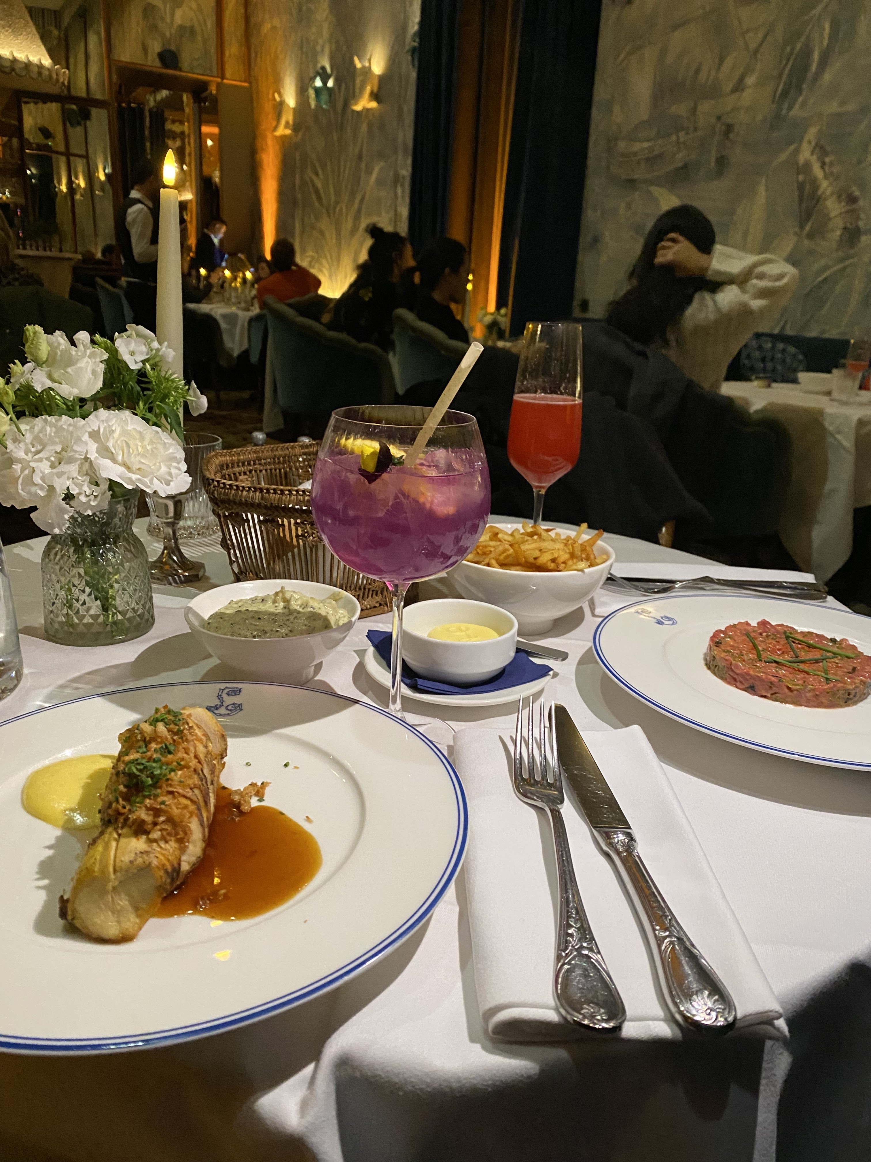 Excellent choix de plats et de cocktails, les serveurs sont très professionnels et répondent à tous vos besoins. L'ambiance du lieu est agréable, sophistiquée mais néanmoins chaleureuse, et la décoration (tapisserie murale, tapis épais, tons dorés) est assez impressionnante, des lumières tamisées et une bougie sur chaque table, idéal pour un rendez-vous ! Aucun code vestimentaire formel requis
