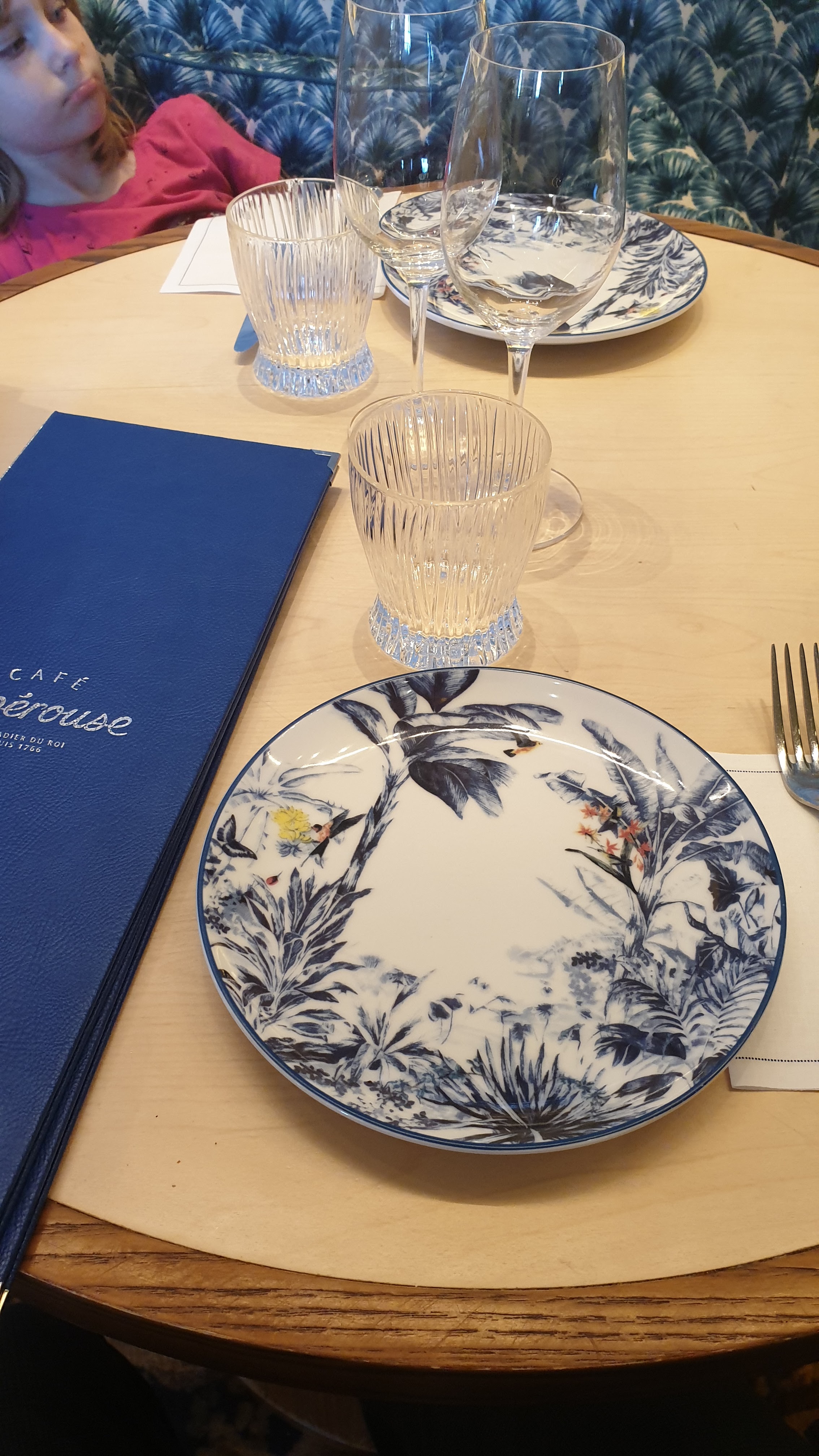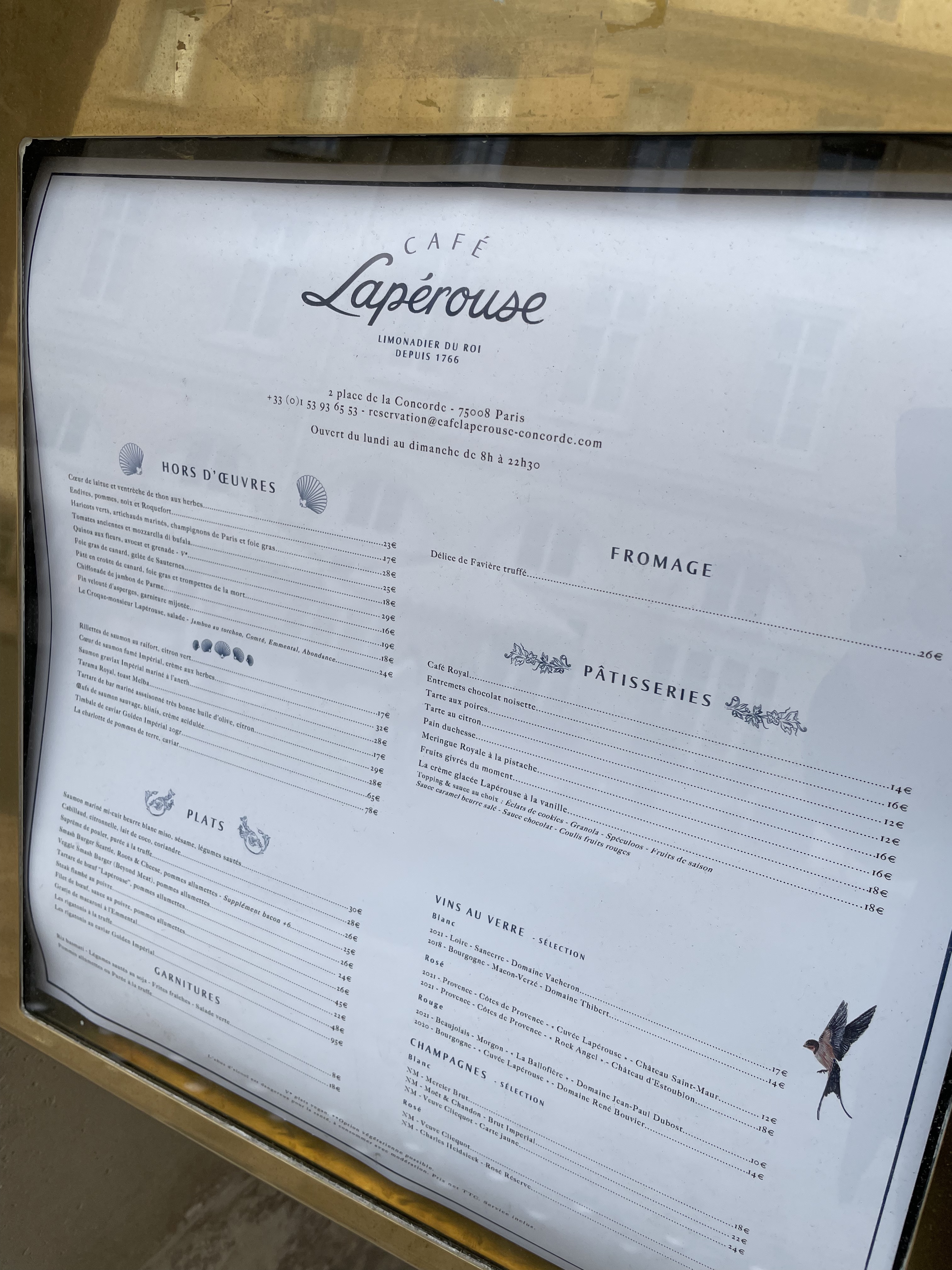 Pour un thé ou un café pourquoi pas c’est très très cher C’est beau Le personnel est assez guindé mais efficace Les toilettes propres Le lieu vaut le détour pour le décor Dommage que l’intérieur était fermé L’histoire : le Café Lapérouse s’ancre à l’Hôtel de la Marine, place de la Concorde. adresse spectaculaire décor romanesque signé Cordélia de Castellane, deux terrasses protégées, une ambiance très funk et pop et qui égaille le lieu À l’origine, un certain Lefèvre « Limonadier du Roi » et négociant en vins, qui s’établit en 1766 à l’adresse qui, quelque 100 ans plus tard, hébergera l’une des plus belles caves et accueillera le Tout Paris qui vient s’y encanailler le temps d’un souper. Car plus que la cuisine longtemps triplement étoilée, ce sont ses petits salons qui ont fait sa réputation et ses fameux miroirs que les cocottes griffaient avec le diamant offert par leur amant pour s’assurer de son authenticité. Embarquement pour un voyage extraordinaire. Cordélia de Castellane – directrice artistique de Dior, sans doute encore – s’est entourée d’un équipage de haute volée pour imaginer un lieu au charme fou, inspiré des voyages de l’explorateur à qui le restaurant a emprunté son nom. Elle signe pour les Cafés Lapérouse de somptueux décor qui associent influences XVIIIᵉ, imprimés bigarrés et touches Art Déco, dans un irrésistible mélange des genres façon Madeleine Castaing.