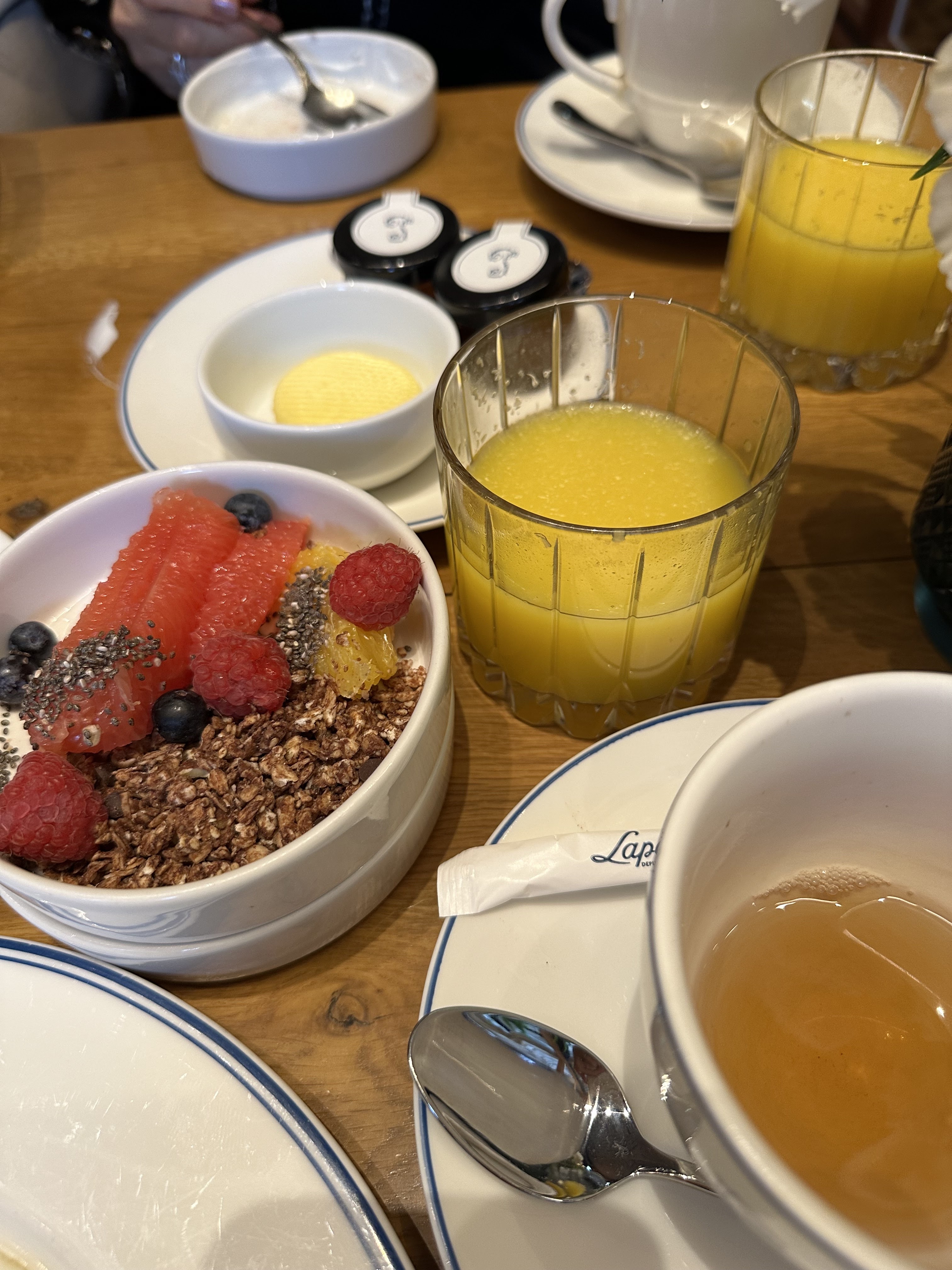 Petit déjeuner : granola excellent. Mais premiers morceaux de pain au levain imbibés de beurre cuit ! A notre nouvelle demande de pain au levain sans beurre et non grillé, il est arrivé grillé et seulement 1 mini tranche par personne… conclusion le pain au levain n’était pas frais… à ce prix c’est incroyable ! Le jus beauté présente à la carte ne se fait plus et n’est pas remplacé… Quel dommage le lieu est superbe…