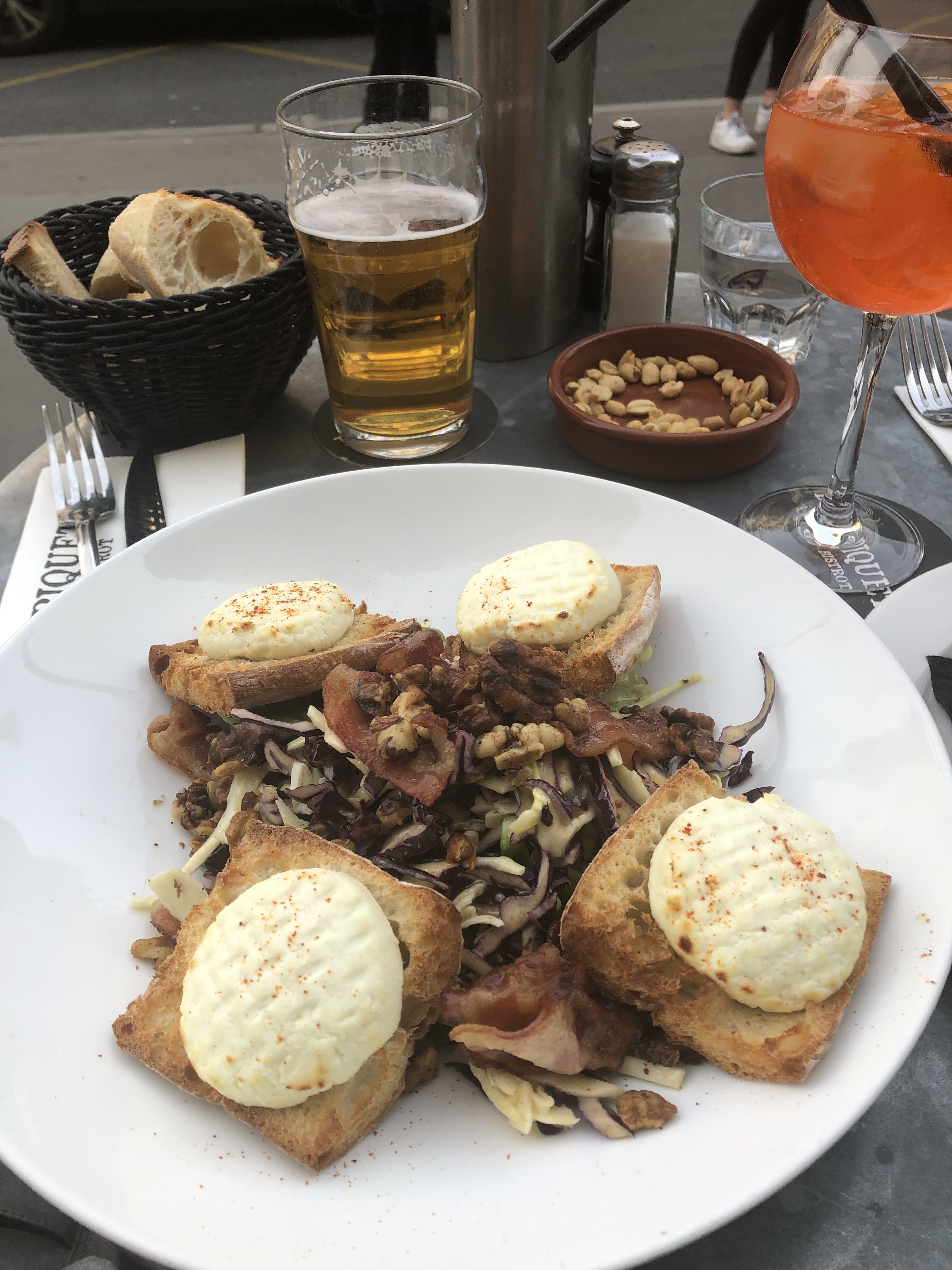 Nous sommes ravis d'avoir choisi cela pour notre première soirée à Paris ! Nous avons apprécié la soupe à l'oignon remplie de délicieux fromages et de croûtons. Ma salade de fromage de chèvre était garnie du meilleur bacon que j'ai jamais mangé. Mon mari a adoré sa commande de poitrine de porc et de purée de pommes de terre. Recommande fortement!
