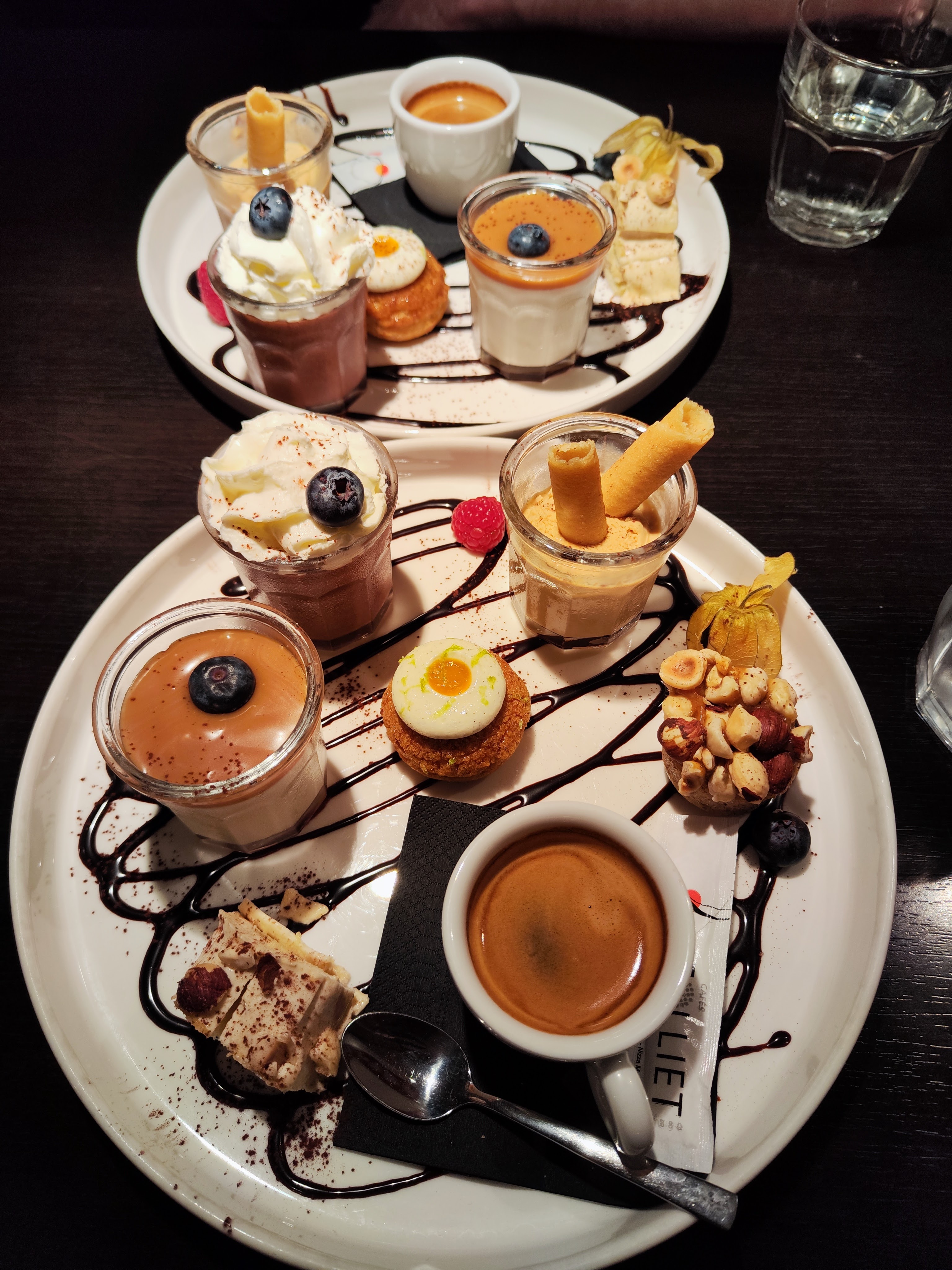 Nous avons apprécié la qualité des plats et des desserts. Le chocolat fondu dans le petit verre pour ajouter sois-même la quantité désirée c'est top.