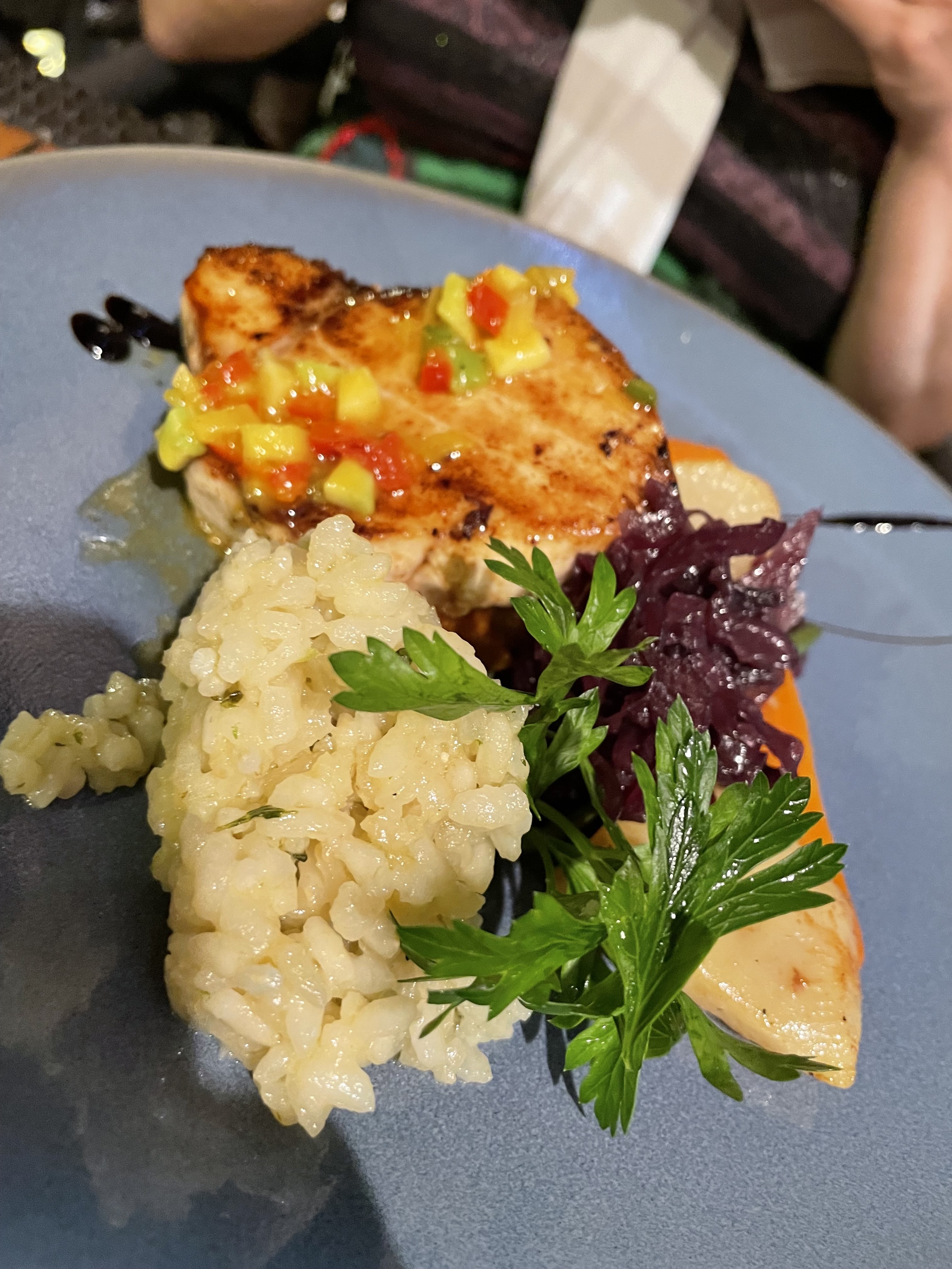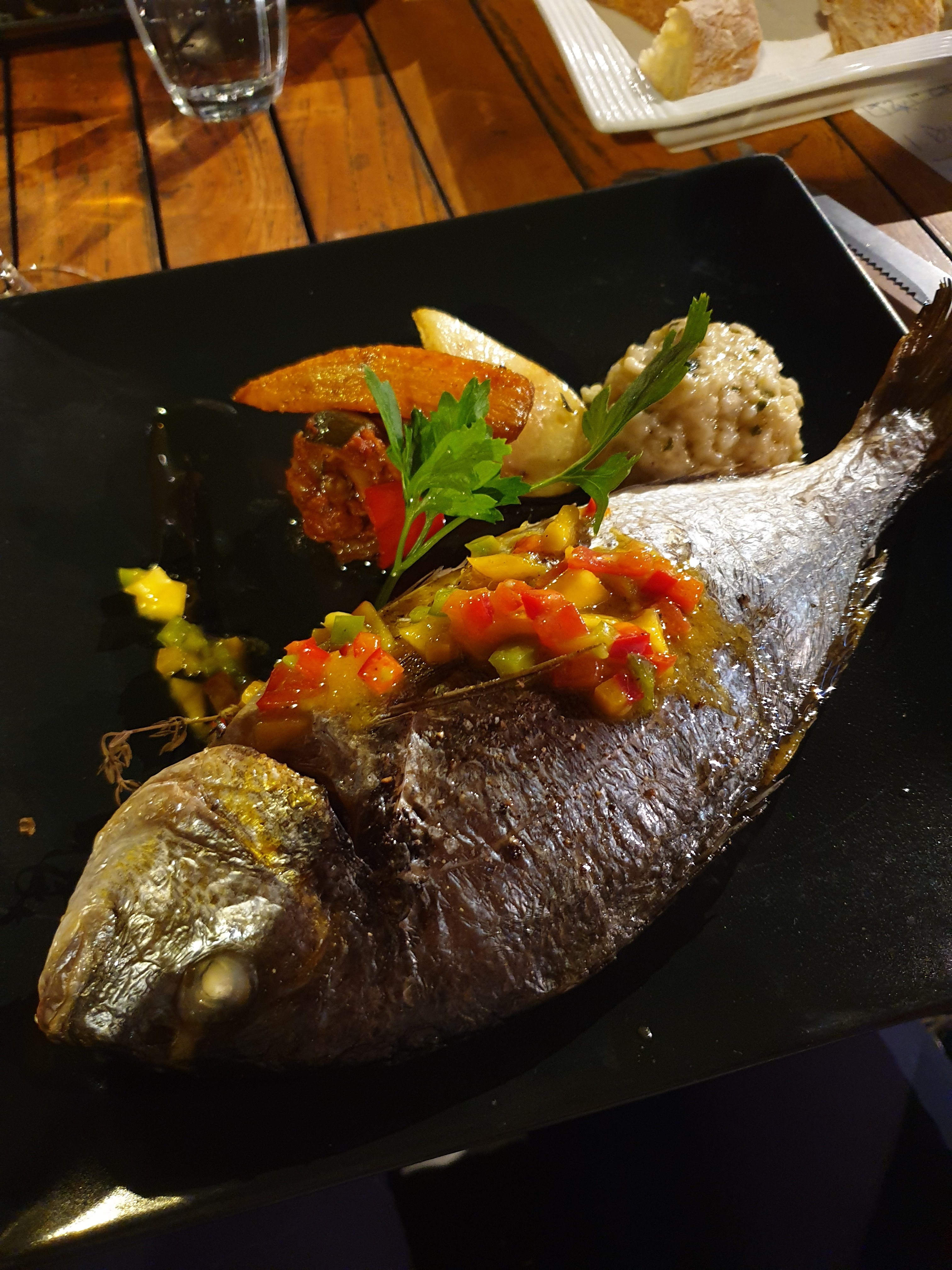 Super sympa l'accueil....l'espadon parfaitement cuit et assaisonné...petits légumes et écrasé de pommes de terre ....que dire du pain perdu caramel beurre salé et glace vanille en dessert....super gourmand et réussi...sourire à volonté...bref merciiiiiii