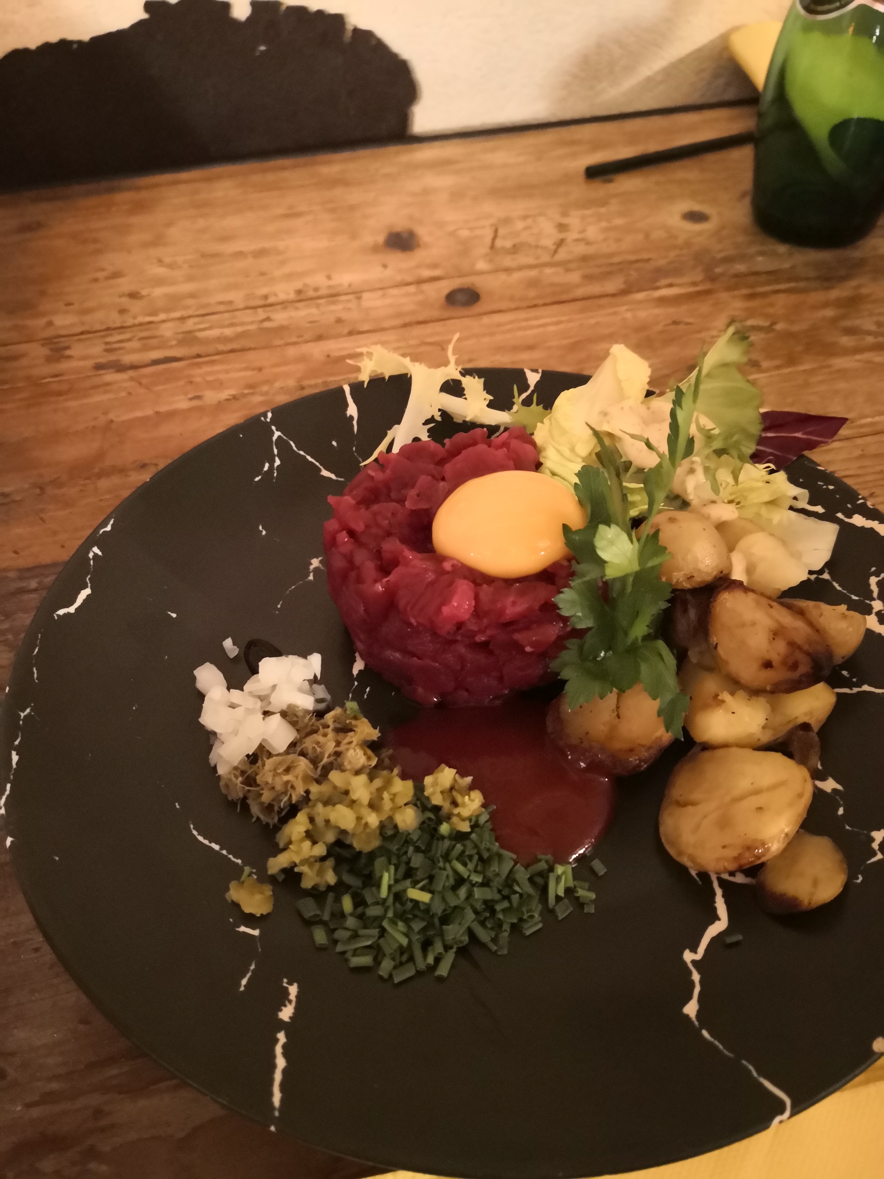 Le prix des assiettes est tout de même très élevé par rapport au quantité servie ce qui a moi m’a déplus mais la qualité, selon les assiettes, est pas mal. Les deux serveurs eux sont agréables, souriant et sympathique ce que je trouve très bien mais quant au barman lui n’est pas du tout accueillant à la limite de l’impolitesse ( voir même infecte ) lorsqu’il vous parle ou tout simplement quand vous lui demander quelque choses