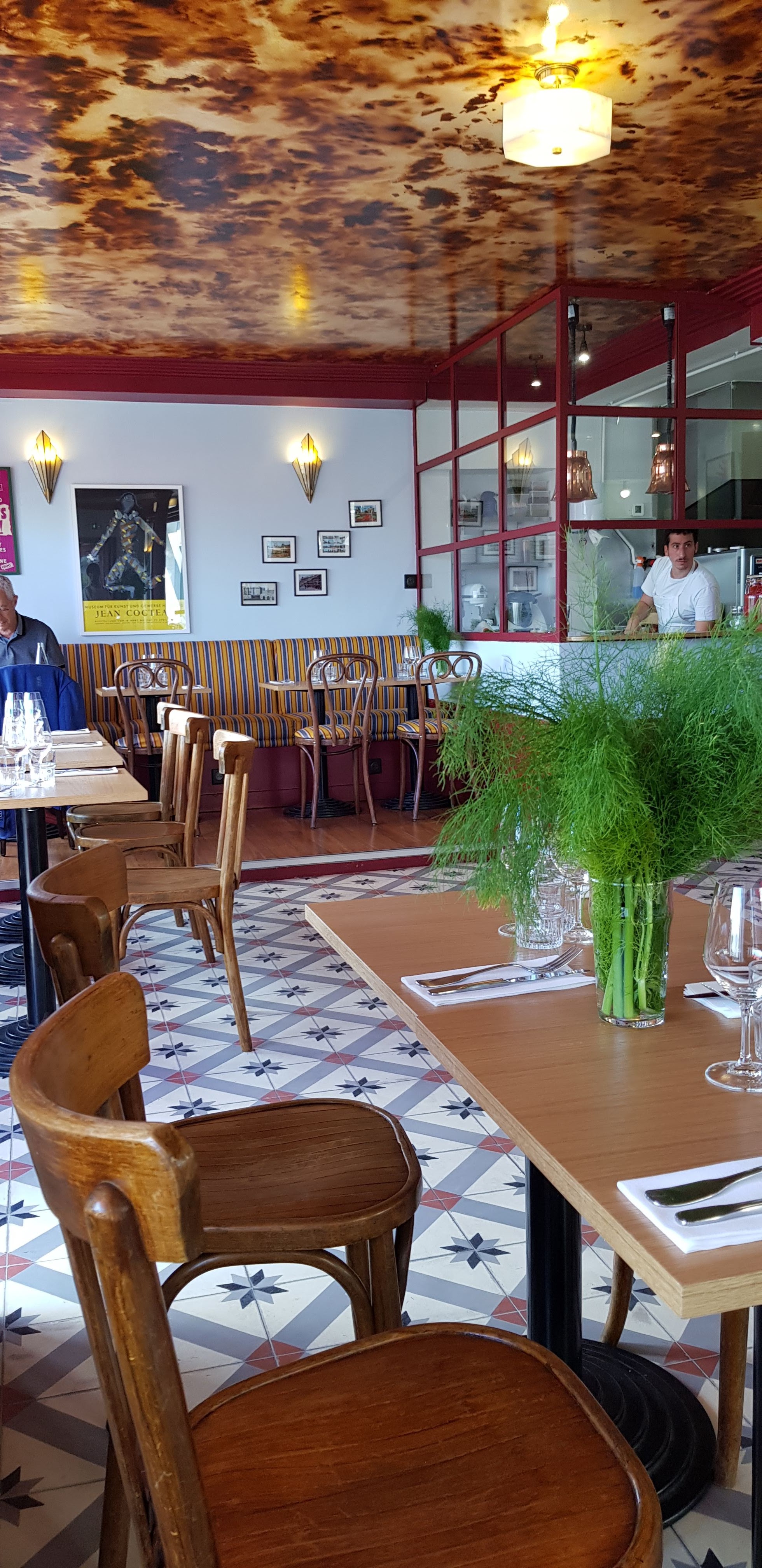 Nous n'avons pas eu l'occasion de goûter à la cuisine puisque nous avons fait l'affront à l'équipe en place du vendredi de venir à 6 au lieu de 5 comme selon la réservation... Si le service nous a gentiment permis de payer notre bouteille en attendant le dernier couple d'amis, ils n'ont pas réussi à envisager de nous servir dans une terrasse complètement vide puisque nous étions avec un invité supplémentaire... Ils ont eu la gentillesse de lui laisser payer la bouteille avant de lui demander (et donc nous avec) de quitter mles lieux... On se faisait une joie de goûter les roses de veau... on a fini au bouillon chartier...