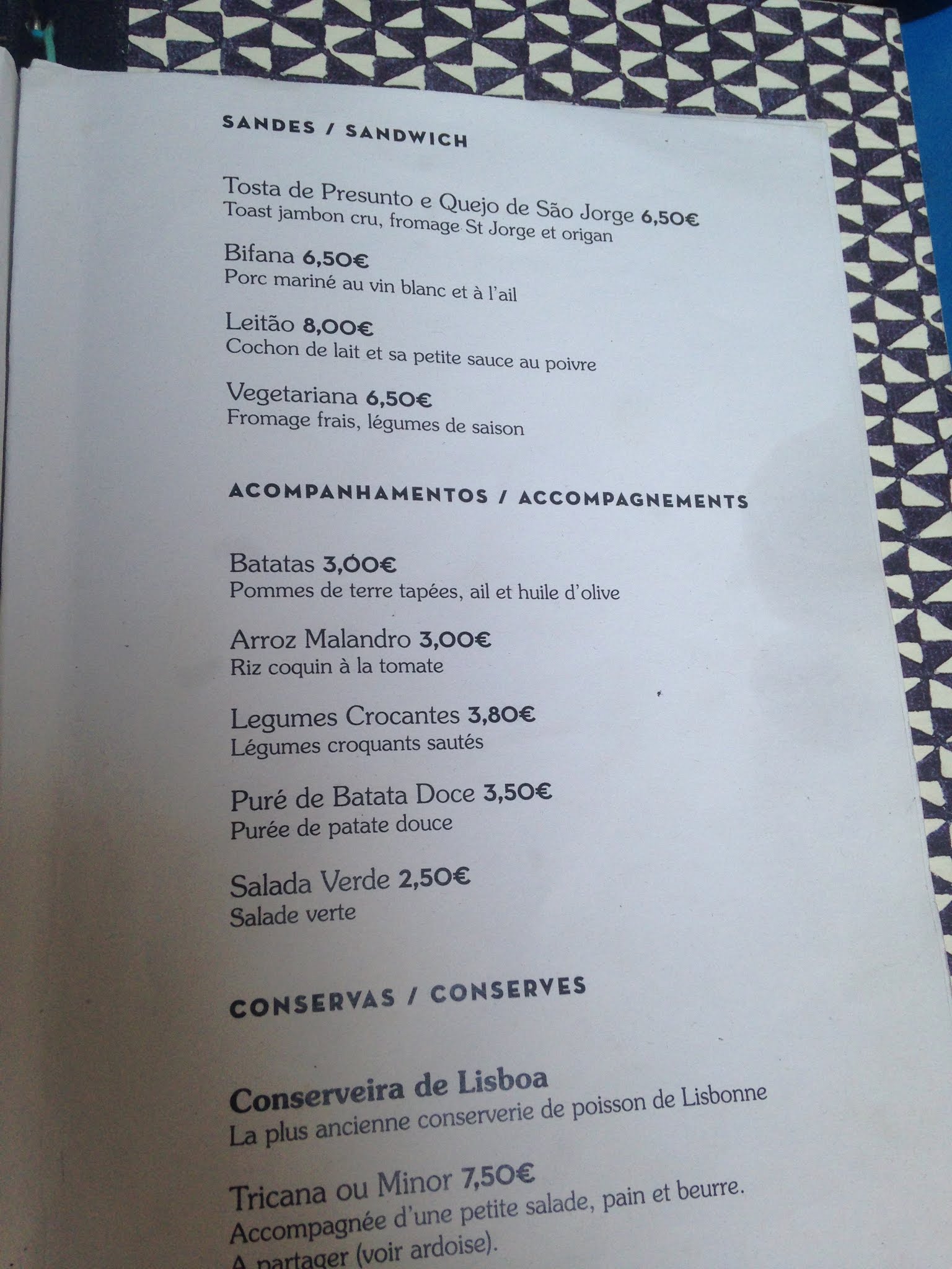 Nous sommes passés pour prendre des plats à emporter, pendant la préparation le patron nous a donner à grignoter du pain avec de la pâte de sardine (très bon) avec un verre d'eau, sans que l'on demande quoi que soit, j'ai pu discuter avec lui pendant l'attente très sympa, ensuite lorsqu'il nous a servi notre commande il a rajouter pasteis de nata gratuitement. Nous avons tout apprécié c'était très bon, je recommande fortement, le cadre est très sympa en plus