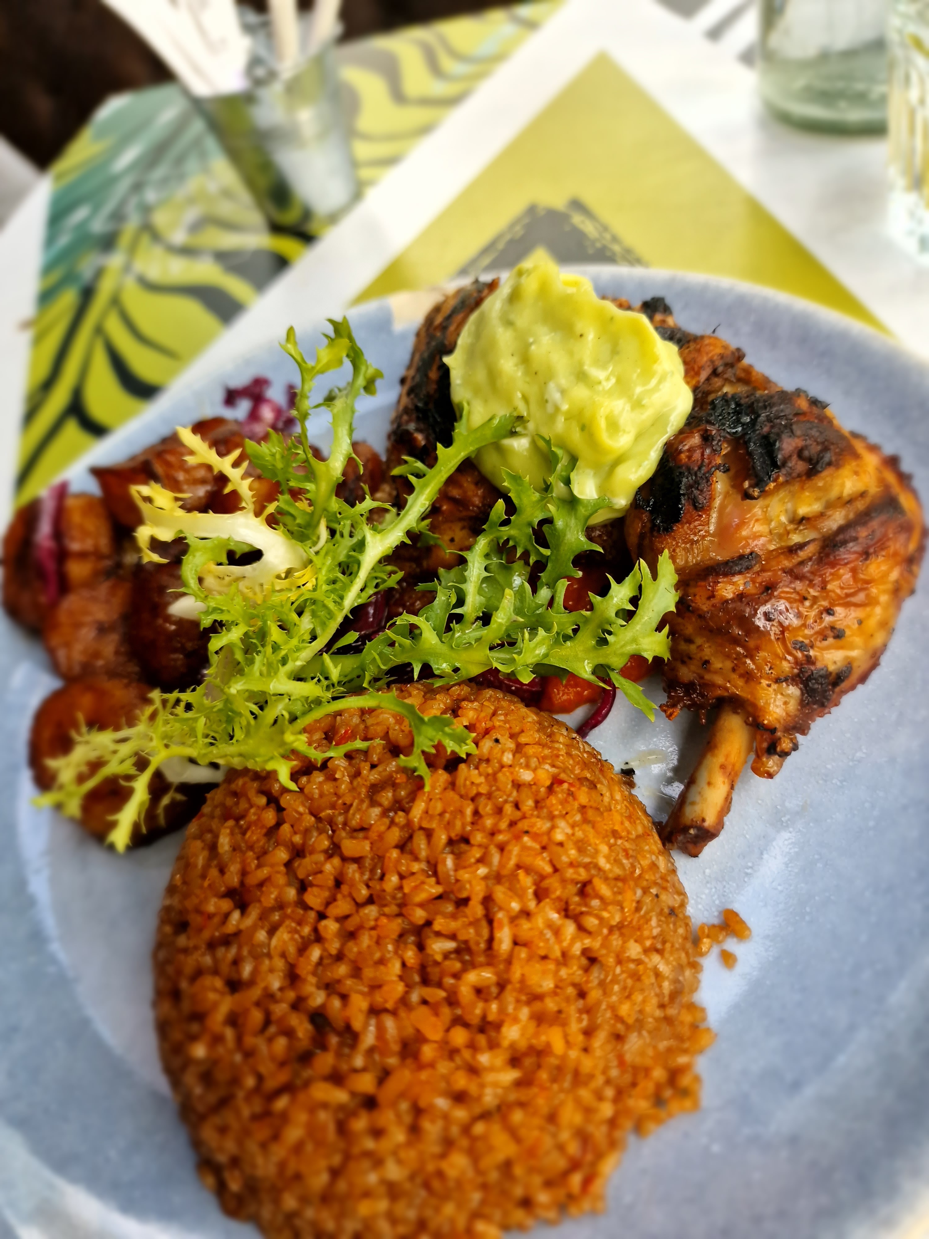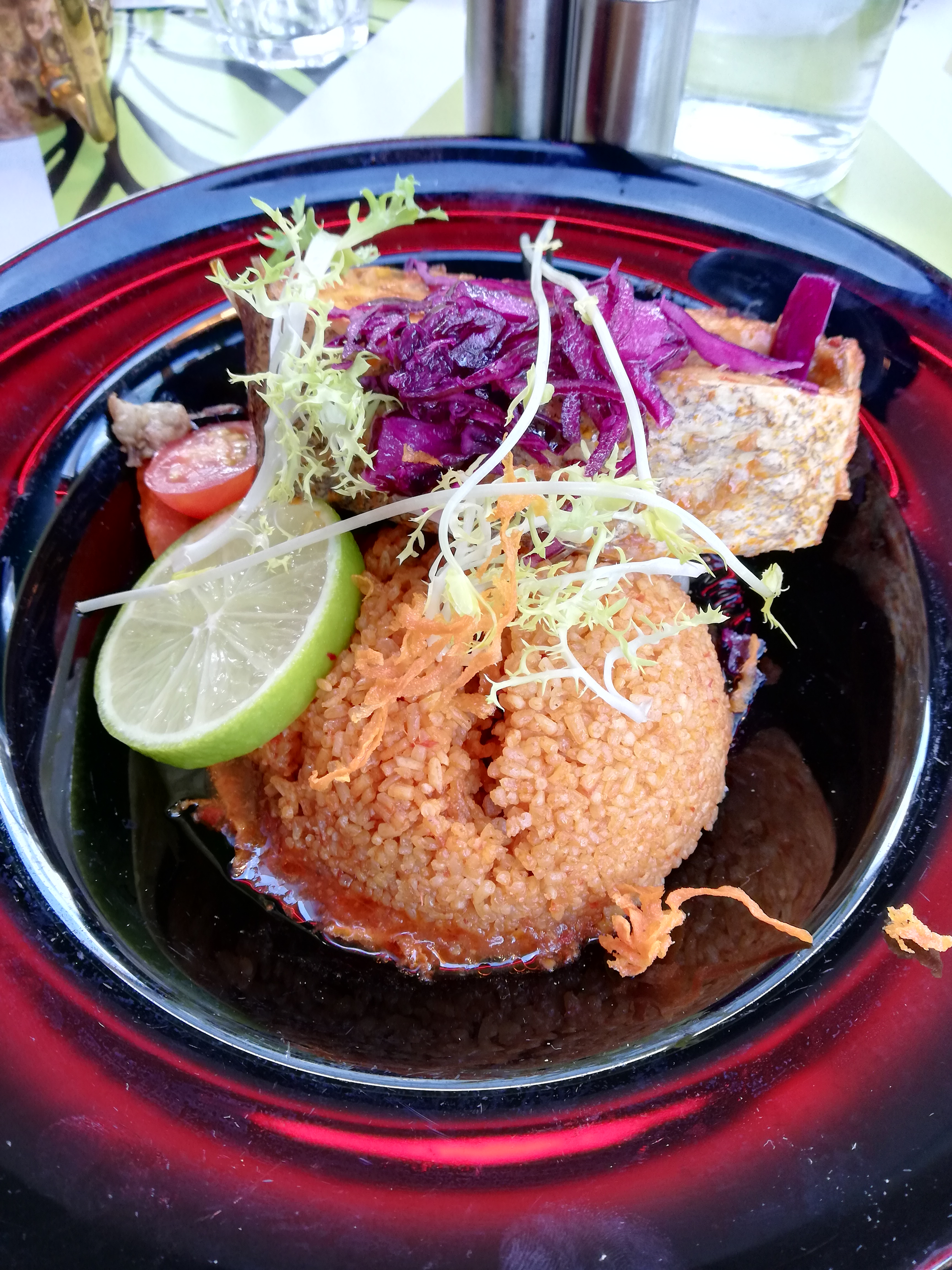 Déco très sympa, service attentionné et efficace. Repas servi copieusement, les allocos , accras et frites de patates douces excellent, manque un peu plus de légumes dans le thieb, super musique mais un peu trop haut en volume. On a passé un super moment et merci pour le digestif détox offert qui a été très efficace.