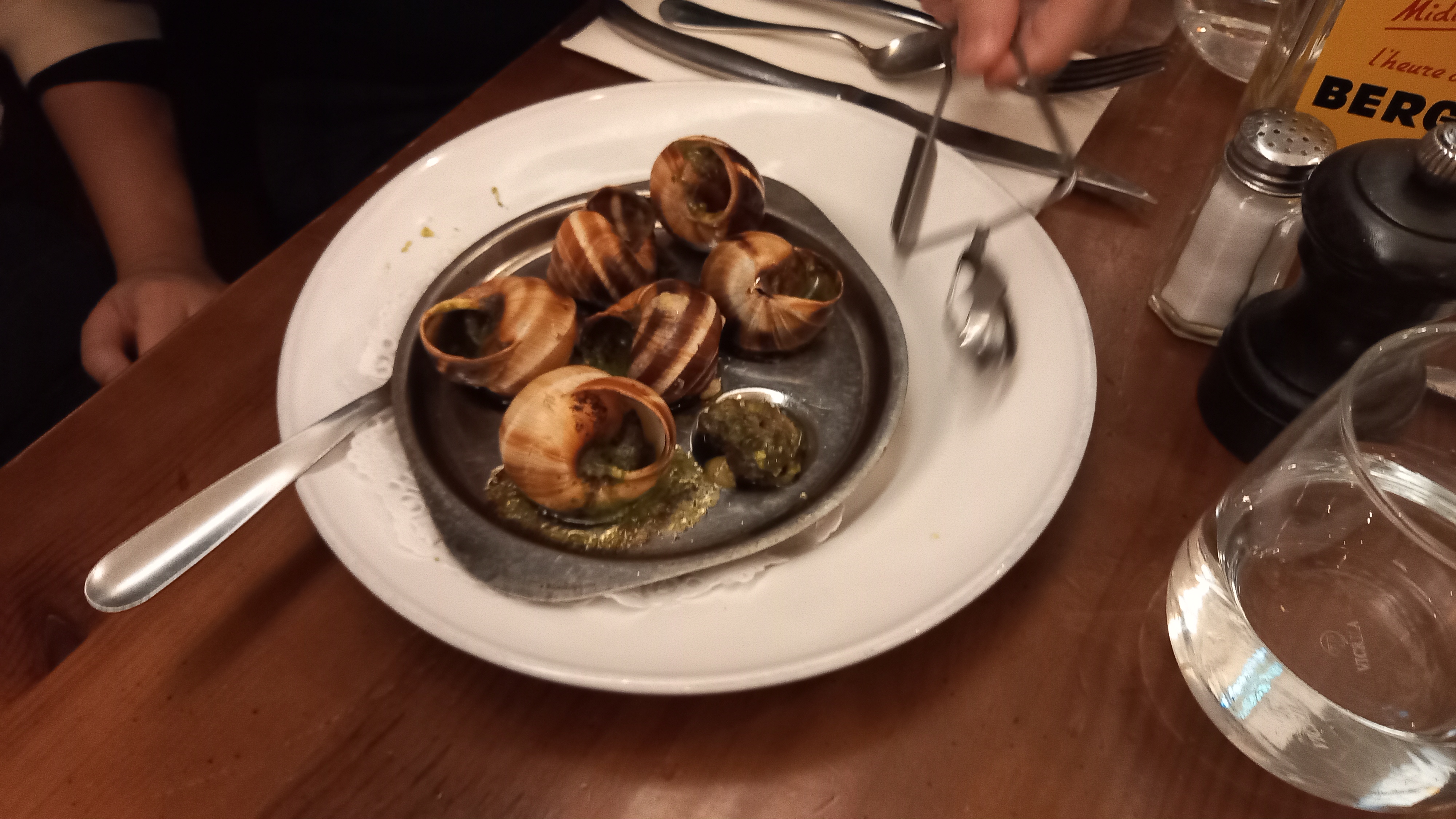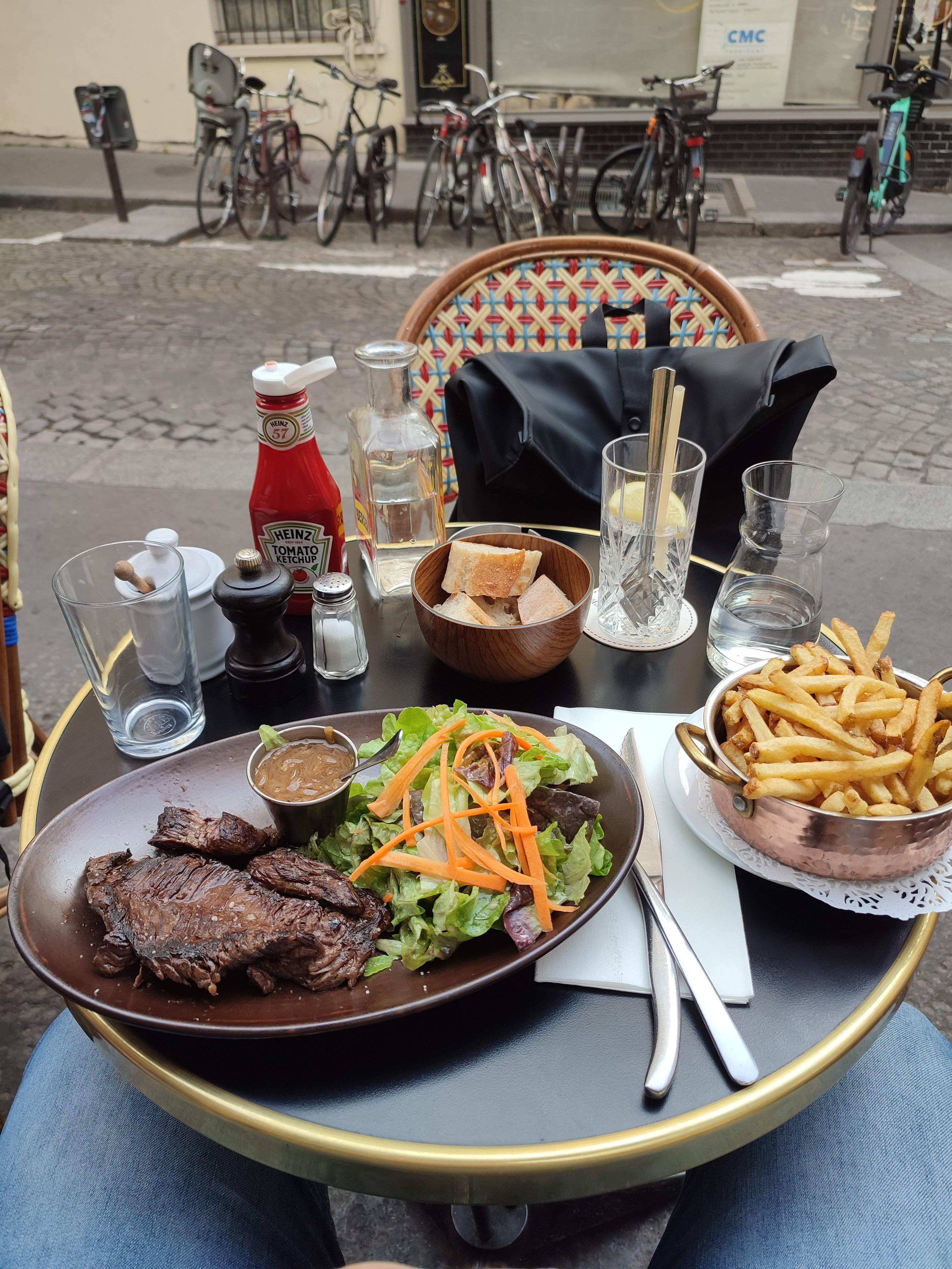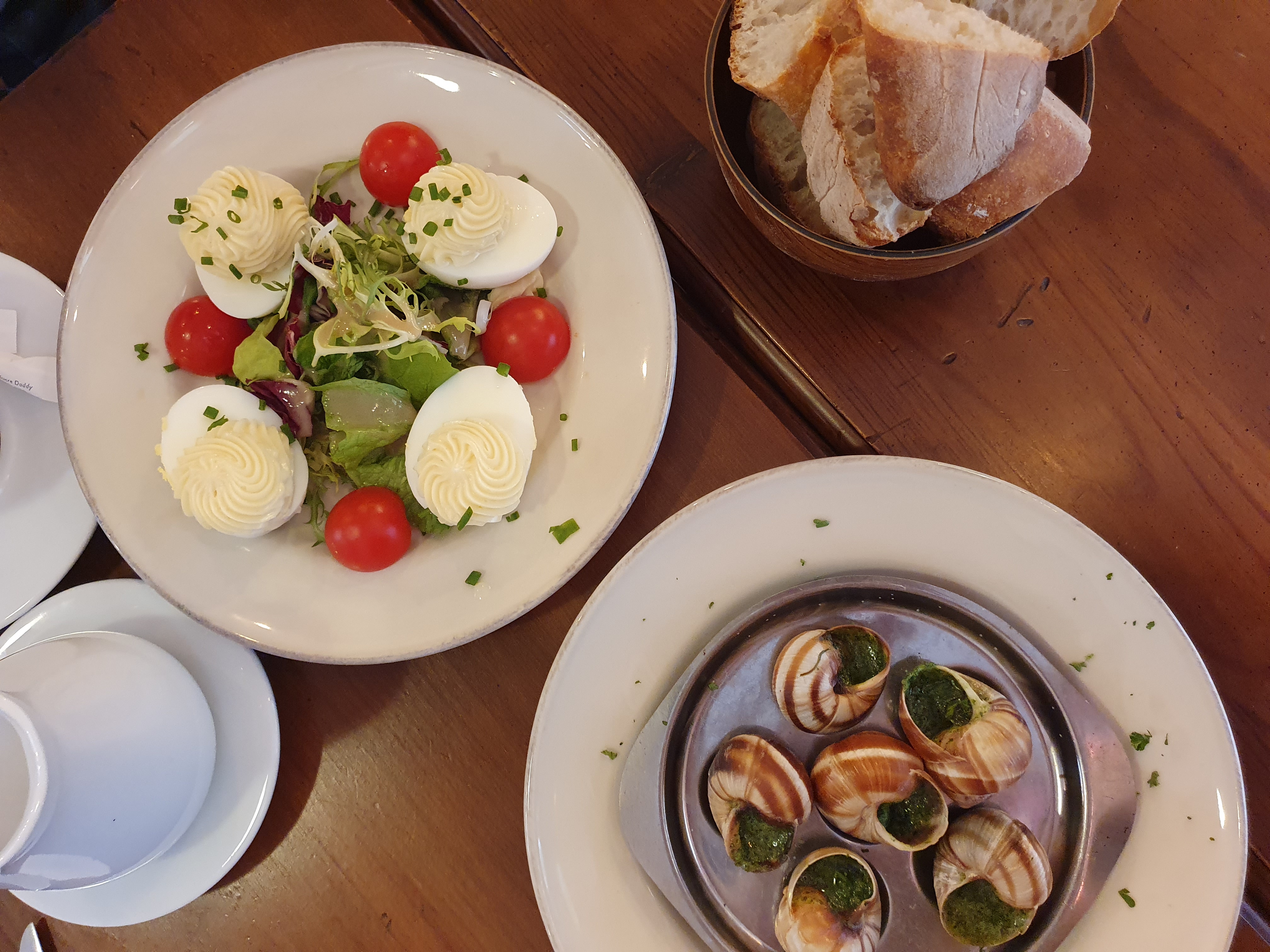 Nous avons mangé différents plats français : soupe à l'oignon, escargots, os à moelle et aussi steak frites. La nourriture était bonne, le service était très bon.