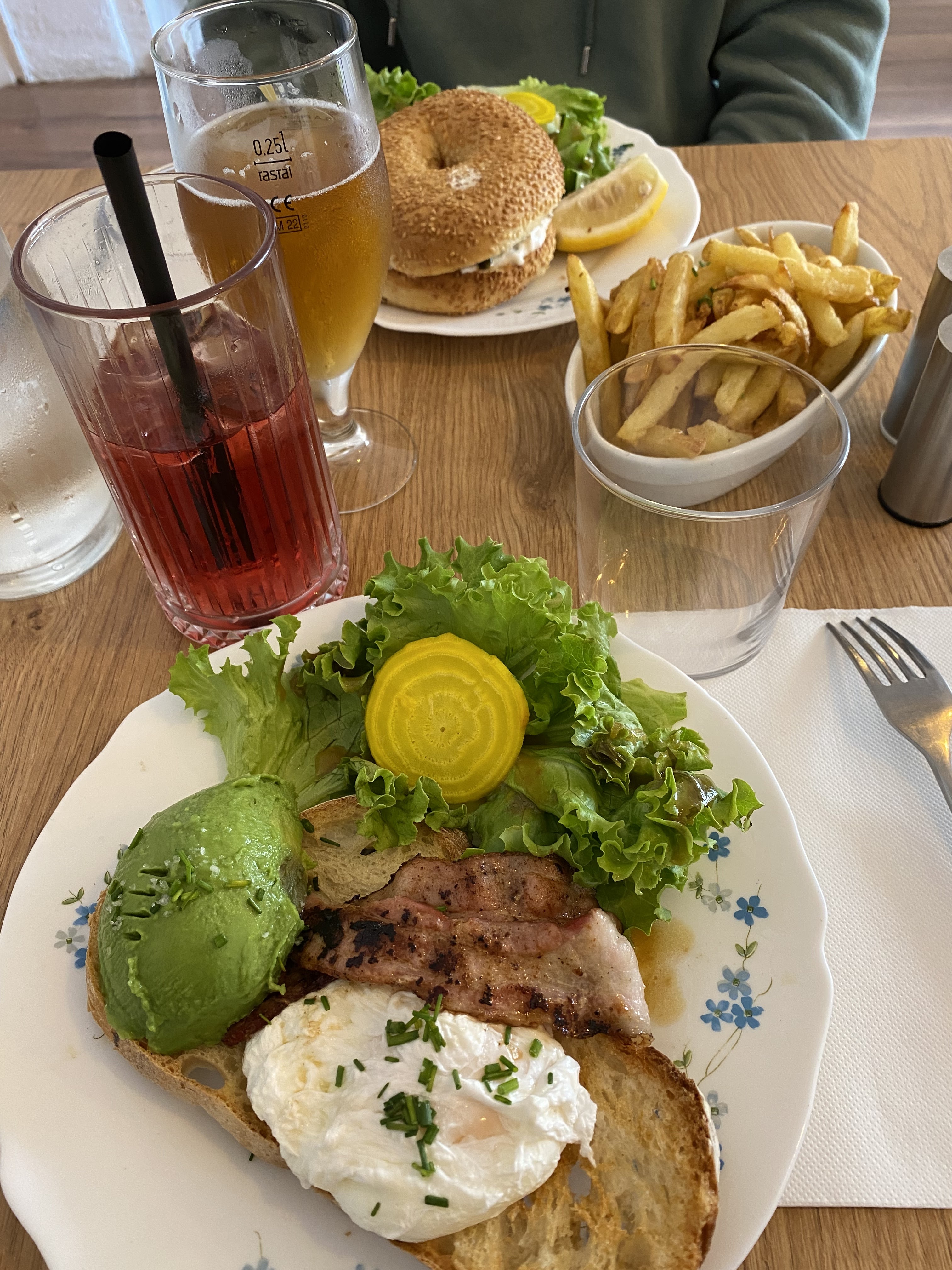 Nous avons pris le pain perdu salé et le pig (avocado toast) avec des frites et un smoothie tout était délicieux ! A refaire !