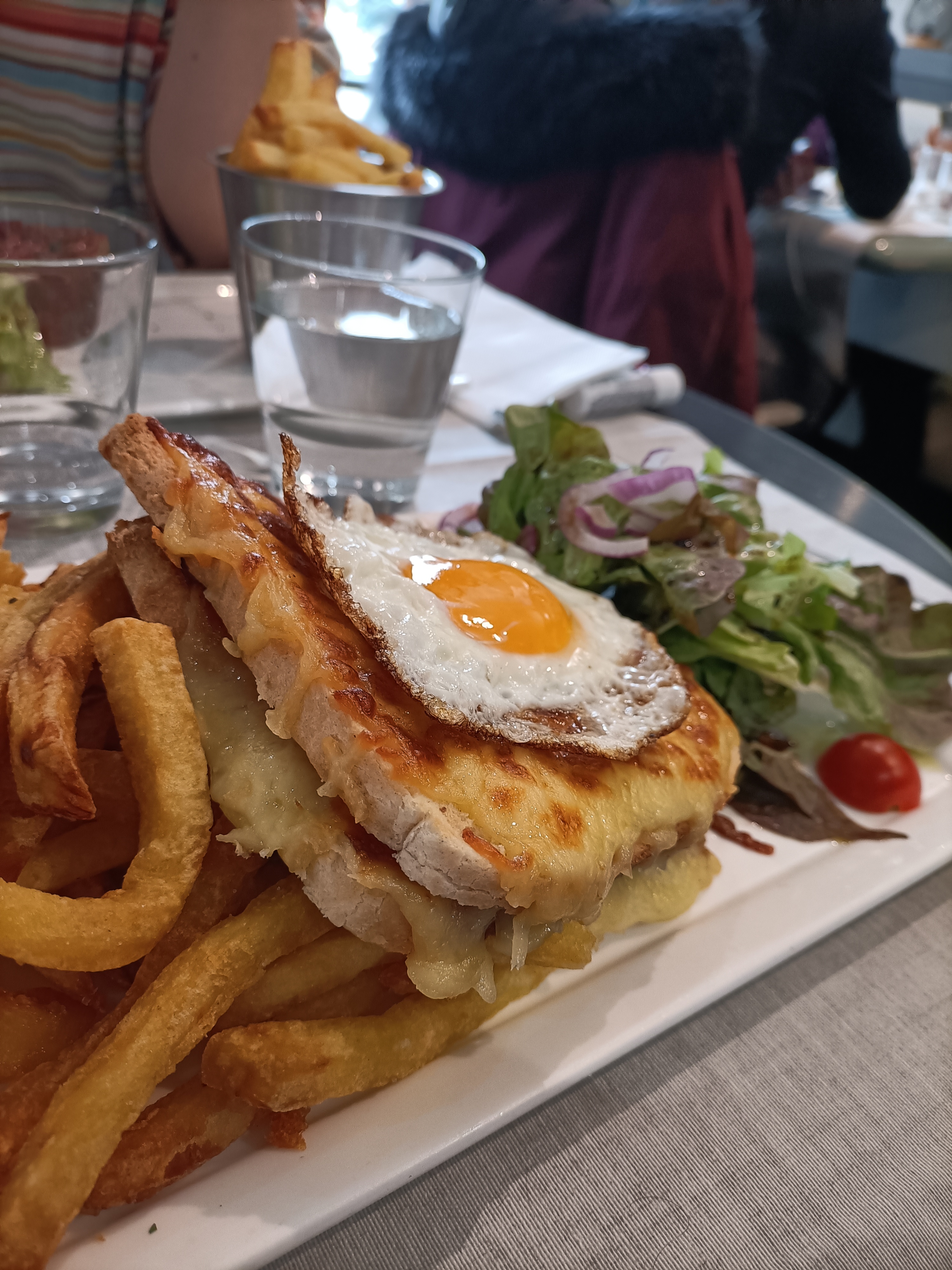 Croque Madame bien cheesy des familles servi avec une bonne dose de frites. Les frites n'avaient même pas besoin de ketchup, ça en dit assez sur leur texture bien fondante de l'intérieur, et finement croustillante sur les parois extérieures de la patate. Pour finir en beauté, une salade bien dosée au vinaigre Je recommande vivement si vous cherchez une brasserie typiquement french 👨🍳