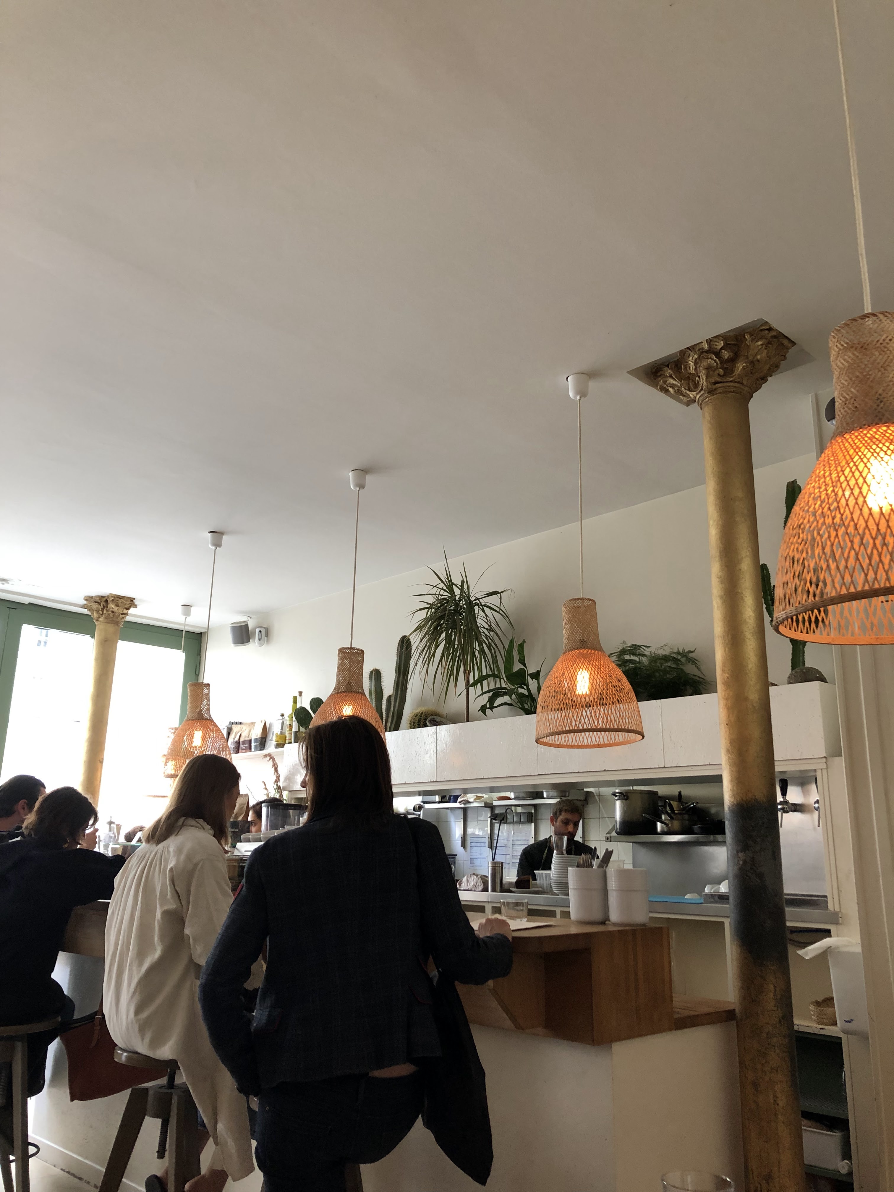 un espace lumineux et animé avec une shakshuka incroyable et un propriétaire sympathique qui semble être simultanément ici et dans son autre café, le café oberkampf, 100% du temps. le café est un peu cher, mais ça vaut le coup de soutenir ce petit établissement.