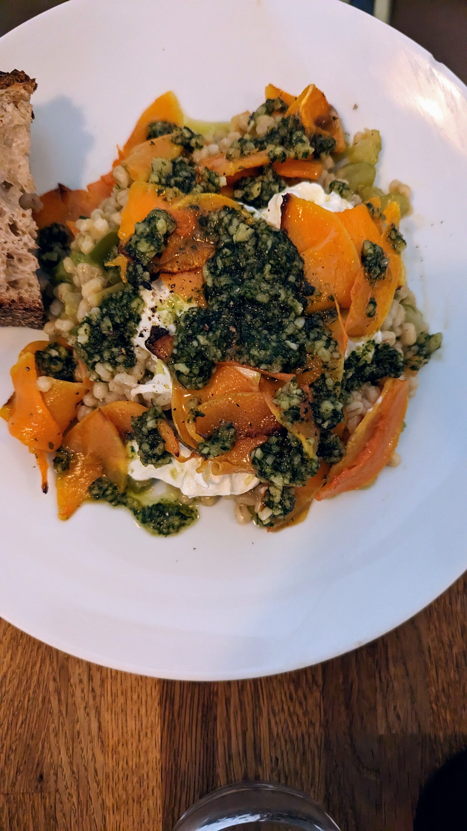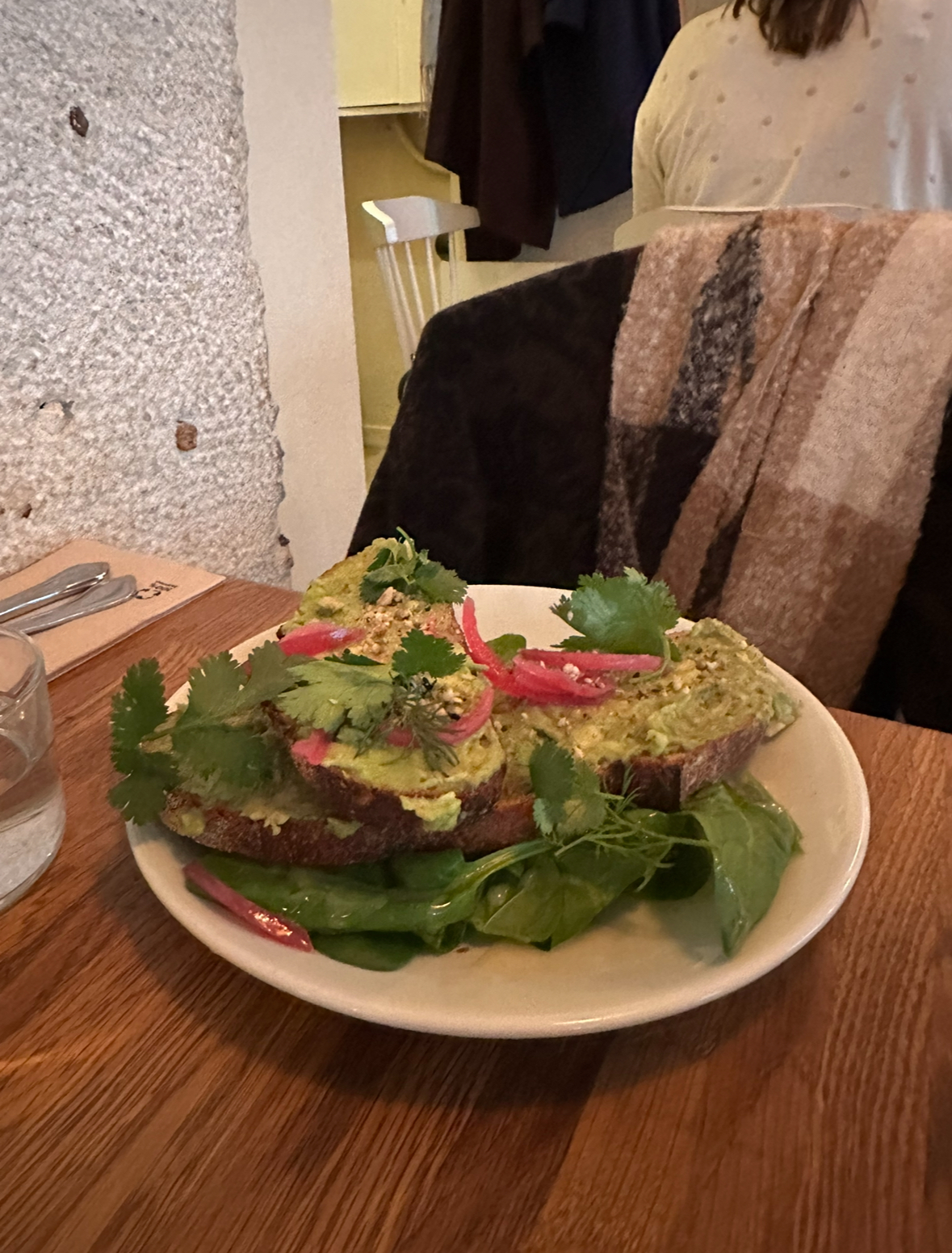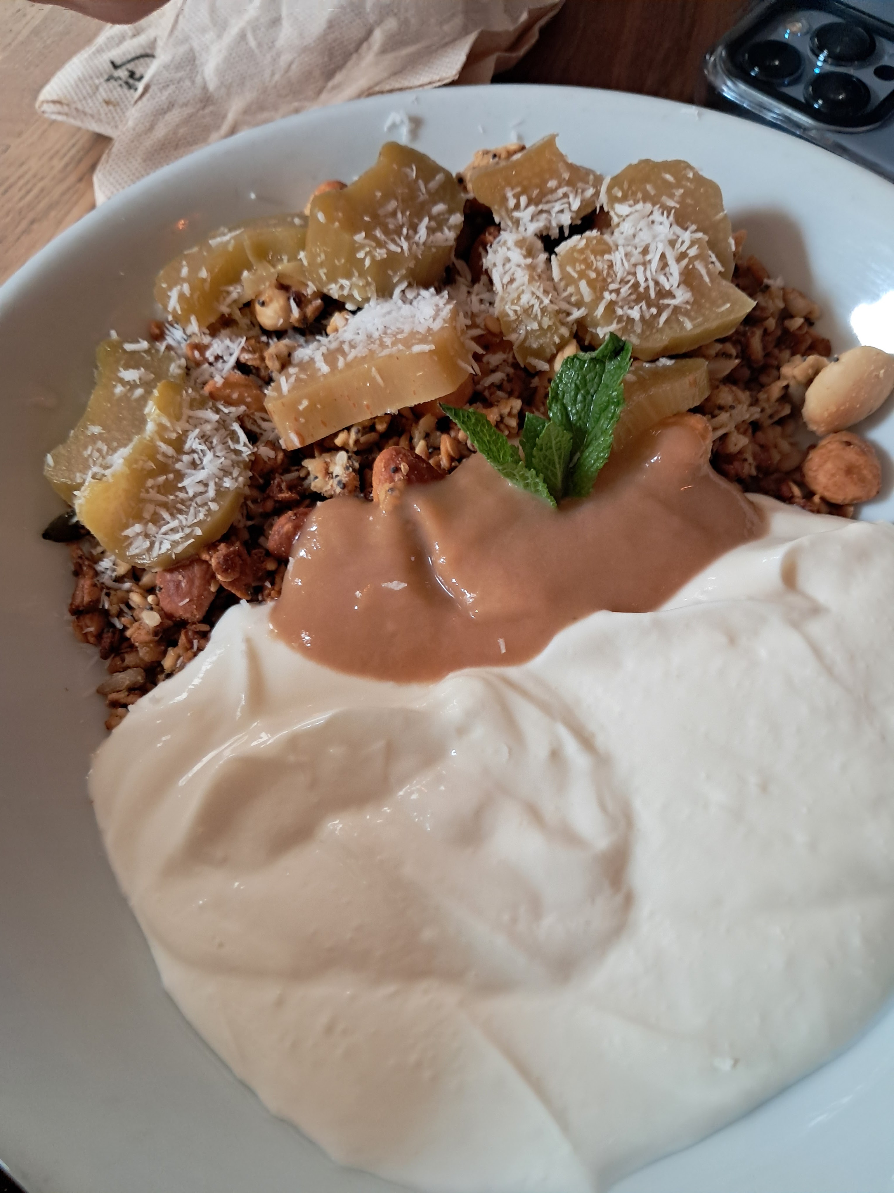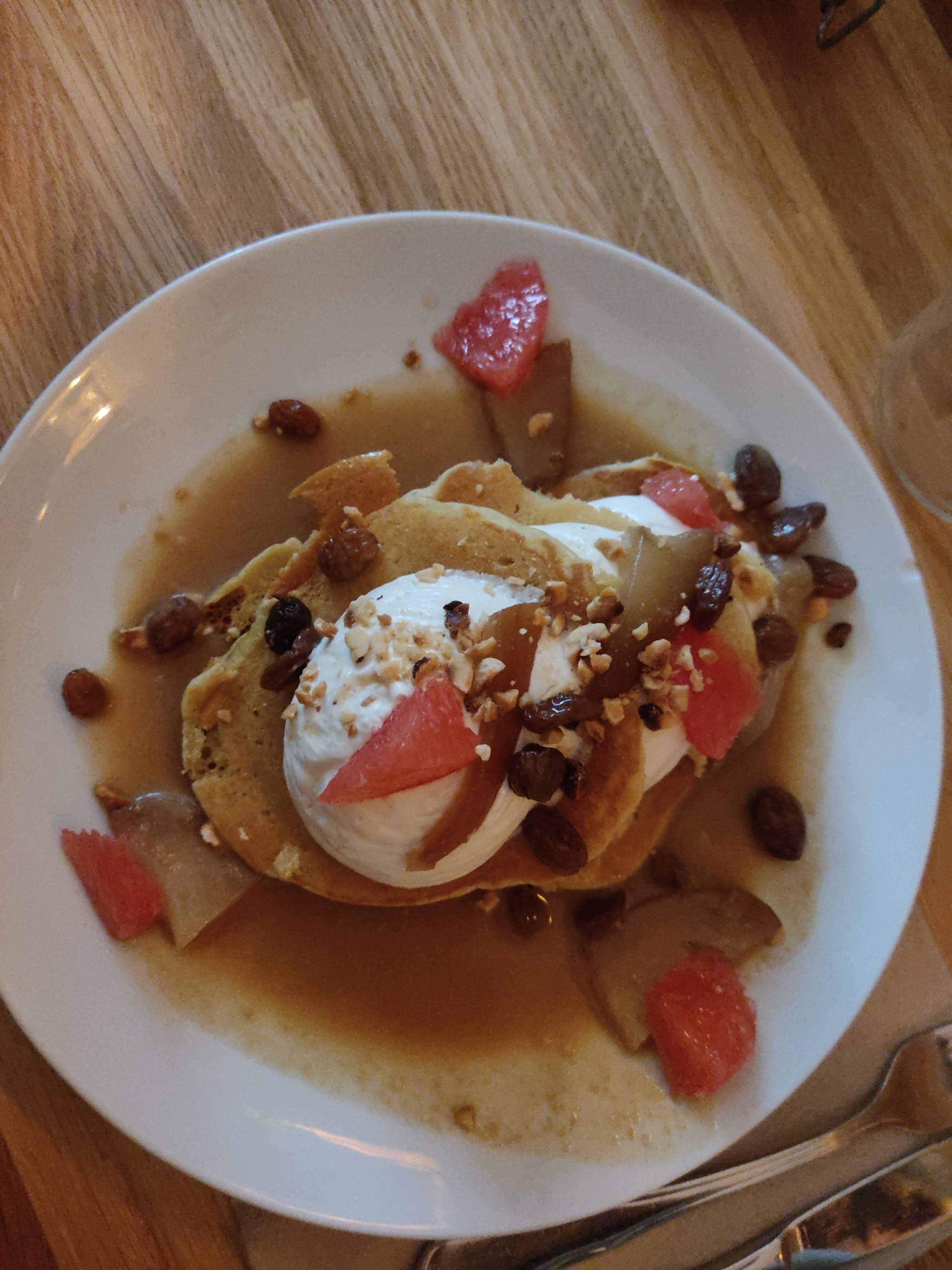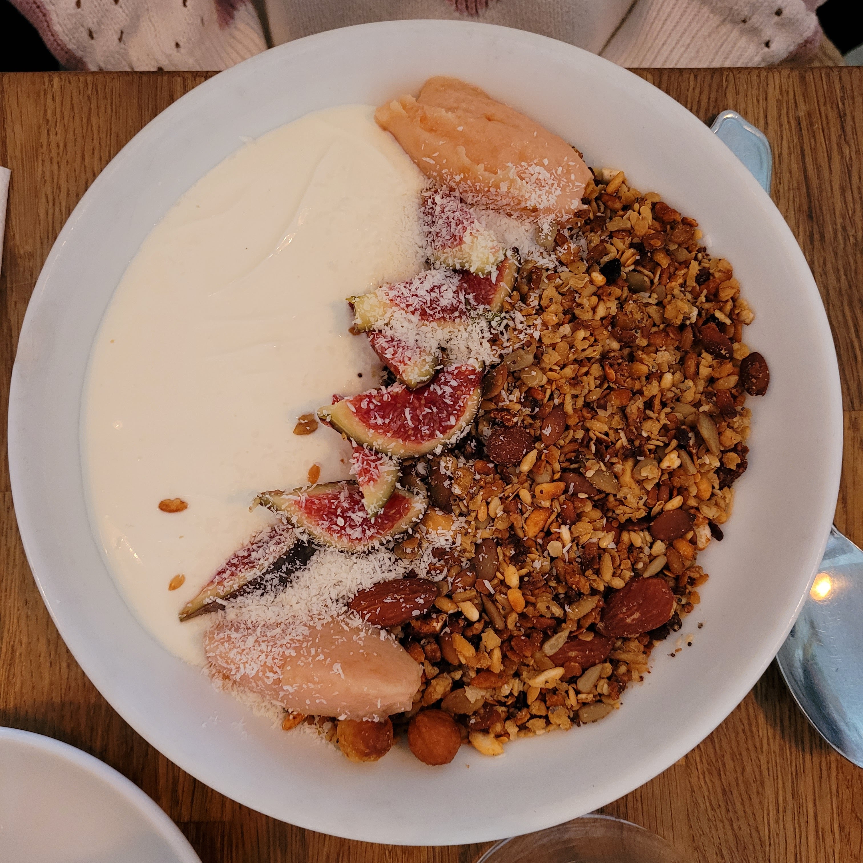 En tant que couple californien, nous aimons les délicieux petits-déjeuners et brunchs avec des légumes et de bons ingrédients. Nous avons été époustouflés par les œufs verts (comme une shakshuka verte !) et le granola salé. En dessert nous avons eu un crumble aux figues et pommes avec de la crème qui nous a réchauffé jusqu'au fond du cœur. Le personnel était également très chaleureux et sympathique avec nous. Recommande fortement!