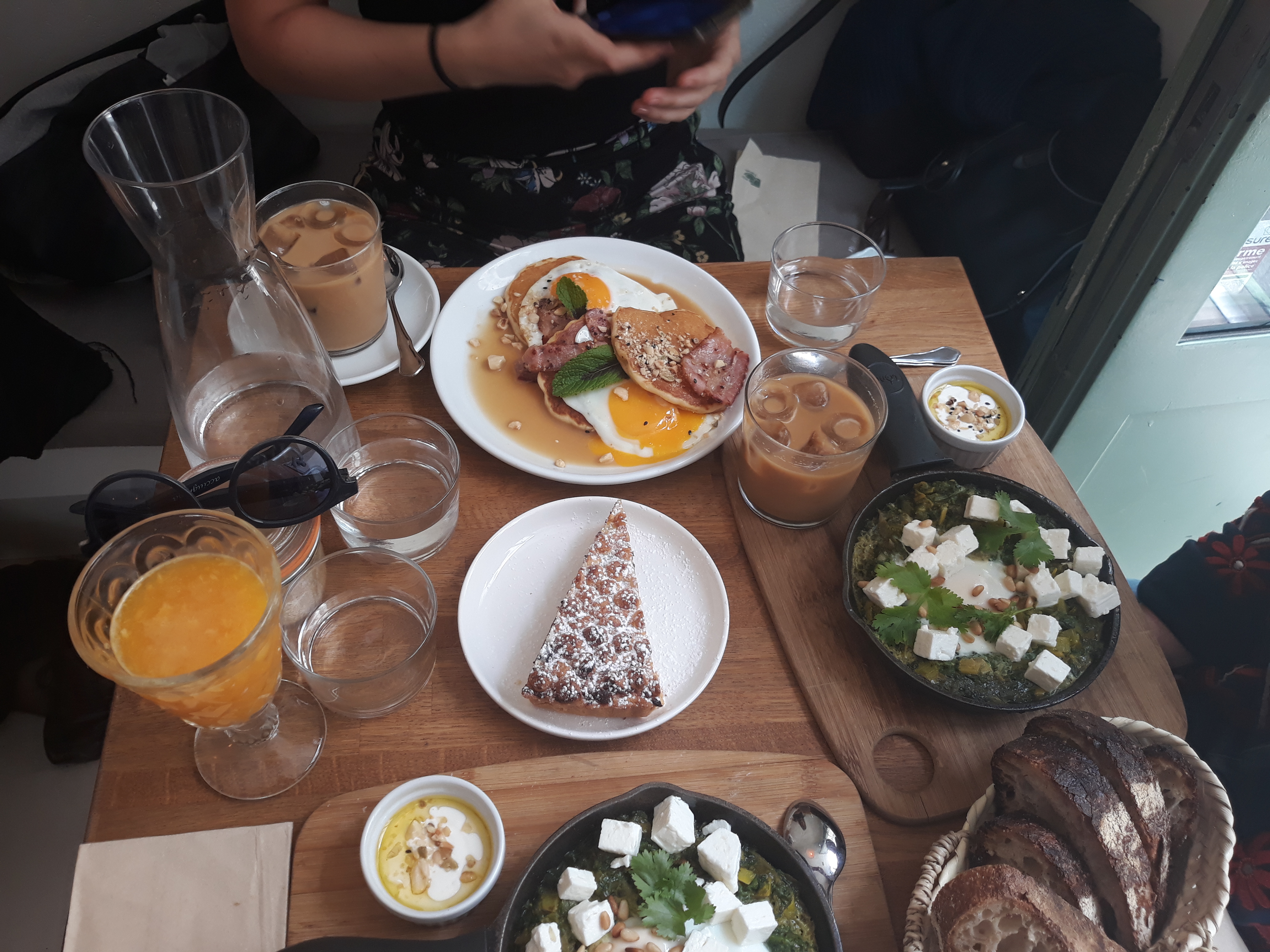 Très joli et personnel souriant, aimable et aux petits soins, MAIS bruyant (notamment car rempli de filles type blogueuses mode et Instagram models -_-). La nourriture est bonne, les prix sont abordables dans l'ensemble mais au final ça fait cher pour ce qu'on a : 5€ le chaï servi ds un verre duralex ça fait un peu mal ! Pour info le brunch n'est pas un brunch à proprement parler : on prend les plats à la carte, pas de combo avec des boissons chaudes ou des jus de fruit. Néanmoins les plats qu'on a pris (shakshuka et green eggs & feta) étaient vraiment bons et on n'avait plus très faim après, petite place pour un dessert mais là 1/2 déception : un fondant au chocolat bon, mais un gâteau choco cerise sans saveur et bien écoeurant avec le glaçage à l'américaine plein d'esbrouffe.