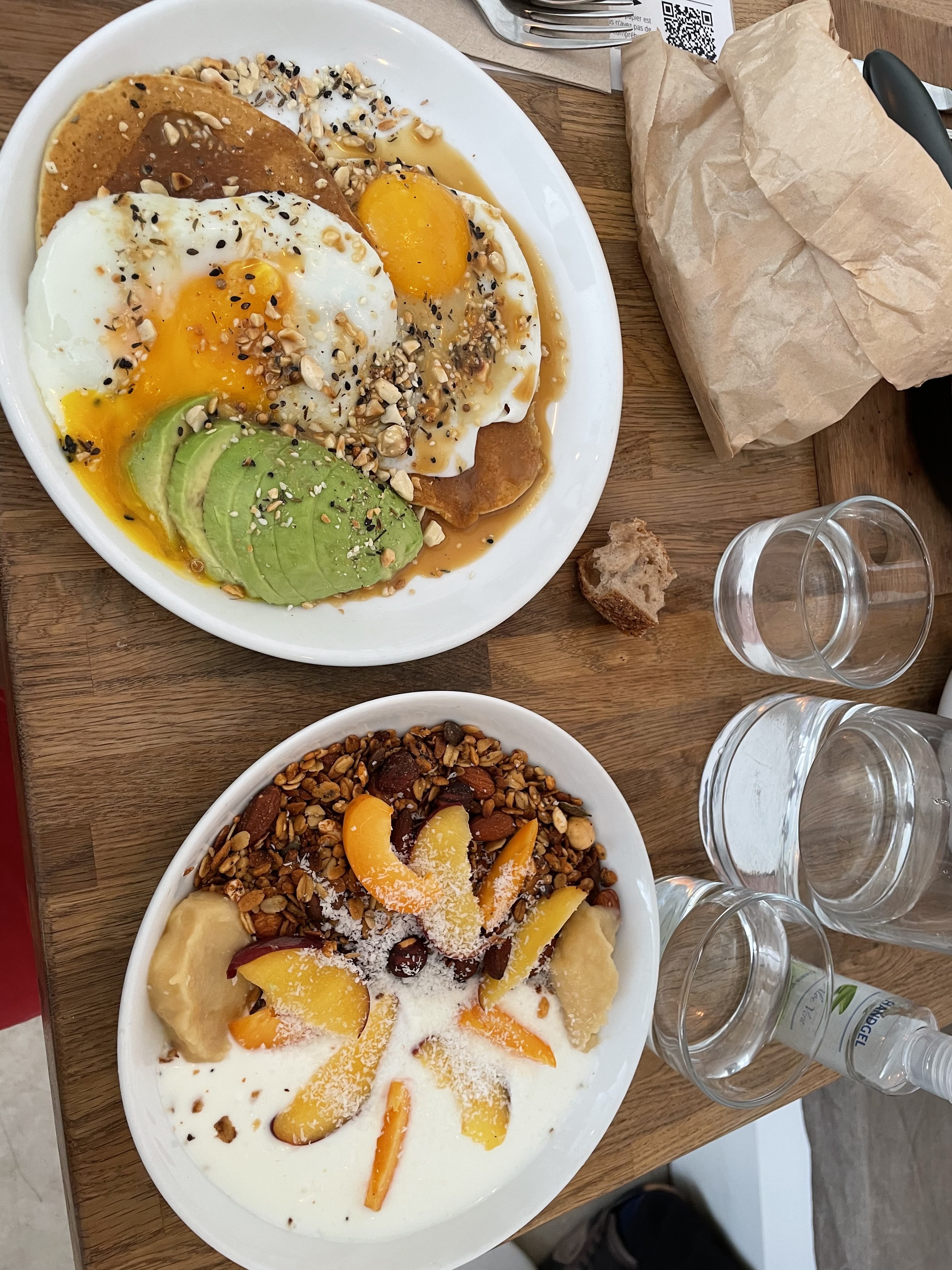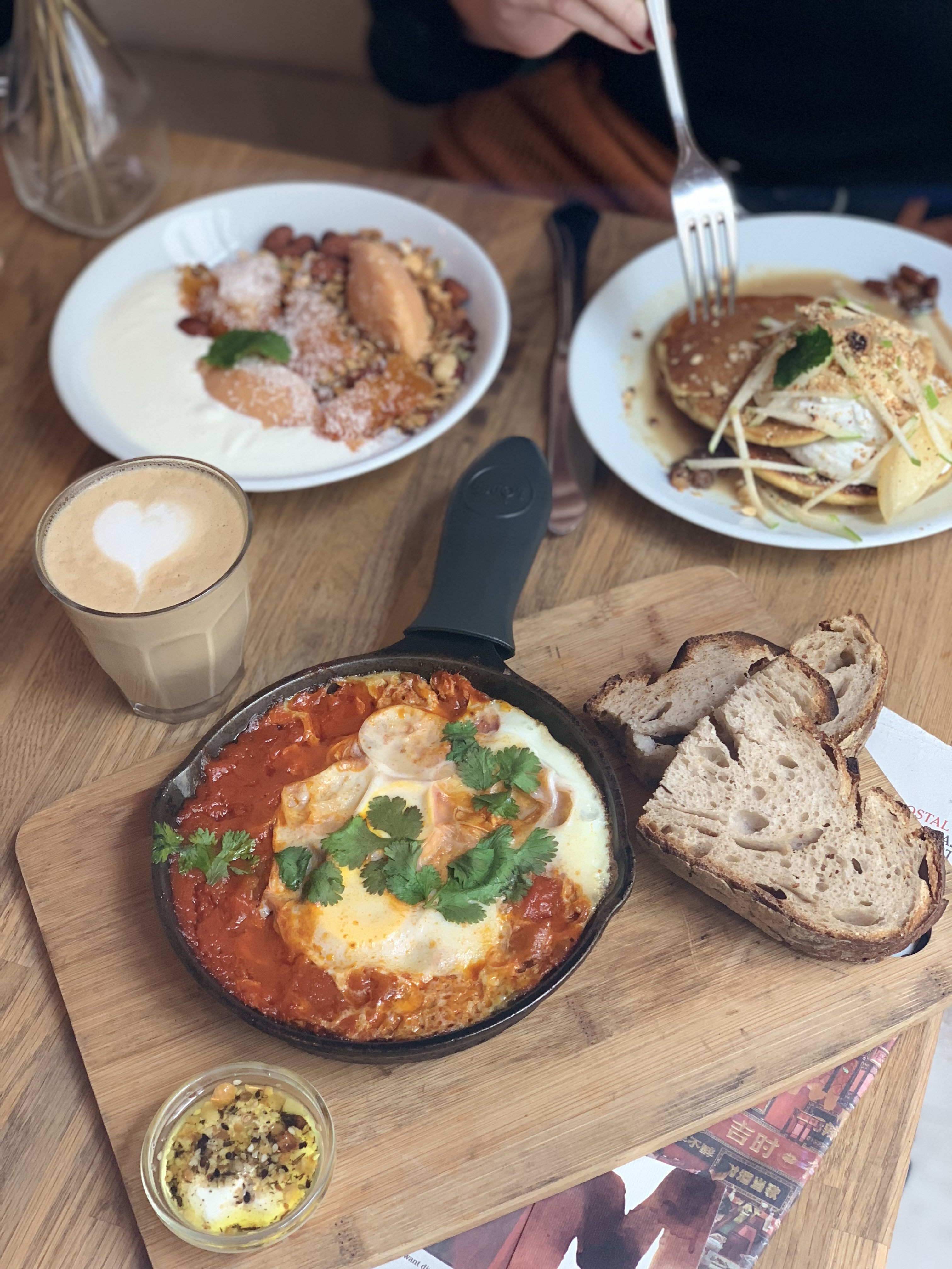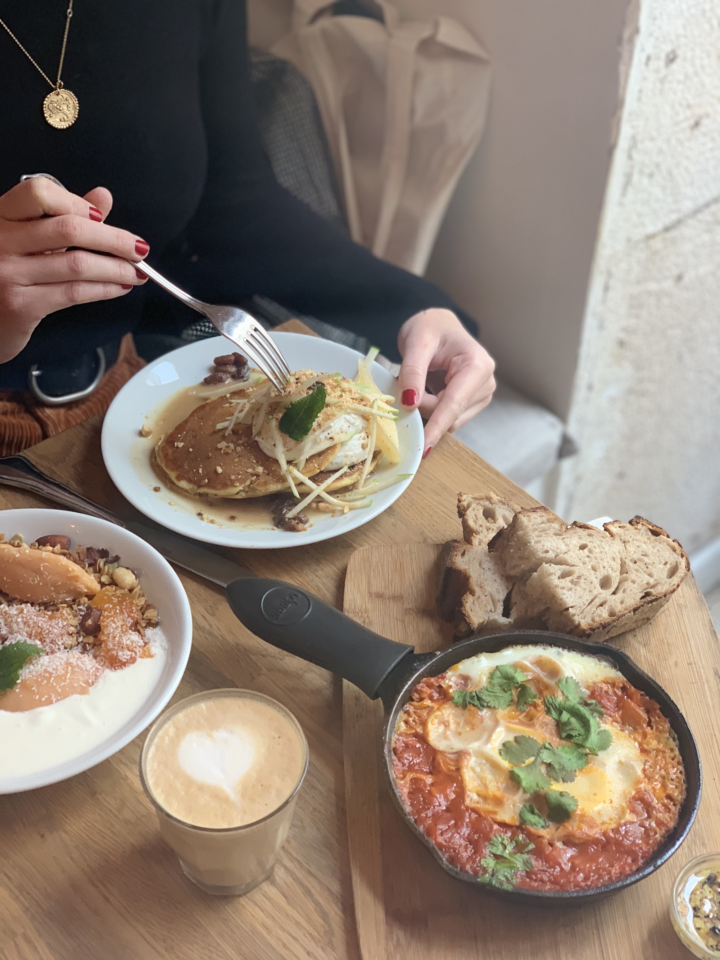 Superbe brunch : on en est ressortie pour 48,10€ pour deux avec un plat salé, une boisson et un demie plat sucré chacune (avec option sans gluten et œuf au plat pour l’avocado toast) La chachouka et le pain était trop bon, le jus aussi. Gros bémol pour les bananes dans le granola Bowl quand il y a des pommes et des mûres sur les pancakes :( Le principe de file d’attente est très ingénieux, il permet d’aller se balader en attendant qu’une place se libère. Bref si vous voulez une bonne chachouka hésitez pas