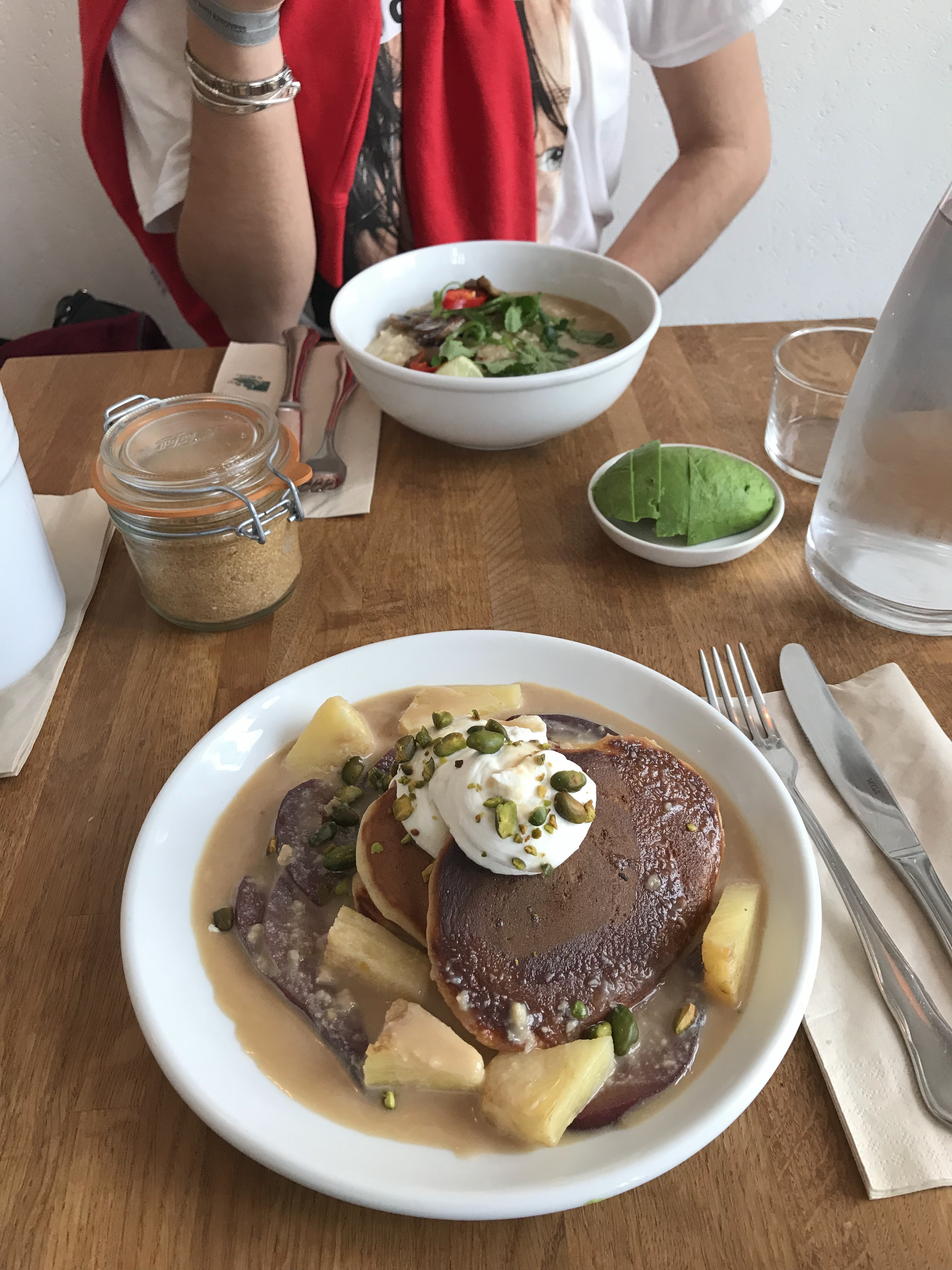C'est un endroit tellement mignon pour un brunch à Paris. J'ai adoré les crêpes à la fleur d'oranger garnies de ricotta, poires pochées, pommes et pistaches. Nous avons également aimé le petit pain du petit-déjeuner accompagné d'un œuf au plat et d'une généreuse couche de confiture de piment (donc miam) sur un petit pain brioché. Ils ont beaucoup d'options végétariennes et ce n'est pas trop cher pour Paris. Je le recommande vivement si vous êtes en ville.