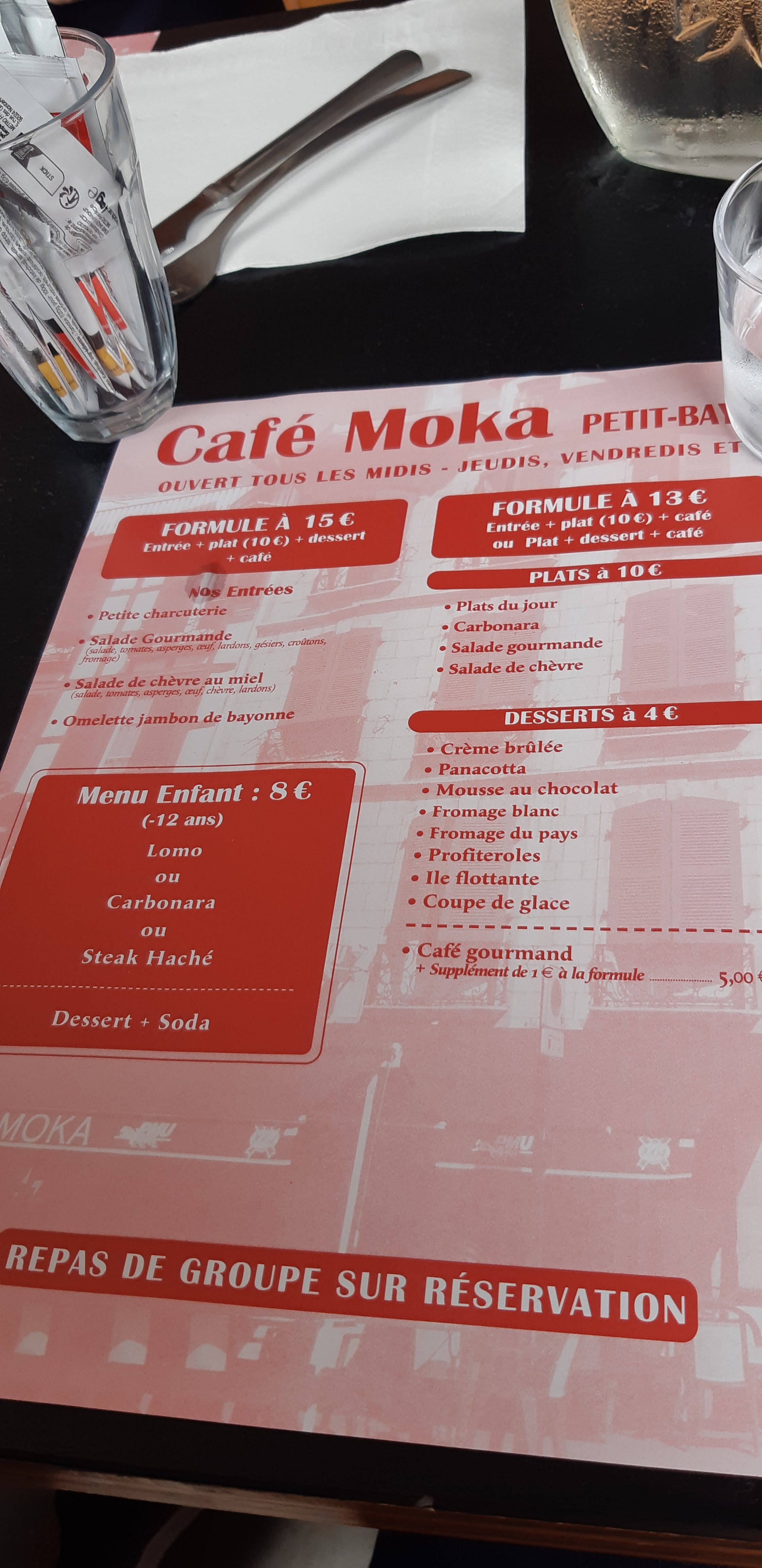 Bonsoir le Restaurant Café Moka est un resto super , nous avons pris 3 menus à 17 euros, 3 apéritifs 1 Martini Blanc , 2 Bières, ensuite 1 Chipirons à la plancha avec frites fraîches maison avec salade verte 1 tranche de fromage de Brebis , 1 Faux Filet Frites salade fromage de Brebis, 1 Merlu à l’Espagnol avec du riz salade 1 tranche de fromage de Brebis ensuite en dessert 1 Pana cota , 2 crèmes brûlées, 1 litre d’eau gazeuse Perrier , et 2 cafés le tout pour 65 euros franchement il n’y a rien à redire accueil hyper sympa , l’établissement est tenu par 2 frères entreprise familiale 1964 Le grand père, 1986 le père et depuis 3 ans les 2 jeunes , et des serveurs également, très convivial, et très agréable proche du client et toujours un mot pour rire un restaurant comme nous les aimons. Prochain passage sur Bayonne nous y retournerons avec grand plaisir.