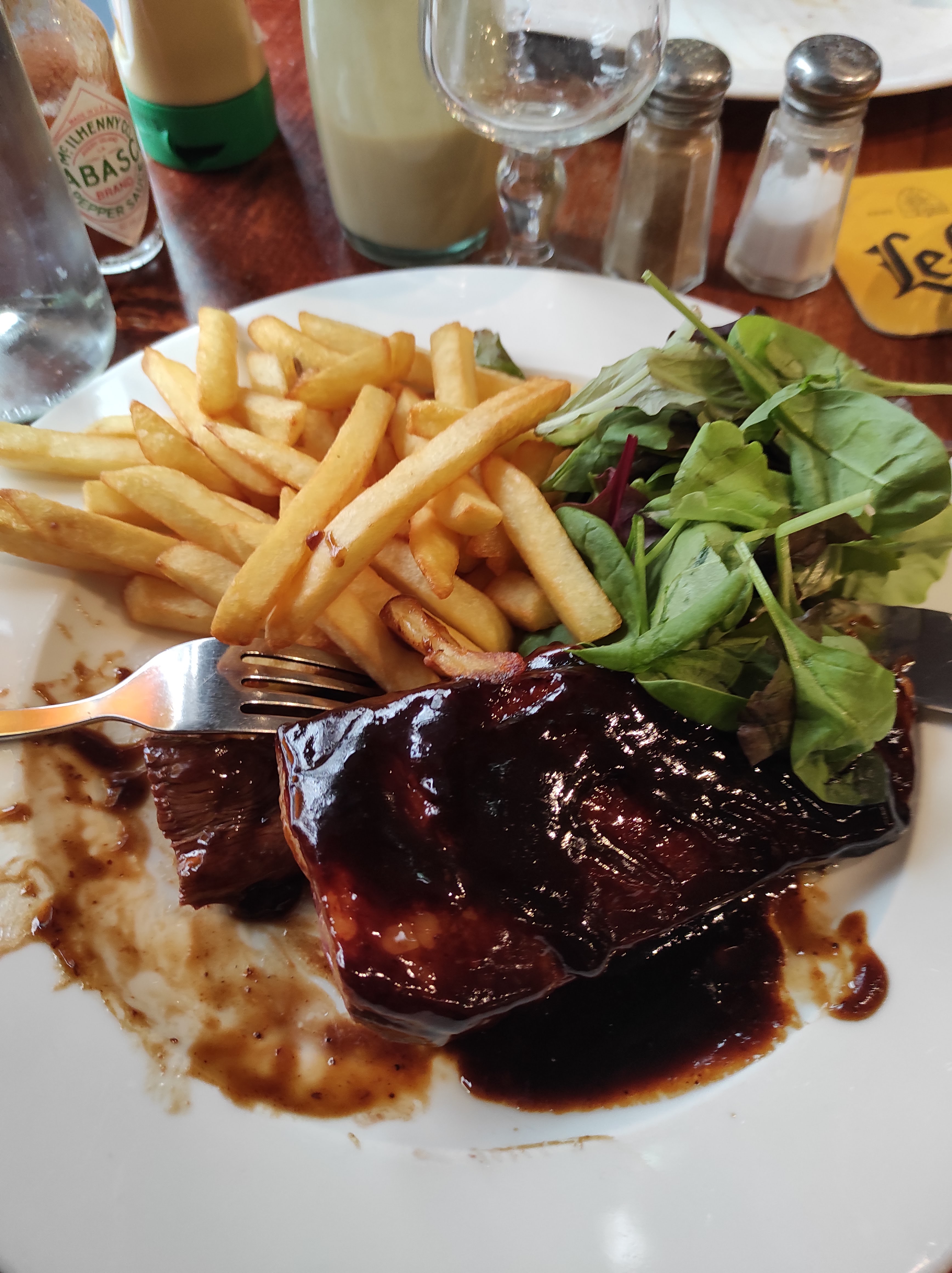 Nourriture qui a l'air de qualité hormis peut être les frite qui n'ont pas l'air dingue aussi bien visuellement qu'en bouche et le temps entre l'installation et le moment où un serveur vient vous voir, mais sinon le coin est sympa et la viande y est bonne ! 👌 Gros plus le service continue !