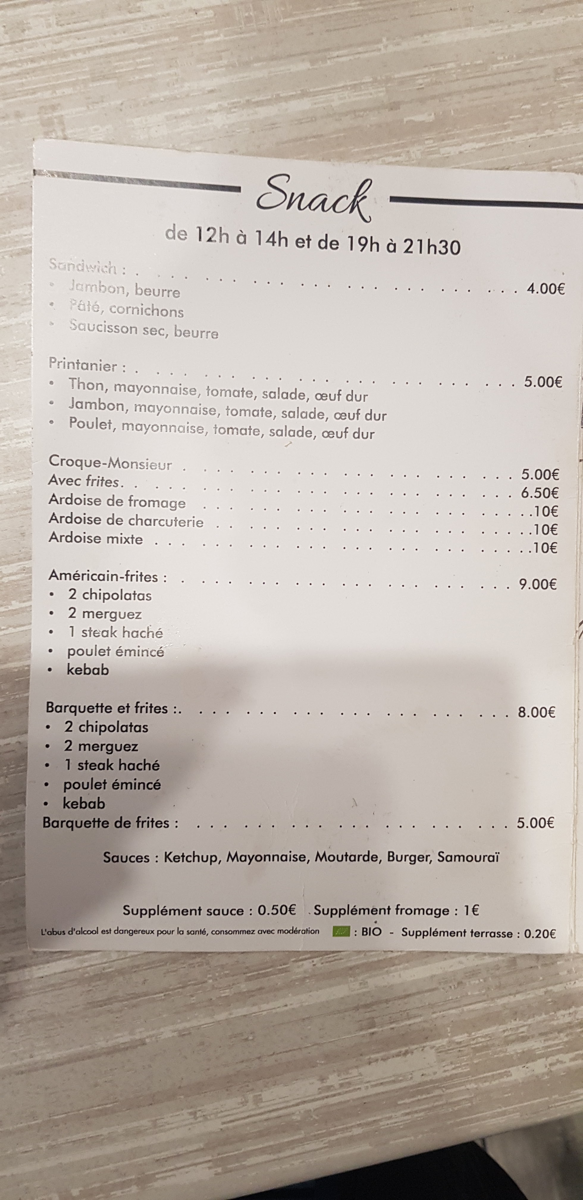 Terrasse très agréable (espère qu'elle devienne perenne car centre névralgique de la cille). Personnel sympa. Par contre j'ai pris un simple sandwich au jambon avec pain très moyen et servi dans une enveloppe papier en terrasse!!! A revoir cette prestation...