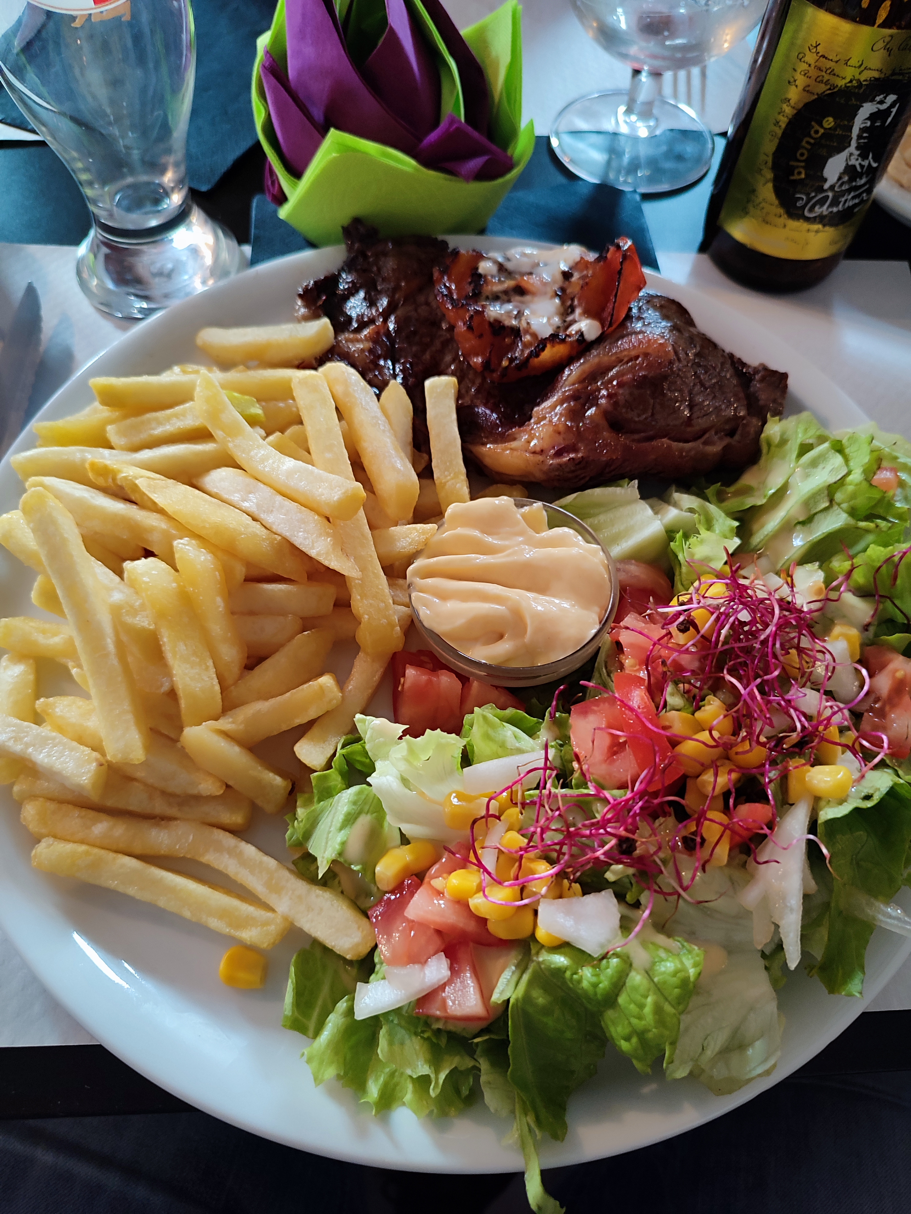 Assiette copieuse pour 15€ mais je n'ai pas réussi à manger mon steak. La pièce de viande n'etait vraiment pas bonne... un véritable chewingum. C'est de loin le pire steak que j'ai mangé au restaurant. Cependant, le personnel était accueillant et sympathique. Il faudrait peut être penser à rafraîchir un peu l'intérieur. Il y avait beaucoup de mouches dans l'établissement.
