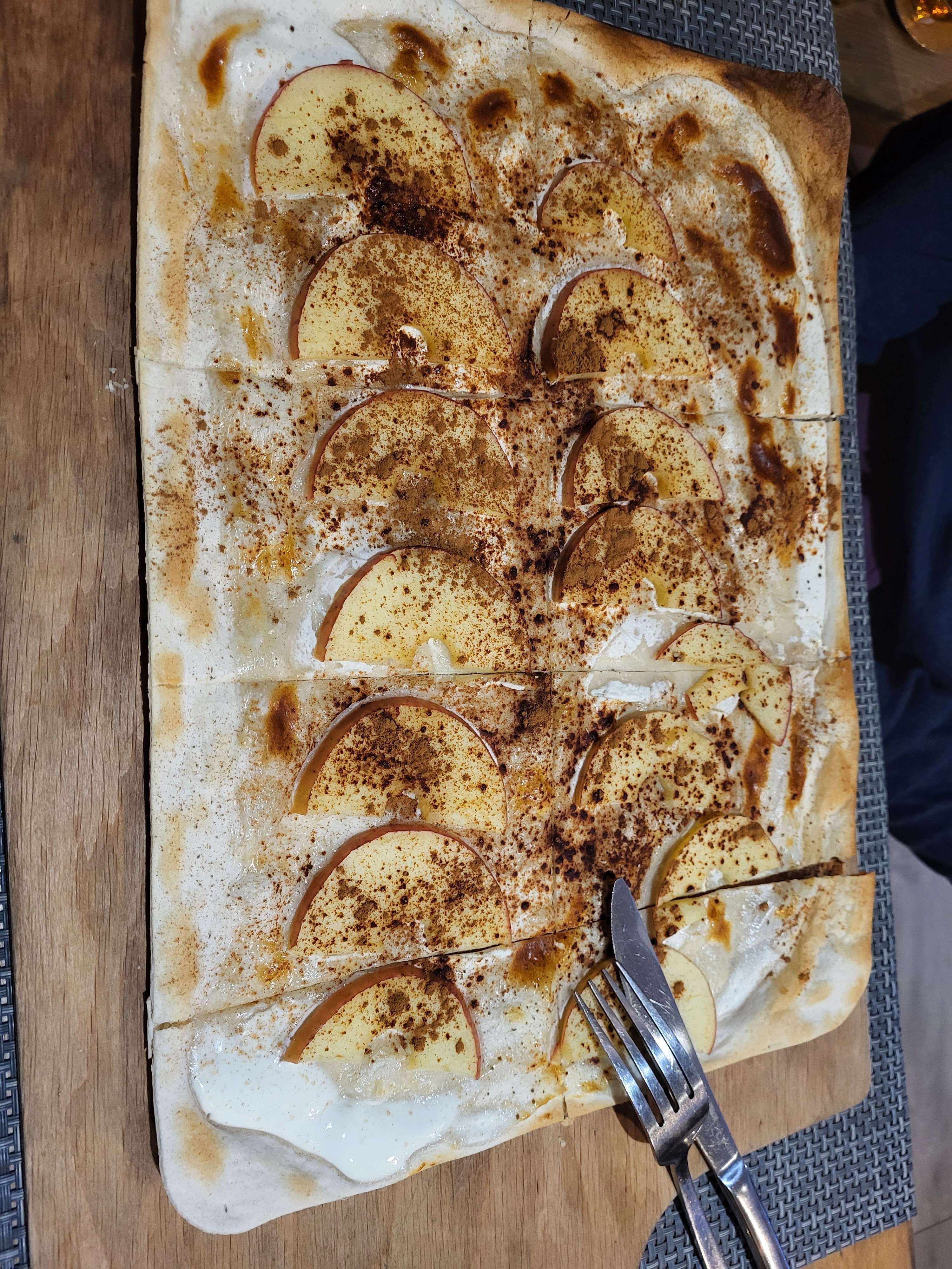 Les Flammenkuchen sont le seul choix et ils étaient bien mais rien de spécial. De plus, chacun comprenait du bacon et un choix de fromages, donc peu de variété. Les prix sont trop élevés pour l'offre, par exemple, nous avons commandé une salade d'accompagnement et même si cela semblait bon marché, il s'agissait littéralement d'une demi-tomate cerise et de 6 petites feuilles de salade. Des ingrédients de bonne qualité cependant. House Wine était au mieux médiocre. Le service était rapide et sympathique ! L'emplacement extérieur sur la terrasse était petit et trop bruyant avec les voitures.