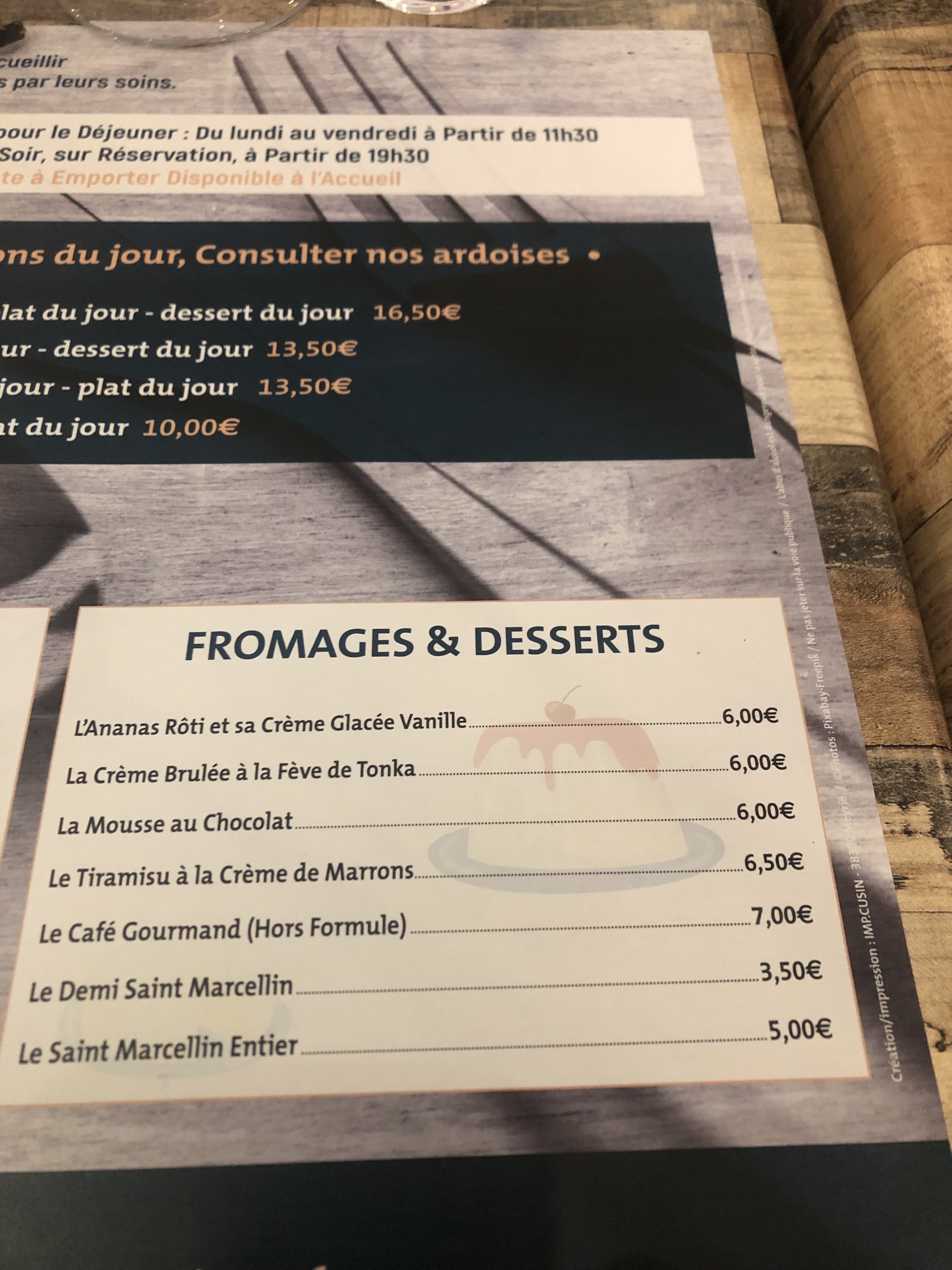 Nous étions 17 convives pour le menu du jour à 17,35€. Les oeufs mimosa étaient en fait des oeufs durs coupés en deux et recouverts de mayonnaise. Pour le plat du jours nous avons choisi 15 colins et 2 volailles. Il n'y avait que 8 parts de poisson,, les autres ont été invités à prendre de la volaille contre leur gré. Parmi les assiettes de poisson, l'une n'avait pas son quartier de citron. Oubli réparé sans problème. Dessert fromage blanc avec crème très bon, ainsi que la Pana cotta. Par contre les demi-St Marcellin faisaient à peine plus d'un centimètre d'épaisseur, blancs, et pas crémeux en surface. Aux 297,5€ des menus furent rajoutés 122,60e pour 16 kirs, 4 pichets rouge et rosé et 9 cafés.