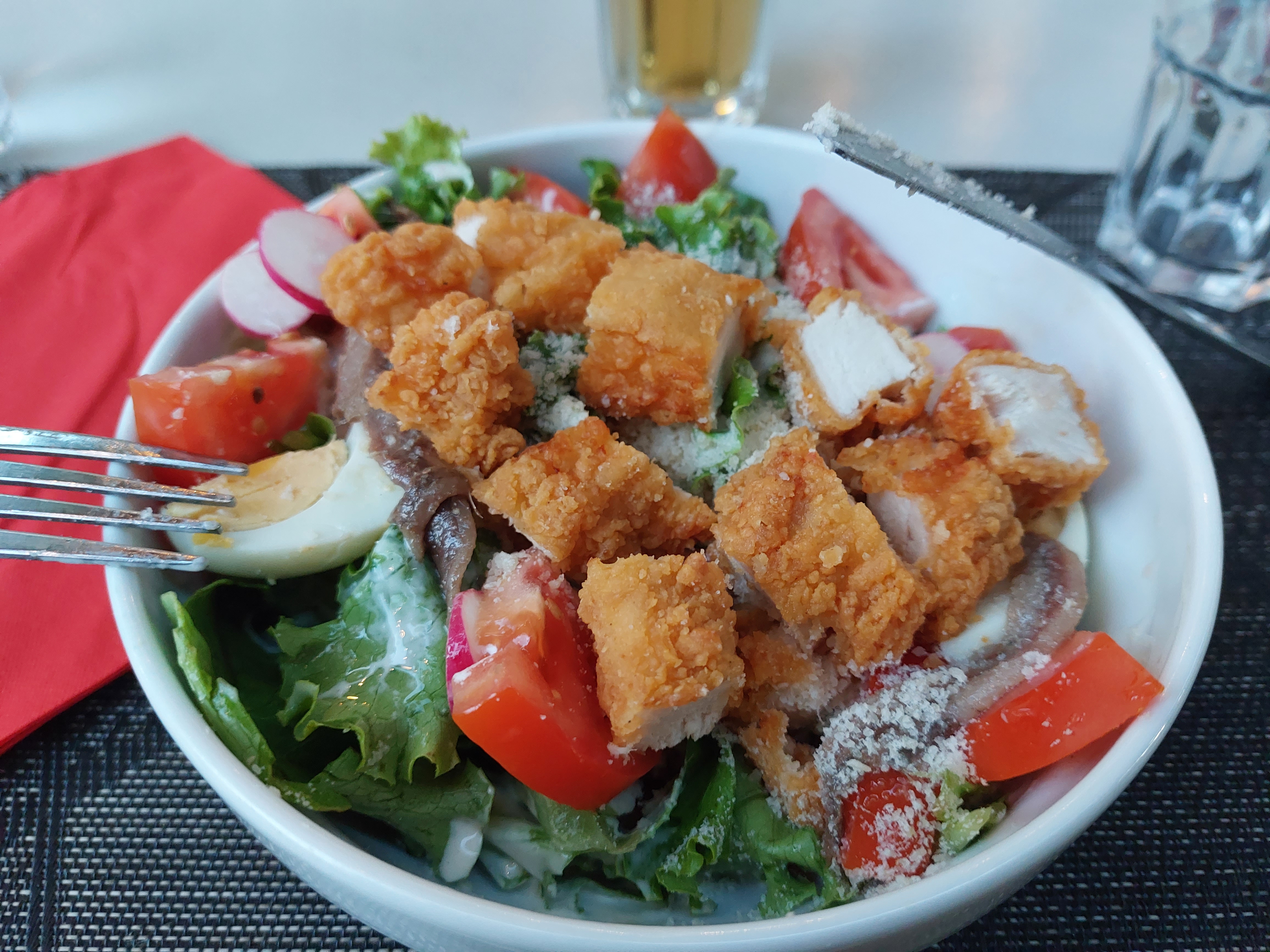 J'ai pris une salade césar, je pense que chez macdo les salades sont meilleures. La présentation laisse vraiment à désirer, j'ai eu des sardines aussi ds la césar et de la sauce a volonté. Bref a fuir